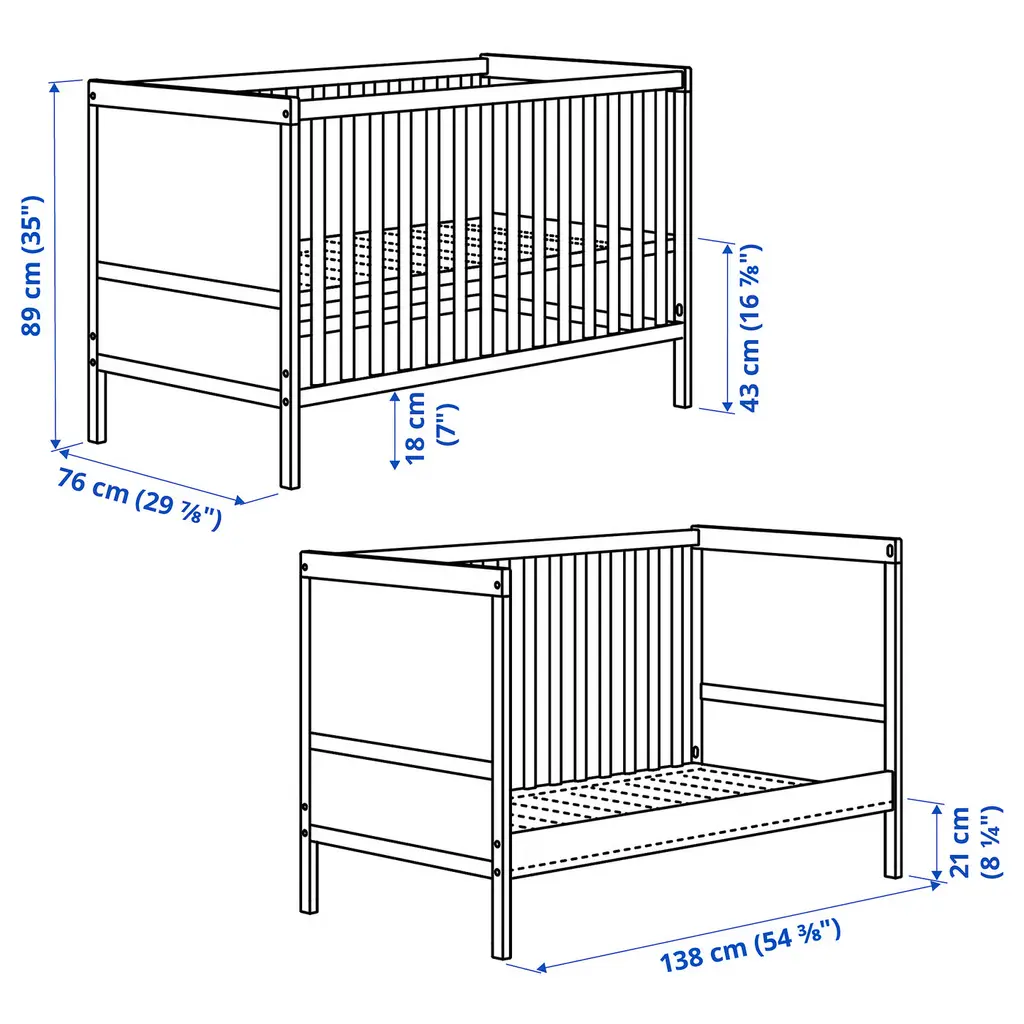 SUNDVIK Crib - gray 27 1/2x52 ". The bed base can be placed at two different heights. One crib side can be removed when the child is big enough to climb into/out of the crib. The crib base is well ventilated for good air circulation which gives your child a pleasant sleeping climate.
