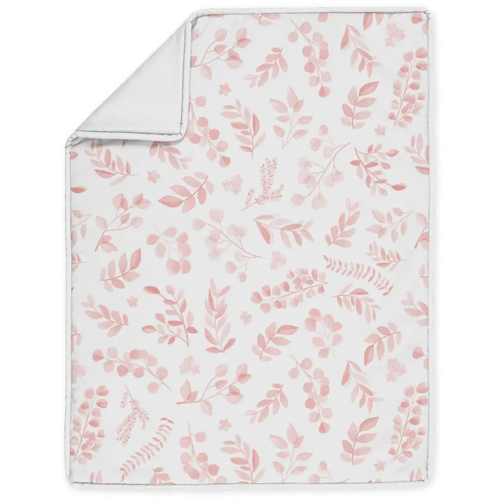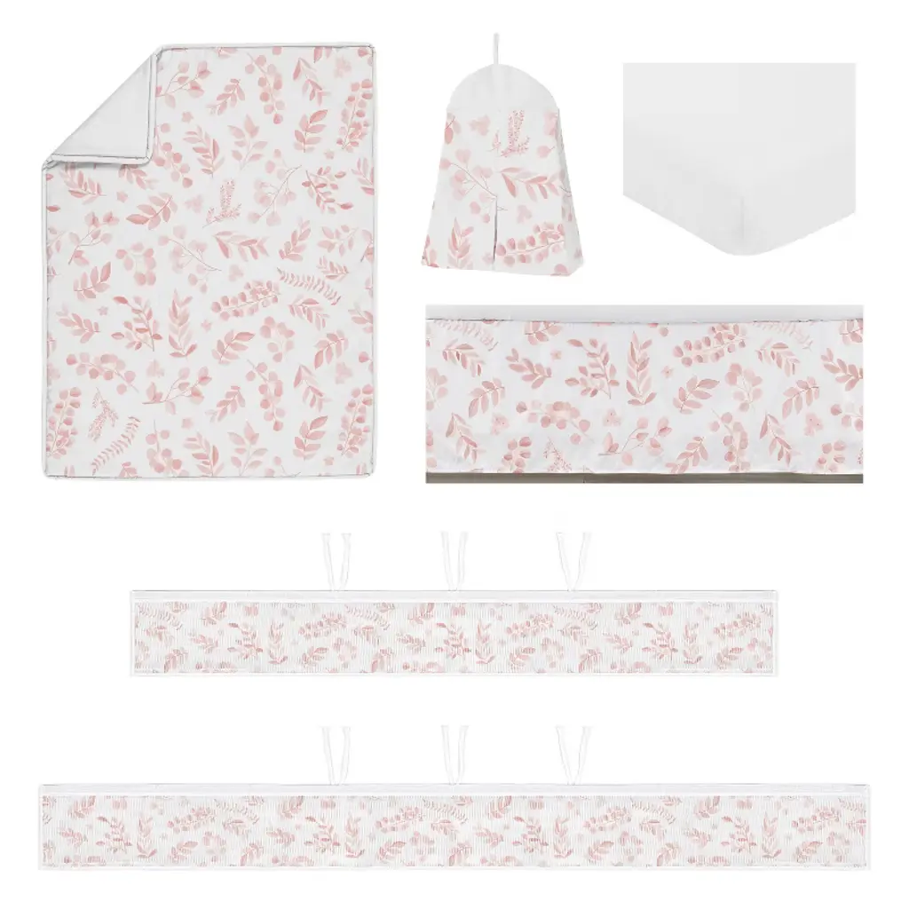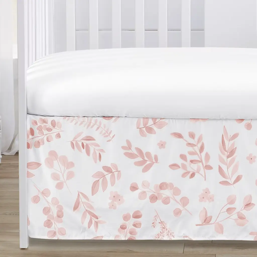 Botanical Blush Pink Collection Crib Bedding Set has all that your little bundle of joy will need. Let the little one in your home settle down to sleep in this incredible nursery set. This set includes the Sweet Jojo Designs + BreathableBaby Mesh Crib Liner to help prevent baby’s arms and legs from getting caught in between slats to enjoy a safe and secure sleep. This wonderful set will fit most standard cribs. Crib set includes: Crib Comforter, Fitted Sheet, Crib Skirt (Dust Ruffle), BreathableBaby mesh crib liner (2 piece set), and Diaper Stacker. Sweet Jojo Designs creates various coordinating room accessories and decor for all of their children's bedding and nursery bedding set collections (These items not included). This set boasts a blush pink and white botanical boho chic watercolor bohemian woodland floral leaf flower print and solid white fabric.