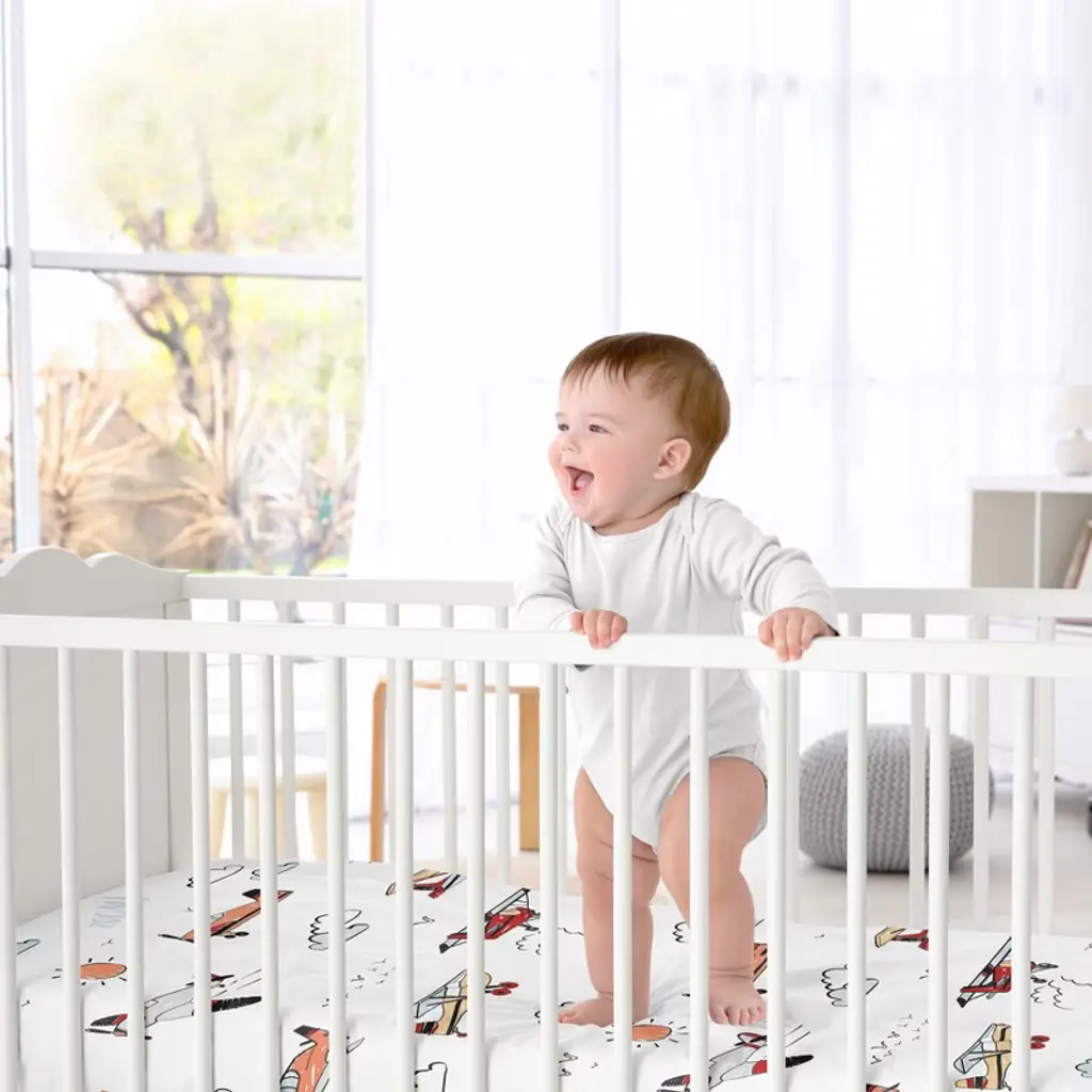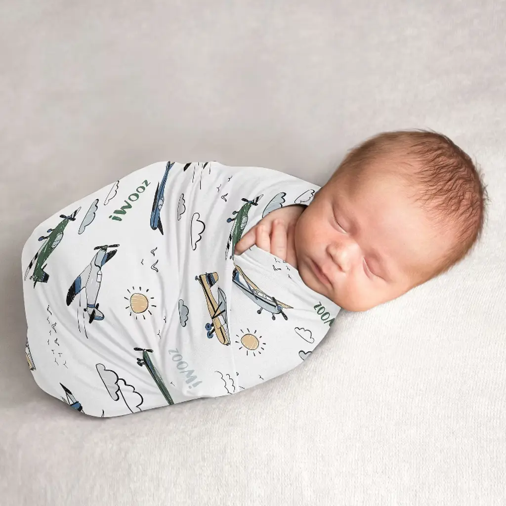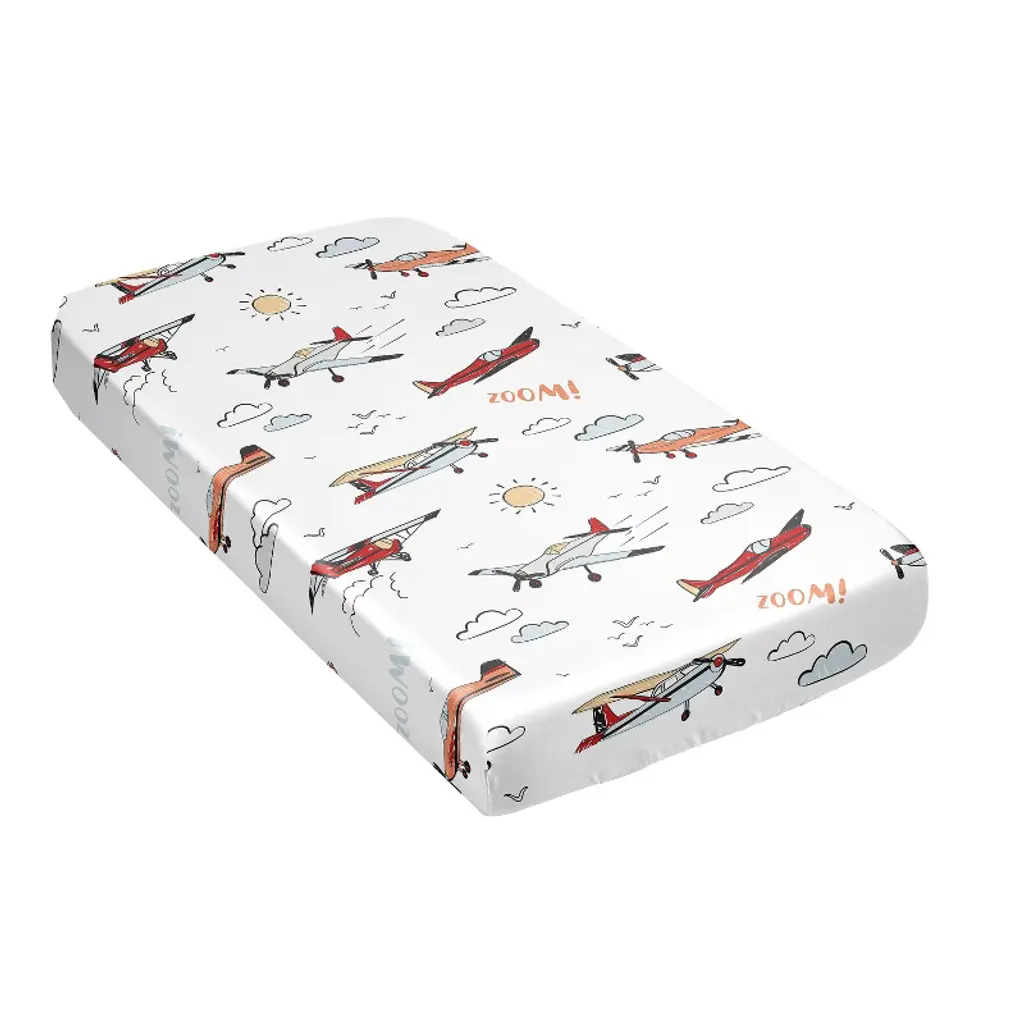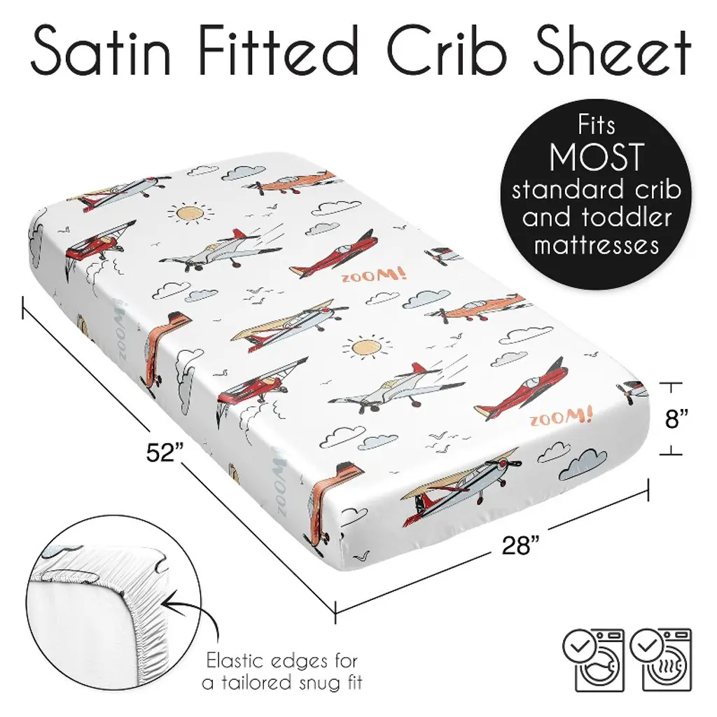 Airplane Red and Blue Collection Sweet Jojo Designs satin fitted crib sheets combines the benefits of cozy soft fabrics with stylish designs to help create the ideal sleeping environment for your little one in their nursery and become your next newborn essential. Baby bad hair days are a thing of the past! Use a delicate satin crib sheet to help prevent cradle cap, baby hair loss and bald spots while also helping to reduce frizzy locks and knots. This silky smooth fabric is designed to absorb baby’s natural oils to help ensure fresh glowing skin and hair for your bundle of joy while also being gentle on sensitive skin. Each crib sheet is made with a fully elastic bottom for a more secure fit on most standard size cribs. Pair your crib baby satin sheet with your favorite Sweet Jojo Designs crib bedding sets, receiving security blankets, changing pad covers and other baby room decor accessories (These items not included). This satin crib fitted sheet features an exclusive design of a grey, yellow, orange, gray, red white and blue vintage airplanes transportation air plane clouds sun sky aviator aviation airplane print.