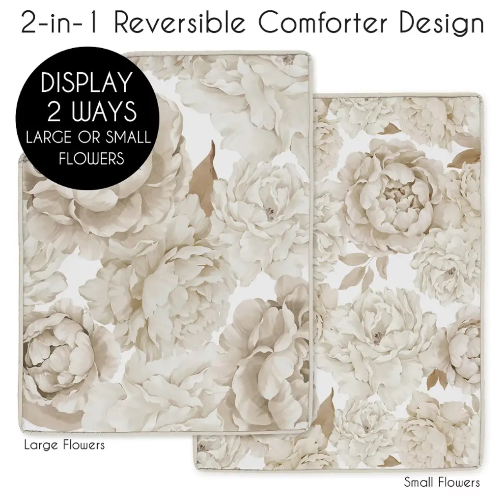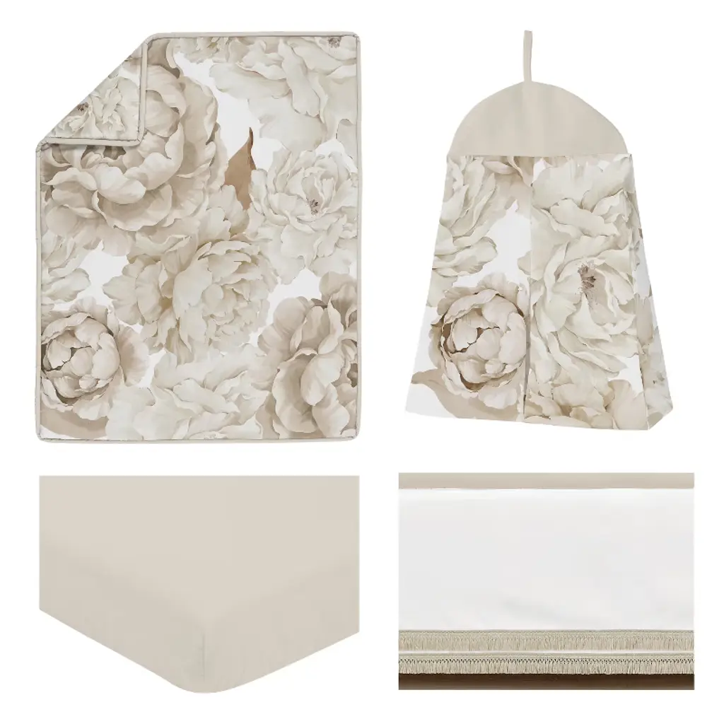 Peony Floral Garden Taupe and Ivory Collection Crib Bedding Set has all that your little bundle of joy will need. Let the little one in your home settle down to sleep in this incredible nursery set. This wonderful set will fit most standard cribs. Crib set includes: Crib Comforter, Fitted Sheet, Crib Skirt (Dust Ruffle), and Diaper Stacker. Sweet Jojo Designs creates various coordinating room accessories and decor for all of their children's bedding and nursery bedding set collections (These items not included). This baby bedding set boasts shades of taupe, beige, tan, ivory, off white and cream boho shabby chic floral vintage nature garden bohemian watercolor elegant flowers.