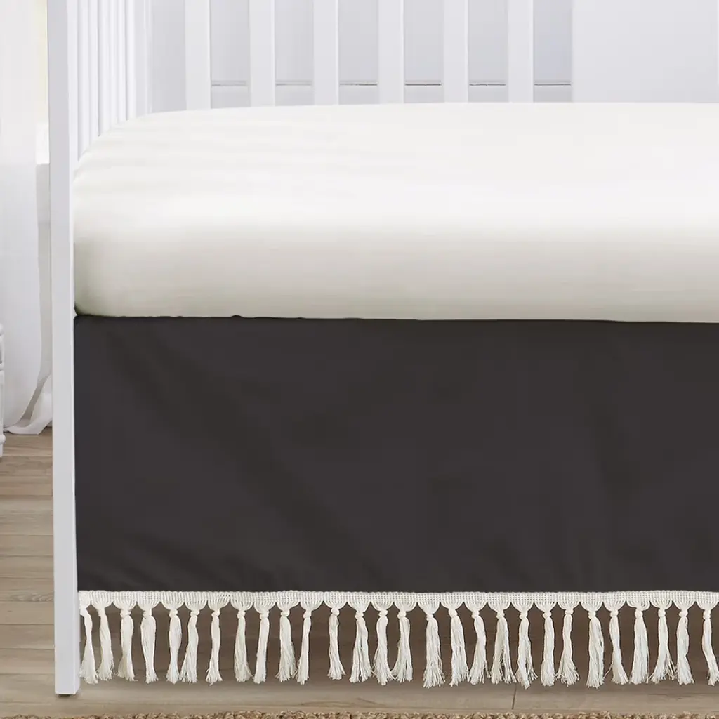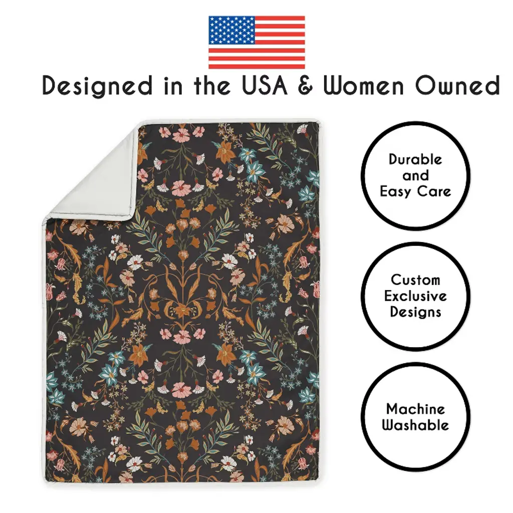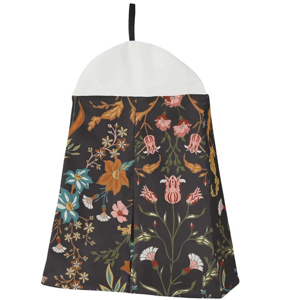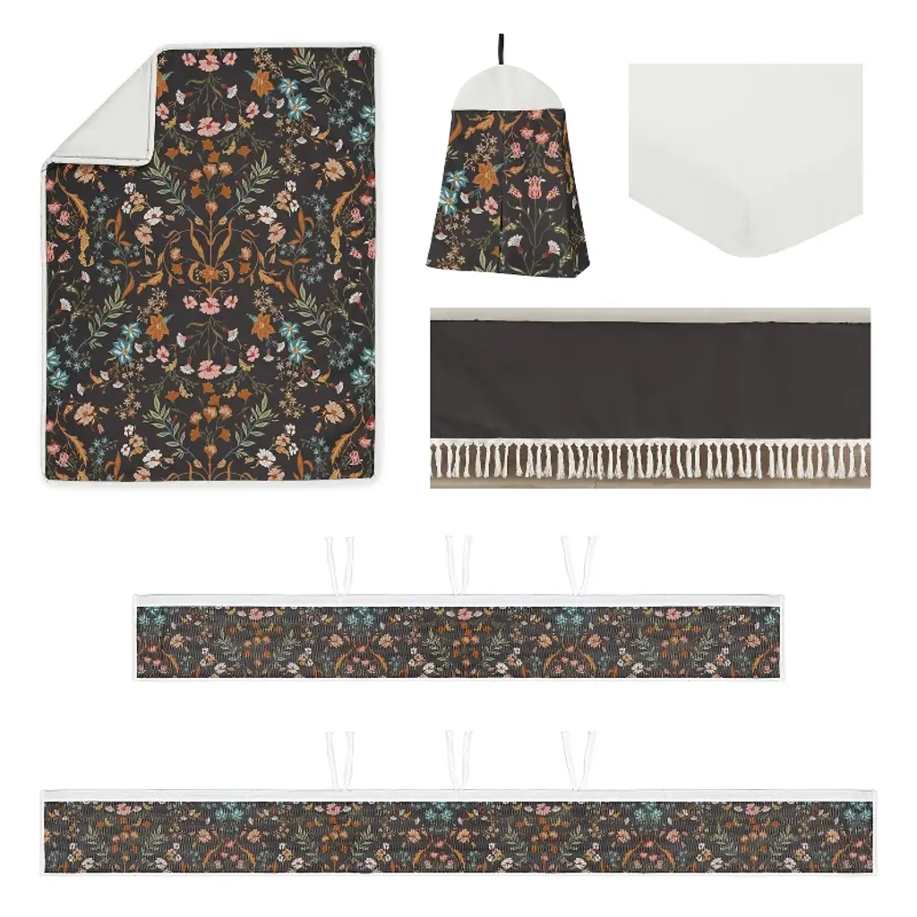 Boho Floral Wildflower Black and Orange Collection Crib Bedding Set has all that your little bundle of joy will need. Let the little one in your home settle down to sleep in this incredible nursery set. This set includes the Sweet Jojo Designs + BreathableBaby Mesh Crib Liner to help prevent baby’s arms and legs from getting caught in between slats to enjoy a safe and secure sleep. This wonderful set will fit most standard cribs. Crib set includes: Crib Comforter, Fitted Sheet, Crib Skirt (Dust Ruffle), BreathableBaby mesh crib liner (2 piece set), and Diaper Stacker. Sweet Jojo Designs creates various coordinating room accessories and decor for all of their children's bedding and nursery bedding set collections (These items not included). This set boasts a black, rust orange, teal blue, turquoise, green, yellow and pink paisley bohemian farmhouse wildflower vintage florals and boho cottagecore indie rustic design, featuring a detailed botanical daisy leaf leaves flower floral garden pattern.