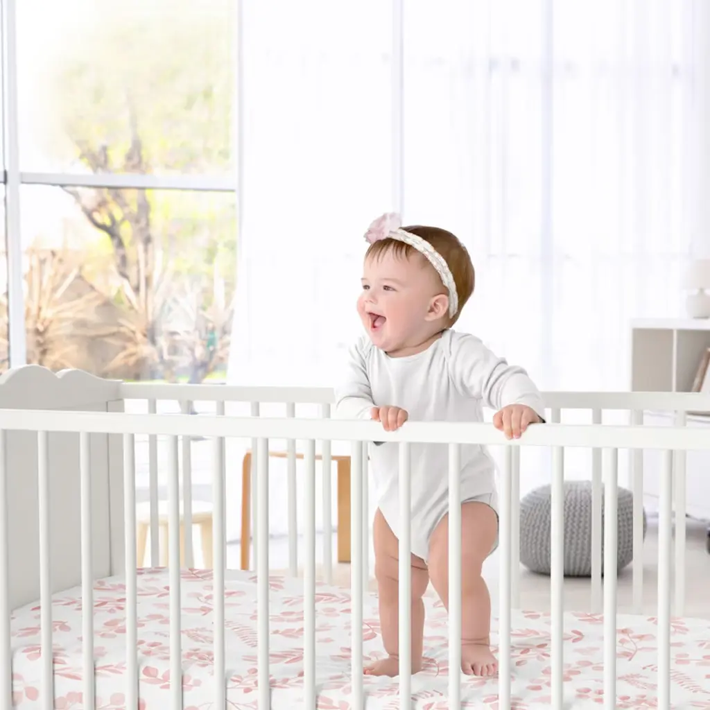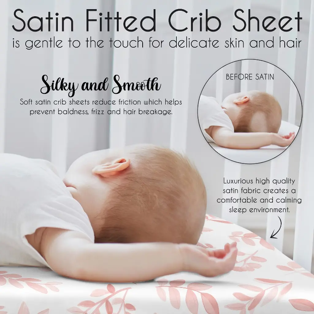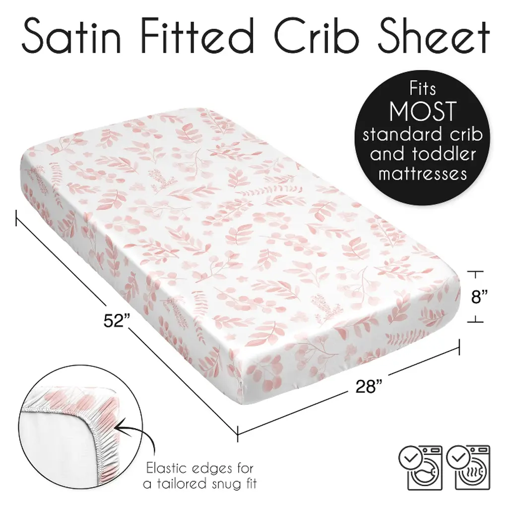 Botanical Blush Pink Collection Sweet Jojo Designs satin fitted crib sheets combines the benefits of cozy soft fabrics with stylish designs to help create the ideal sleeping environment for your little one in their nursery and become your next newborn essential. Baby bad hair days are a thing of the past! Use a delicate satin crib sheet to help prevent cradle cap, baby hair loss and bald spots while also helping to reduce frizzy locks and knots. This silky smooth fabric is designed to absorb baby’s natural oils to help ensure fresh glowing skin and hair for your bundle of joy while also being gentle on sensitive skin. Each crib sheet is made with a fully elastic bottom for a more secure fit on most standard size cribs. Pair your crib baby satin sheet with your favorite Sweet Jojo Designs crib bedding sets, receiving security blankets, changing pad covers and other baby room decor accessories (These items not included). This satin crib fitted sheet features an exclusive design of a blush pink and white botanical boho chic watercolor bohemian woodland floral leaf flower print.
