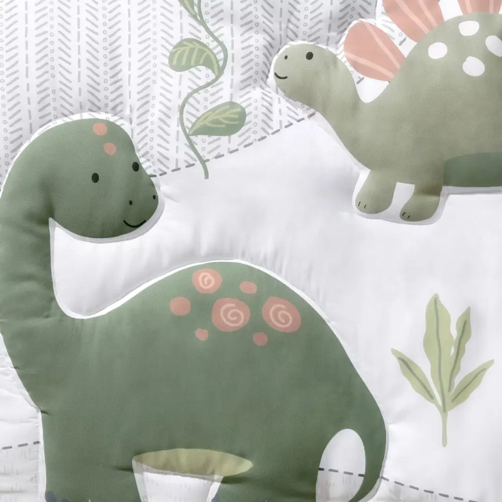 Create a prehistoric paradise with the Dinosaur Dreams 3-Piece Bedding Set from The Peanutshell. This collection showcases playful dino pals in a lush landscape of green, gray, and earthy brown tones. The set includes a fitted crib sheet with durable elastic, a cozy 32" x 41" quilt, and a coordinating printed bed skirt. Tumble dry on low heat to maintain the vibrant colors and softness. Pair it with our dinosaur musical mobile and other Peanutshell items for the complete look.
