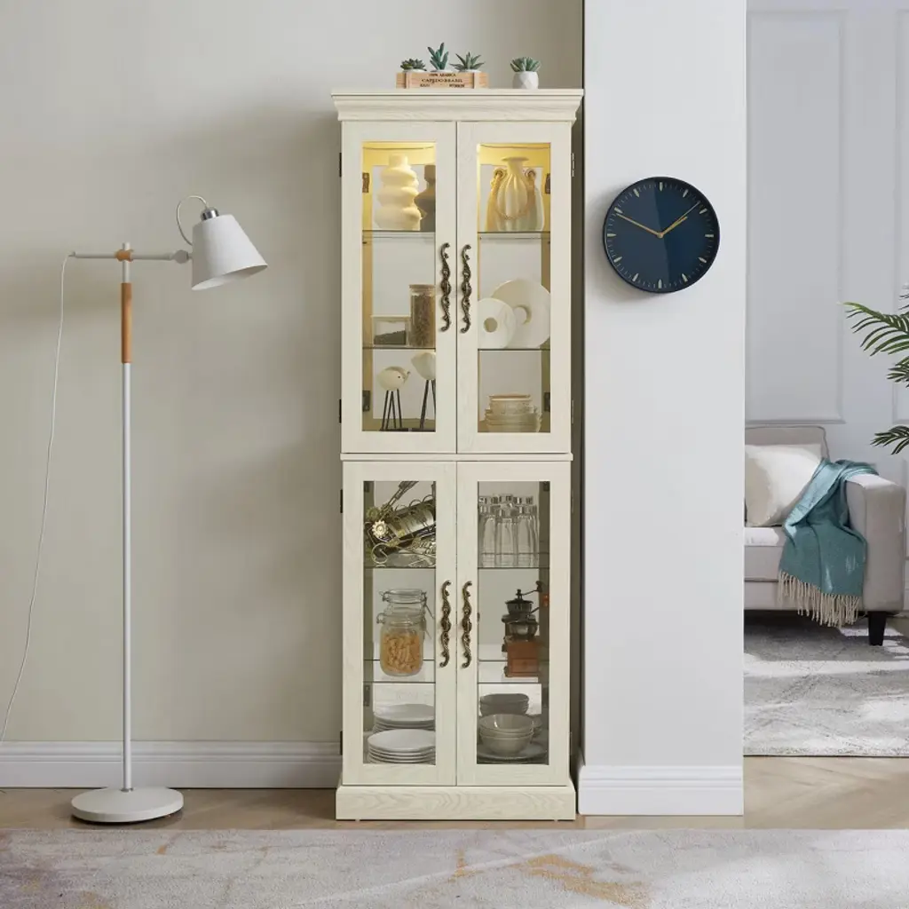 Elevate your home décor with this exquisitely crafted lighted display cabinet, designed to showcase your most treasured collectibles, fine china, or wine collection in a museum-worthy presentation. The antique white MDF frame exudes timeless elegance, while the integrated lighting system casts a warm, enchanting glow that highlights every detail of your displayed items. Standing at 71.26 inches tall, this six-tier cabinet offers ample vertical space for arranging heirlooms, books, or decorative pieces, with adjustable shelves that adapt to items of varying heights—from delicate figurines to tall wine bottles. The glass-paneled doors provide 360-degree visibility while protecting against dust, and the movable partitions allow for creative, ever-evolving displays. Practical yet luxurious, this cabinet fits seamlessly in living rooms, kitchens, or dining areas, blending classic charm with modern functionality. Assembly Note: For optimal clarity, remove the protective film from the glass backpanel before installation.
