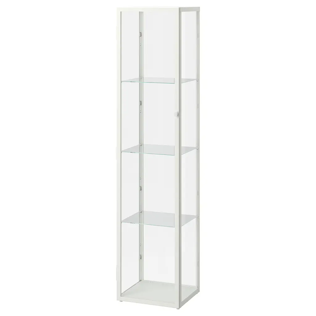 BLÅLIDEN / STRIMSÄV Glass-door cabinet with lighting - white. With a glass-door cabinet, you can show off as well as protect your glassware or your favorite collection. The LED light source consumes up to 85% less energy and lasts 20 times longer than incandescent bulbs.