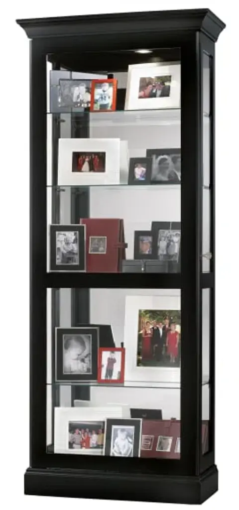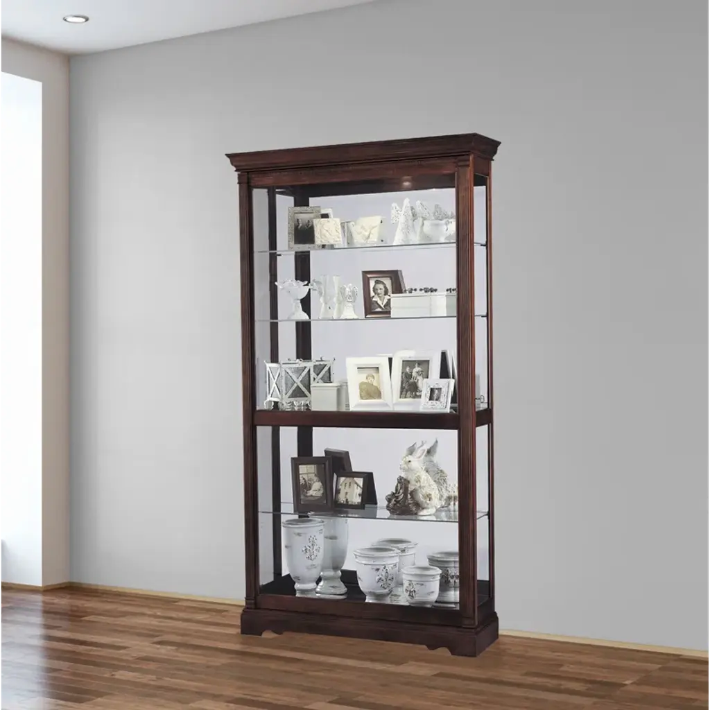 Select hardwoods and veneers locking the front door, with beveled glass slides in both directions for convenient access to the shelves. Two incandescent lights provided to illuminate your collectibles. No-reach roller light switch for interior lights is conveniently located on the back of the cabinet. A handy key holder is attached. A glass mirrored back enhances the view. Five adjustable glass shelves for six levels of display, with continuous holes for shelf adjustment. Plate grooves allow for vertical display of plates. Pad-lock cushioned metal shelf clips increase stability and safety. Adjustable levelers under each corner provide stability on uneven and carpeted floors.