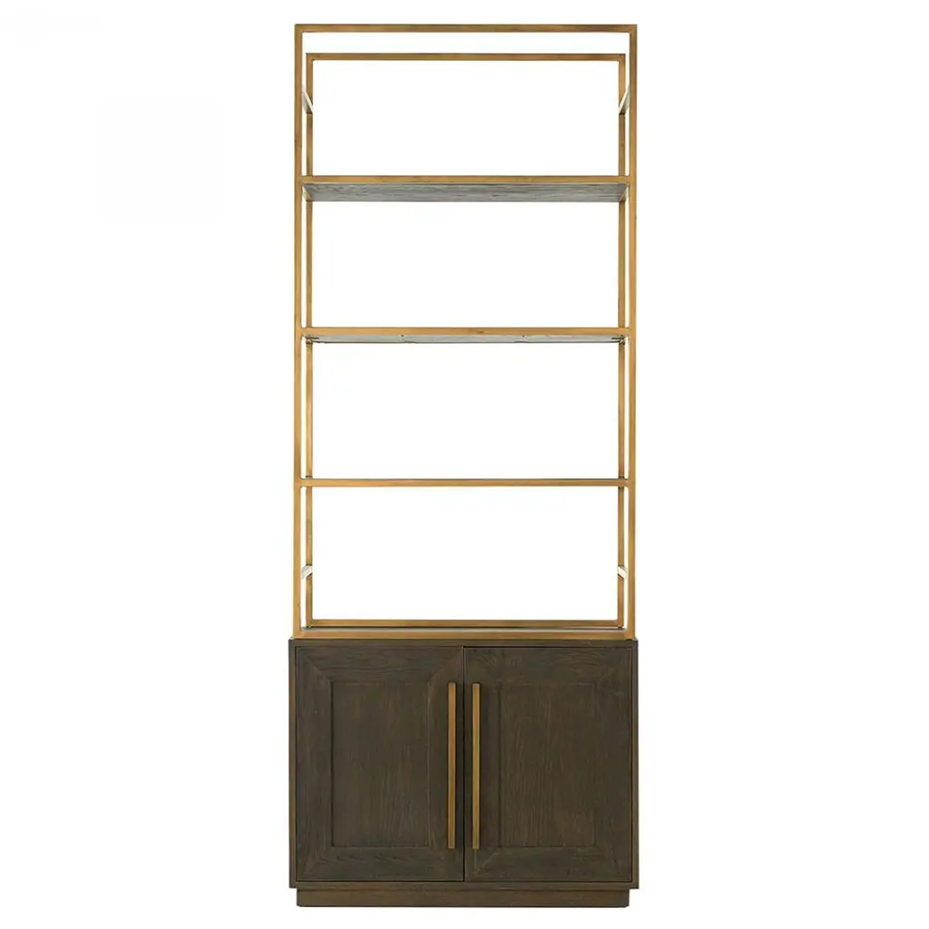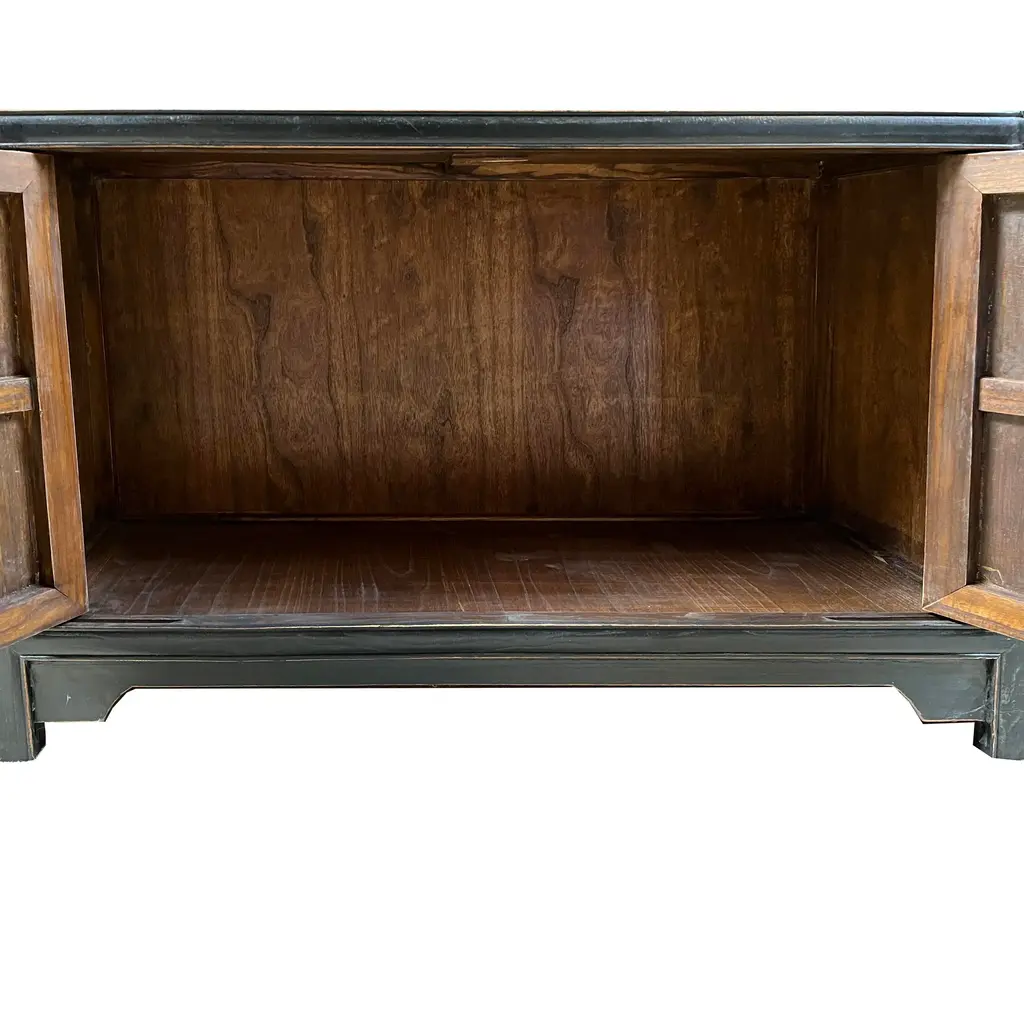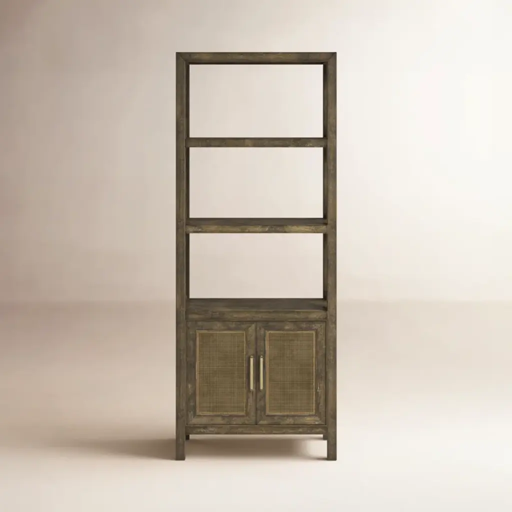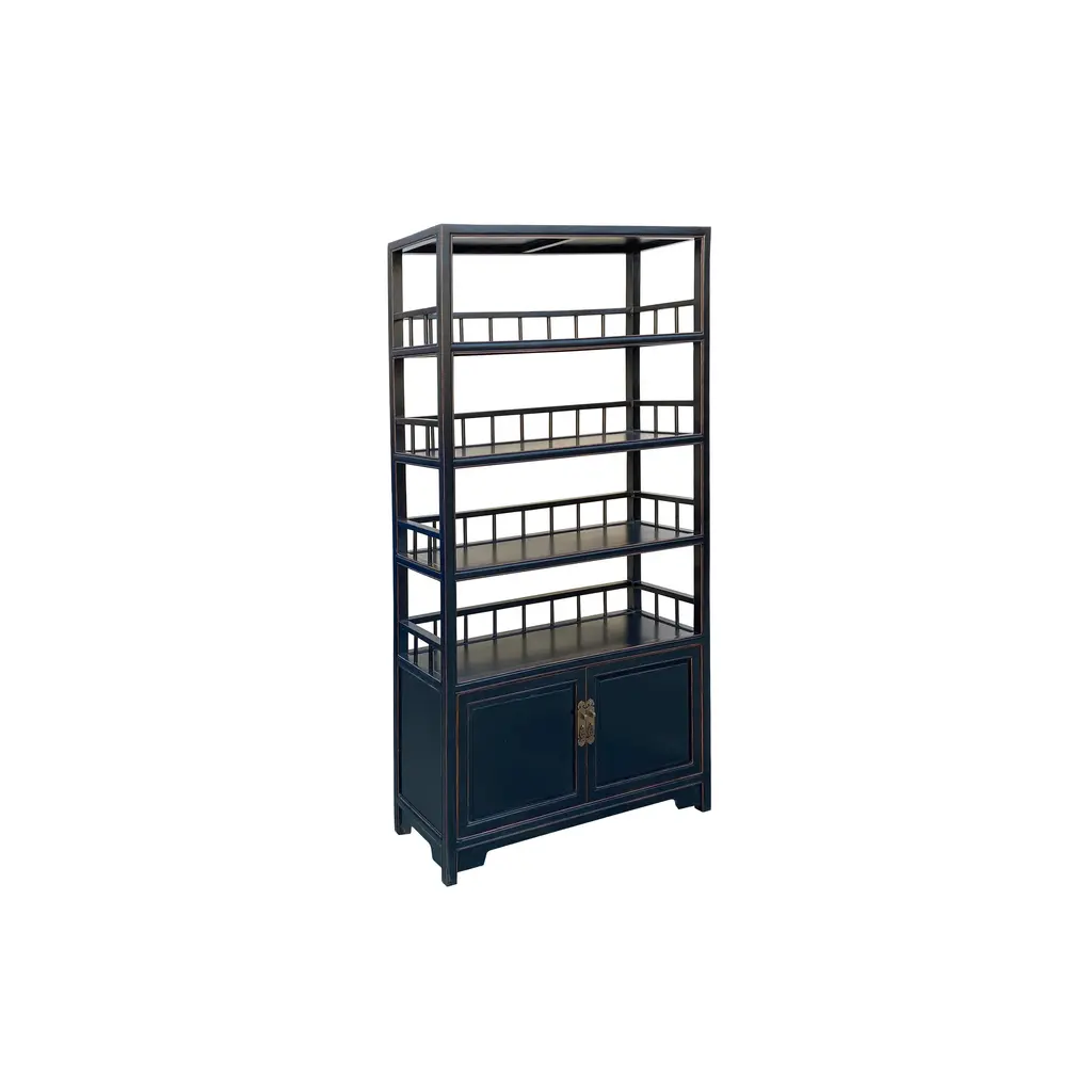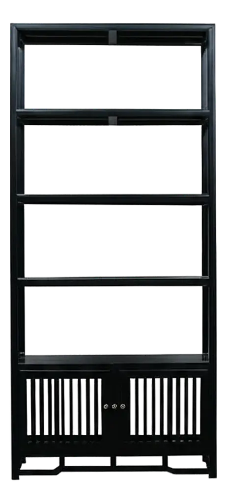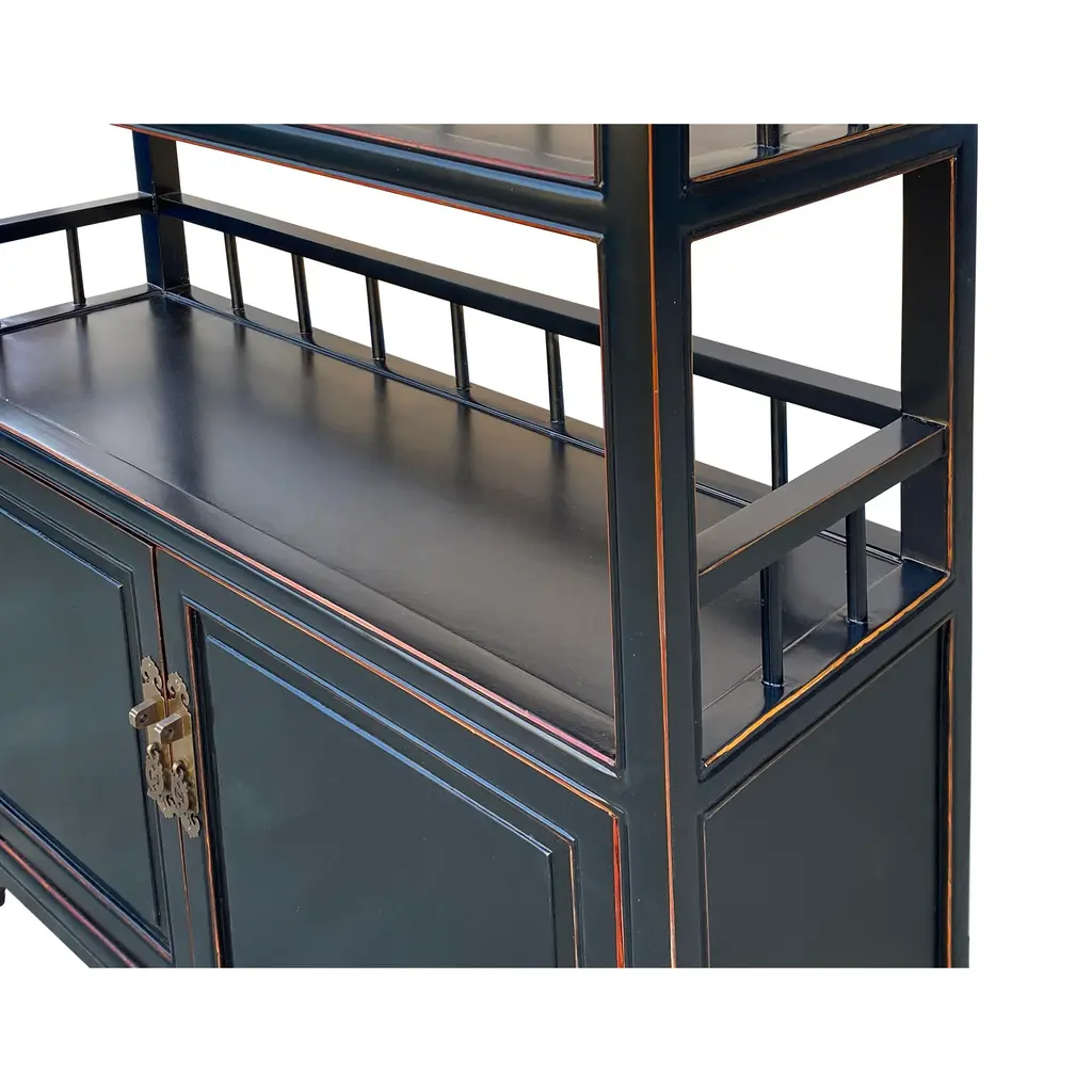This sleek, sophisticated display cabinet exudes understated elegance with its matte black finish, adding a touch of modern flair to any space. Standing tall and proud, it serves as a versatile piece, seamlessly blending functionality with style. At first glance, the cabinet's minimalist design draws the eye, commanding attention without overpowering its surroundings. Its compact size makes it perfect for smaller rooms or cozy corners, yet it offers ample storage and display options. The three shelves, each meticulously crafted, feature a subtle yet striking bars pattern accent back. This intricate detail adds visual interest while providing a secure backdrop for showcasing your most treasured possessions. Whether it's prized collectibles, cherished books, or decorative items, these shelves offer a stage for your belongings to shine. Beneath the display area lies a concealed storage compartment, tucked away behind closed doors. This bottom section offers a discreet solution for stowing away items that you may not want on immediate display, maintaining a clutter-free appearance while keeping essentials within easy reach. With its clean lines, versatile design, and practical storage solutions, this minor matte black display cabinet bookcase curio cabinet effortlessly combines form and function, making it a timeless addition to any home or office space. Dimensions: w38.75" x d13.75" x h77", shelf w35" x d11"x h11.75" Origin: China Material: Elm Wood Condition: Hand-made, wood joint lines, rough wood grain pattern Work: ship in one piece