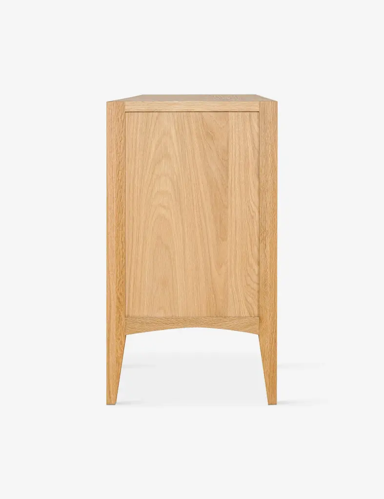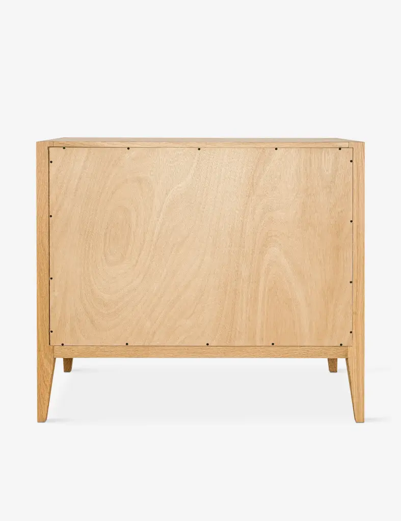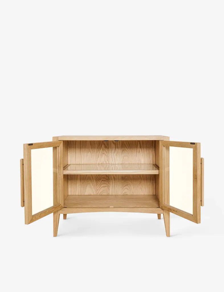 A timeless cabinet with a solid oak frame and natural cane shelving that offers a warm, modern tone to your living room or entryway. This small cabinet provides the perfect touch of storage for small-space style with glass panel doors for display.