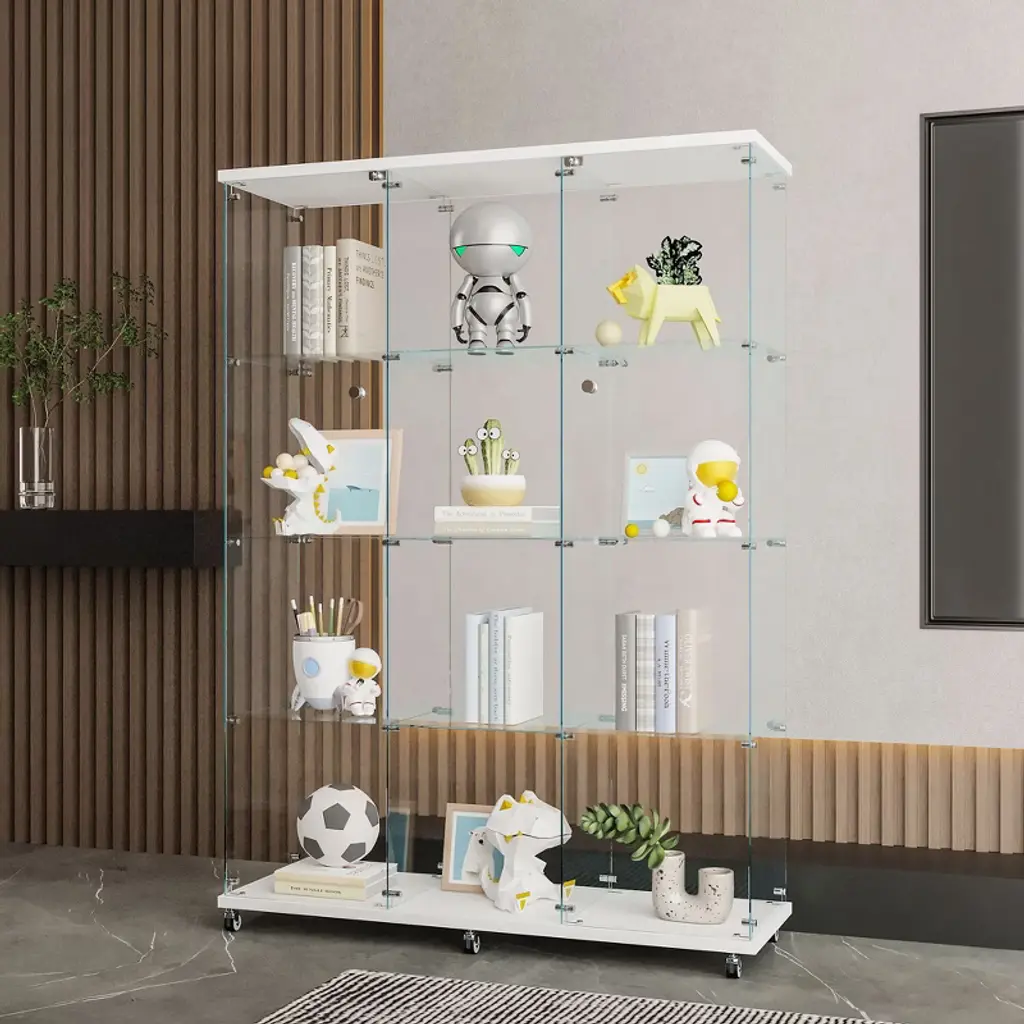 Boasting an extra-large design, this black floor-standing glass display cabinet with four shelves is a statement piece for any living room, bedroom, or office. The curio cabinet is crafted for quick and hassle-free installation, offering a sophisticated touch to your space. With its transparent glass panels, it elegantly showcases your valuables while the robust build ensures long-lasting use. This expansive glass bookshelf not only provides generous storage but also enhances the aesthetic of your environment with its sleek and modern profile.