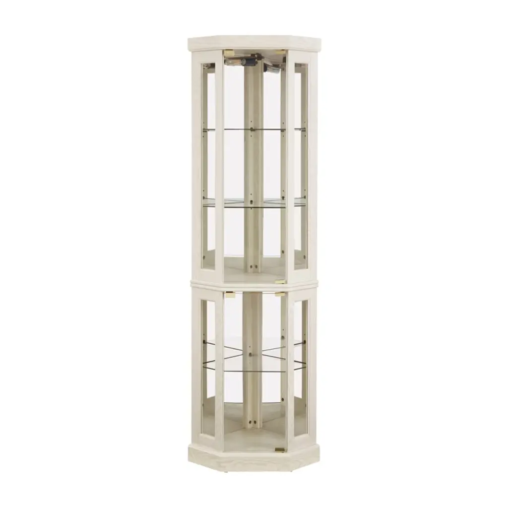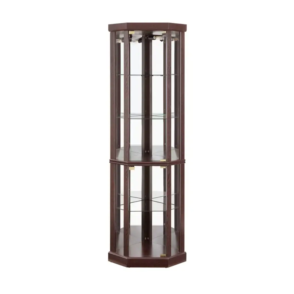 This corner curio cabinet provides a spacious, customizable display with adjustable shelves and mirrored back panels to boost visual appeal. It has secure glass doors with magnetic catches and an elegant design, fitting well in living rooms or bars to combine decorative charm with functional storage for showcasing collectibles.