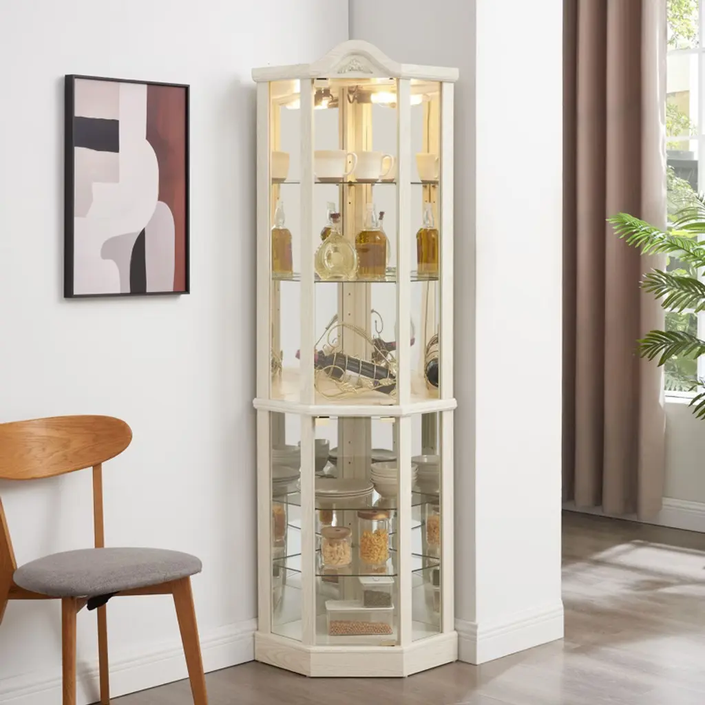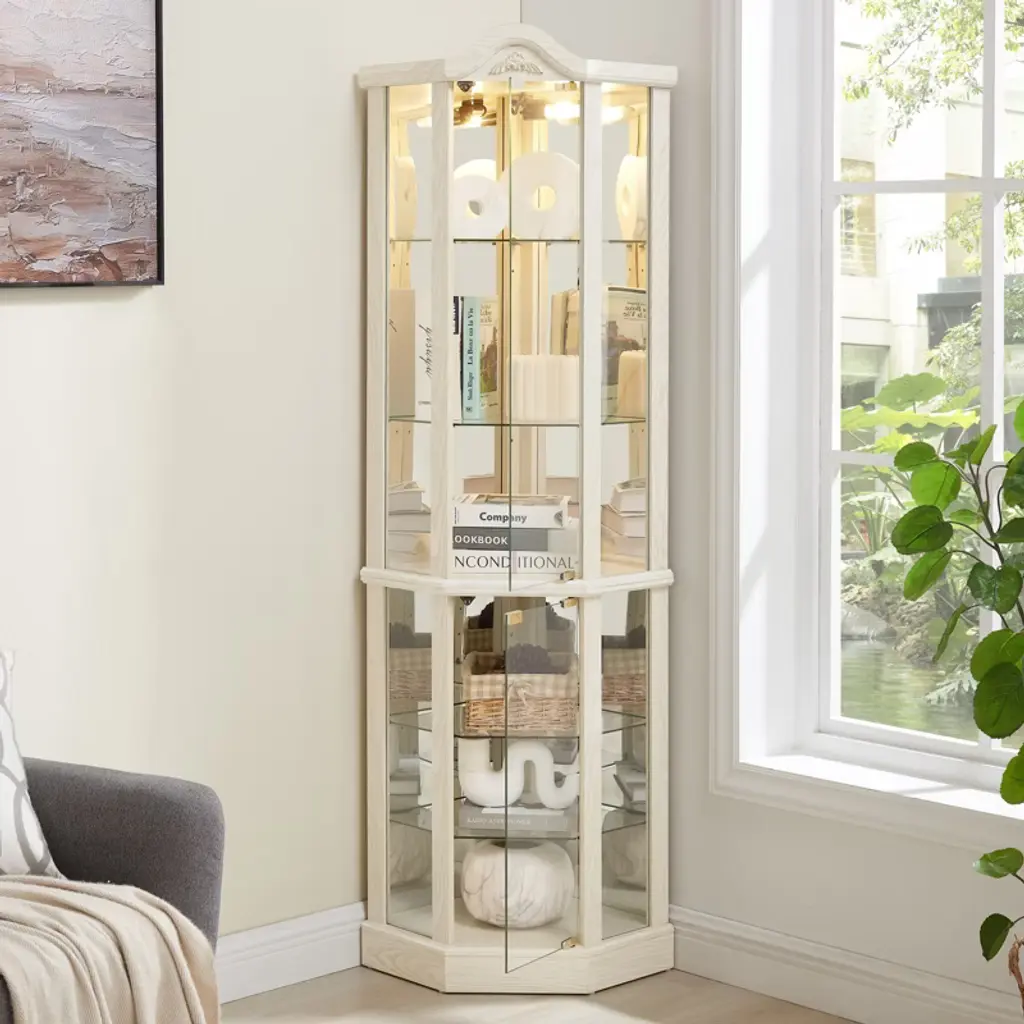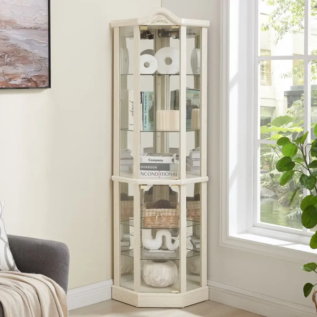 This corner curio cabinet blends timeless charm with modern functionality via glass doors and a push - to - open design. It fits in empty corners, has 4 adjustable glass shelves for versatile displays of collectibles, books, wine, etc., and offers quick, easy assembly—ideal for adding style and practicality to home or office decor.