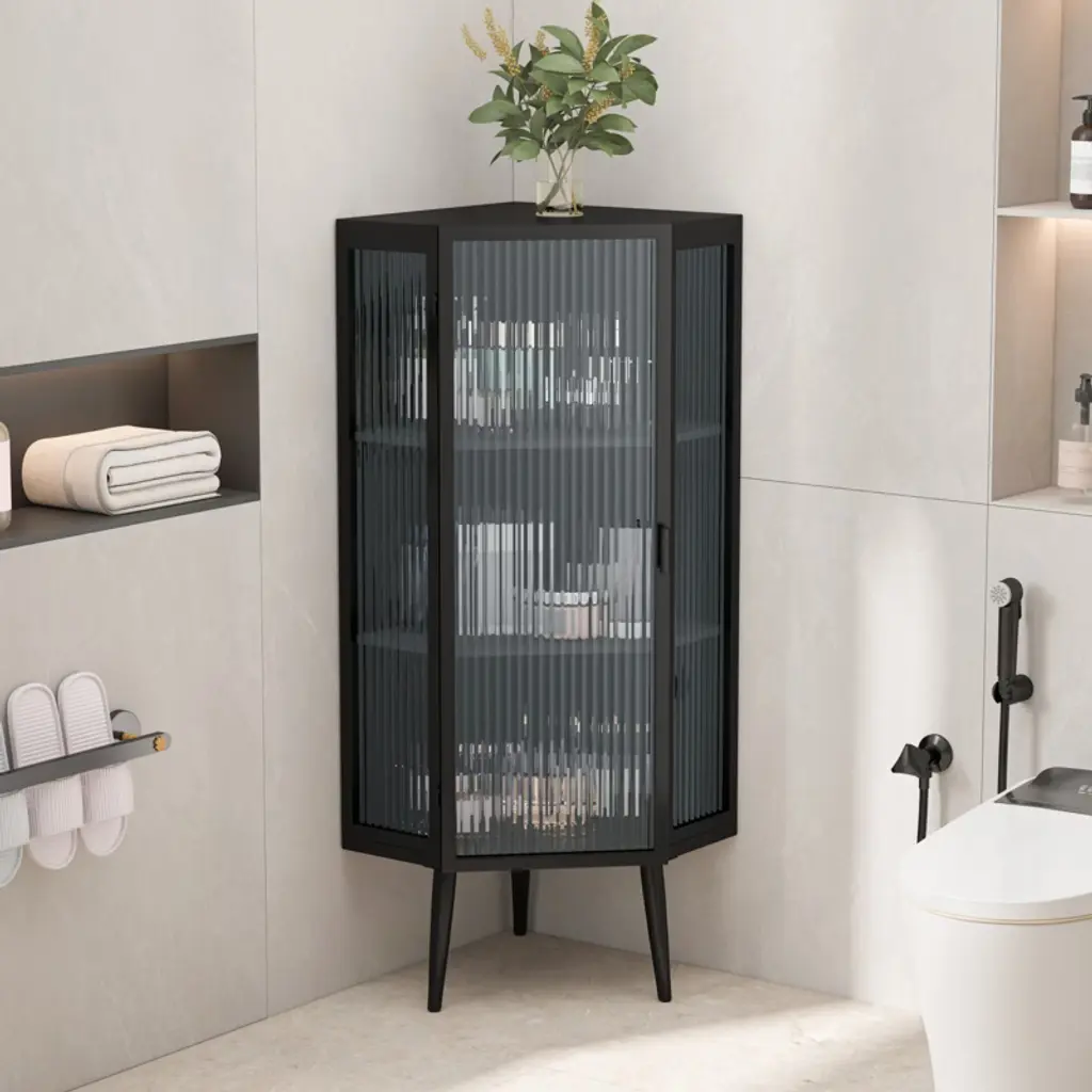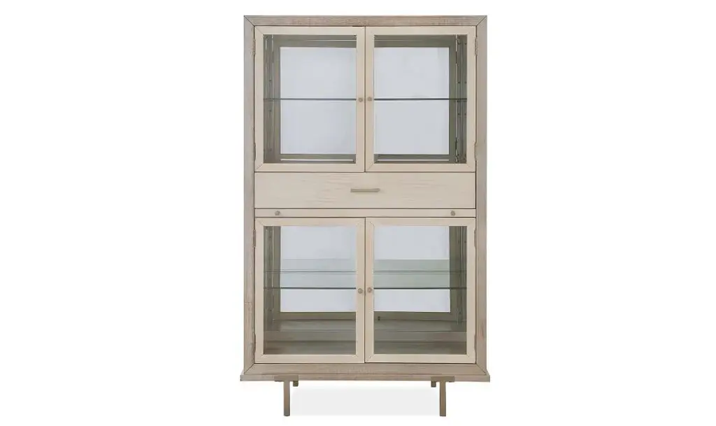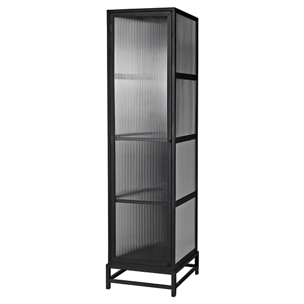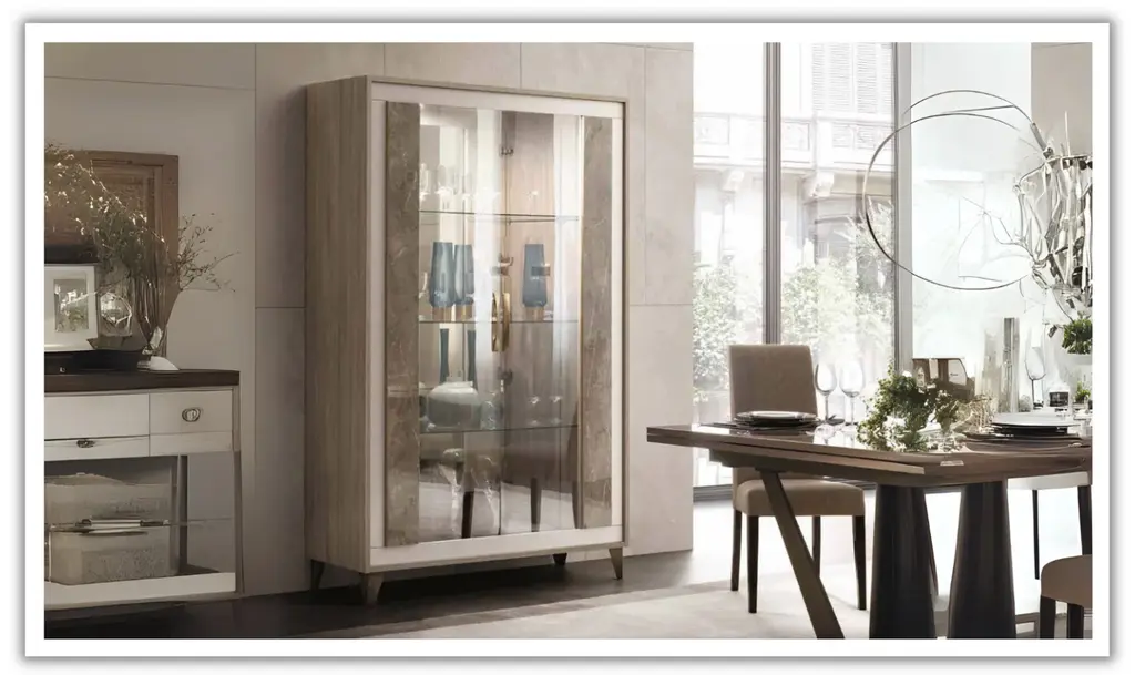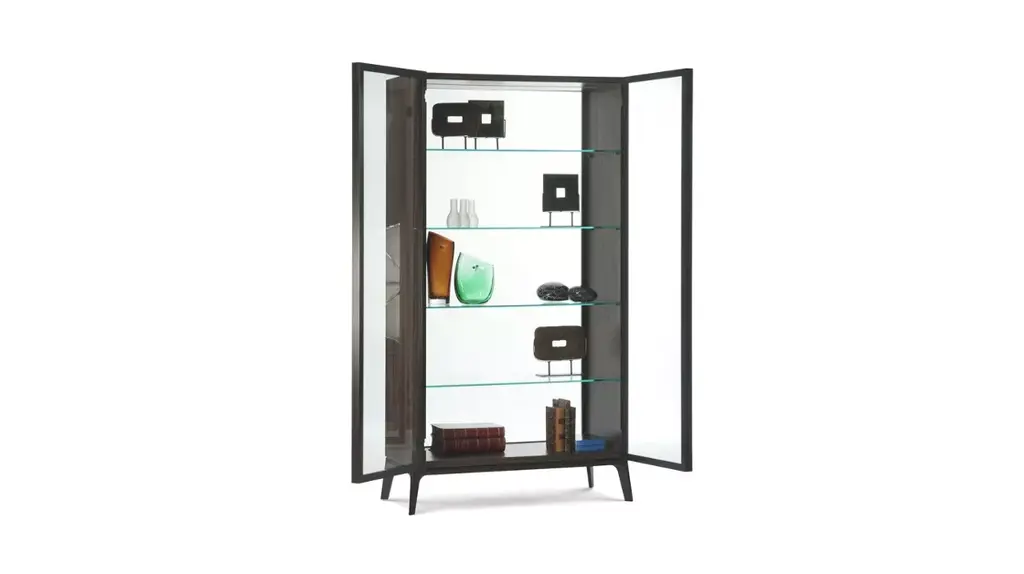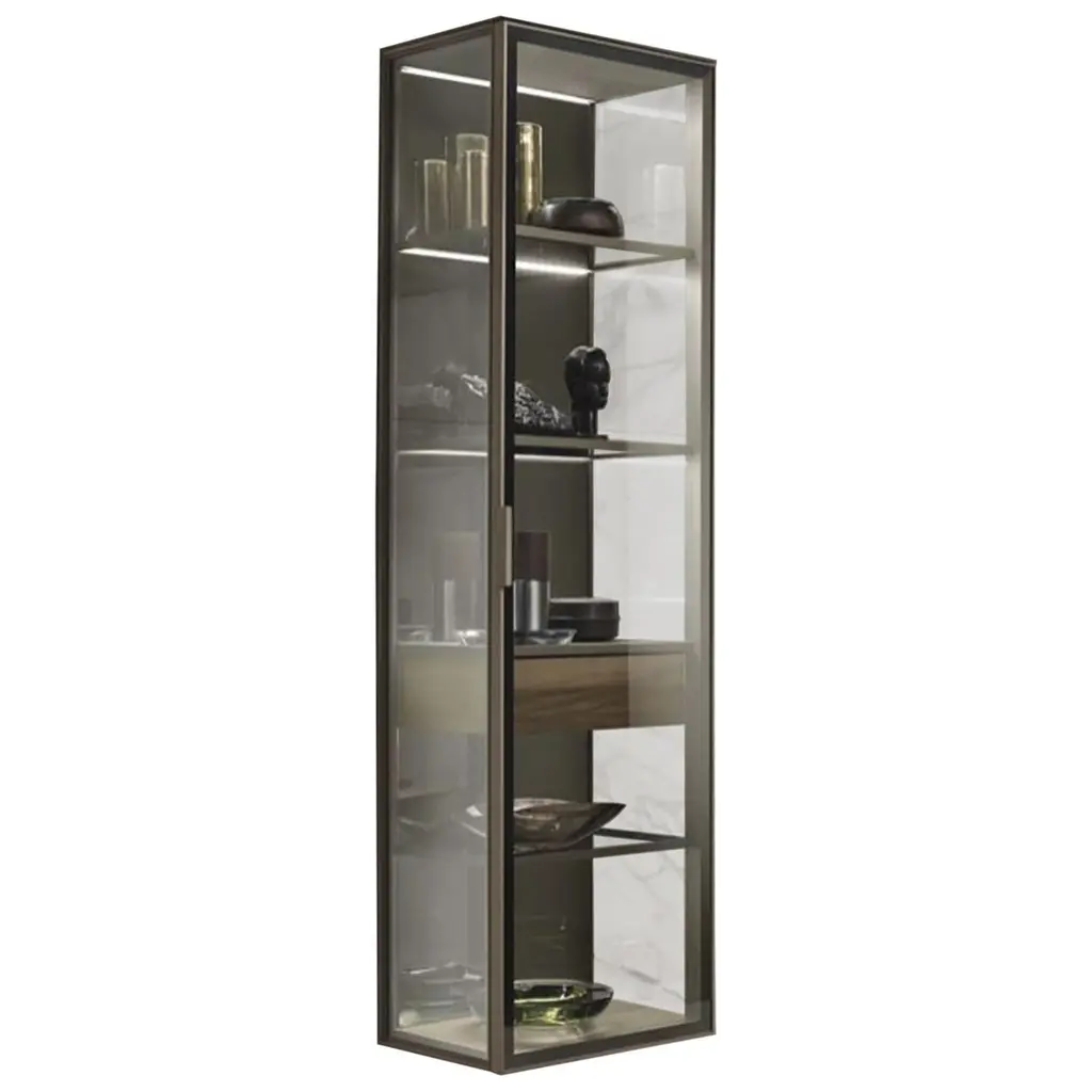 Double-sided display in engineered composite wood with melamine finish (7 stains available) or lacquer finish (37 colours available) or Alpi finish (5 stains available), 2 doors in extra clear glass on aluminium chassis with Bronze lacquer finish. Interior with 4 shelves and bottom in 8mm-thick clear glass. Legs in cast aluminium with Bronze lacquer finish. Manufactured in Europe.