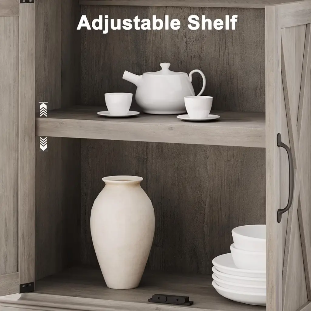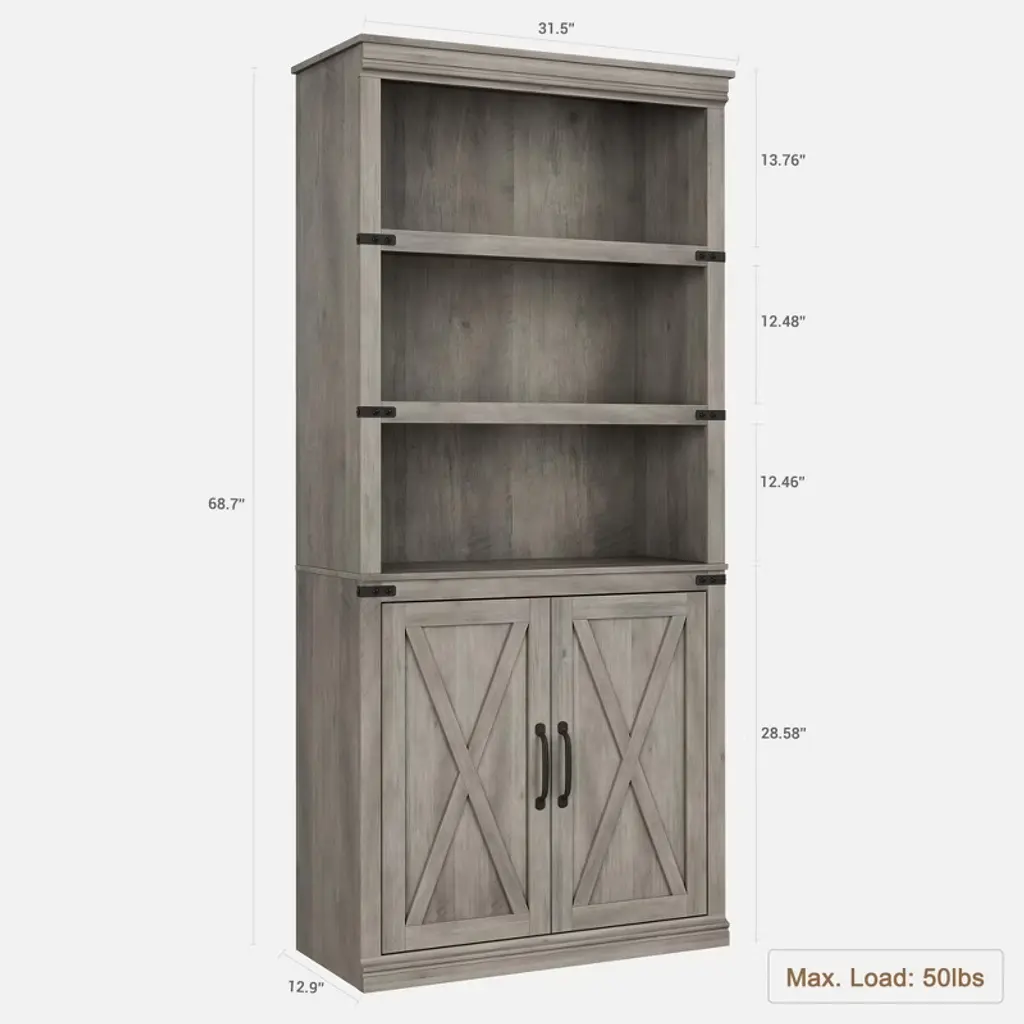This spacious 5-tier bookcase offers a versatile storage solution with three open shelves for displaying books and décor, plus two enclosed compartments with doors for dust-free organization. Constructed from thick, premium engineered wood, it combines rustic farmhouse charm with modern design. Adjustable feet provide stability and floor protection, while an anti-tip mechanism enhances safety. Easy to assemble with included instructions, this durable bookcase is perfect for home offices, living rooms, bedrooms, or entryways.
