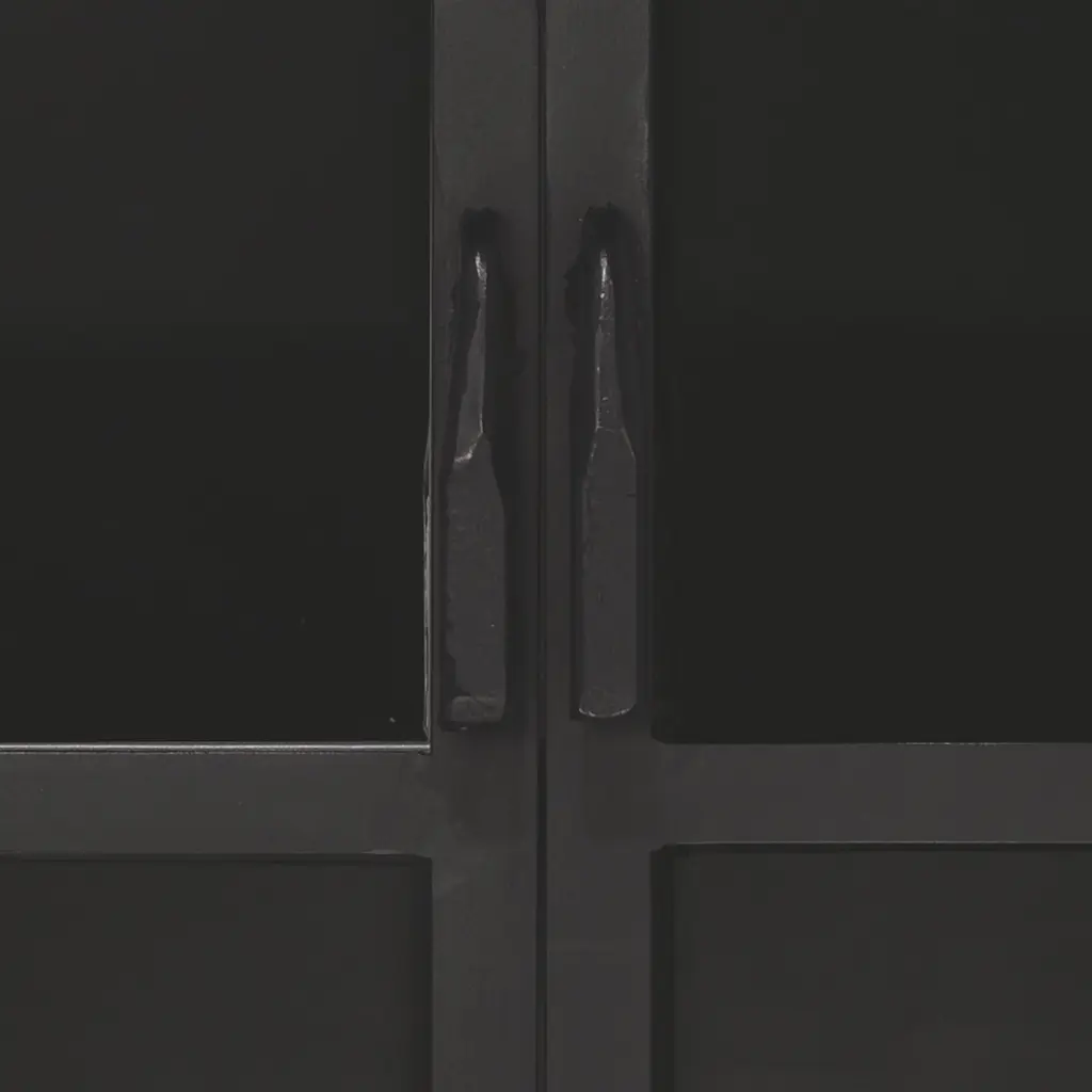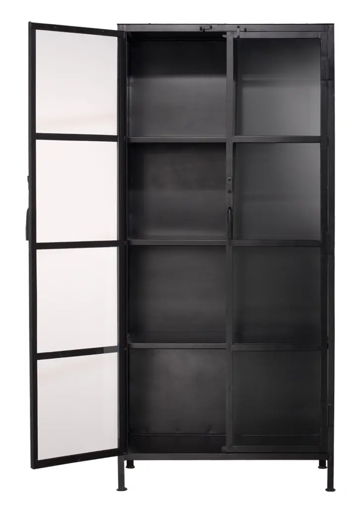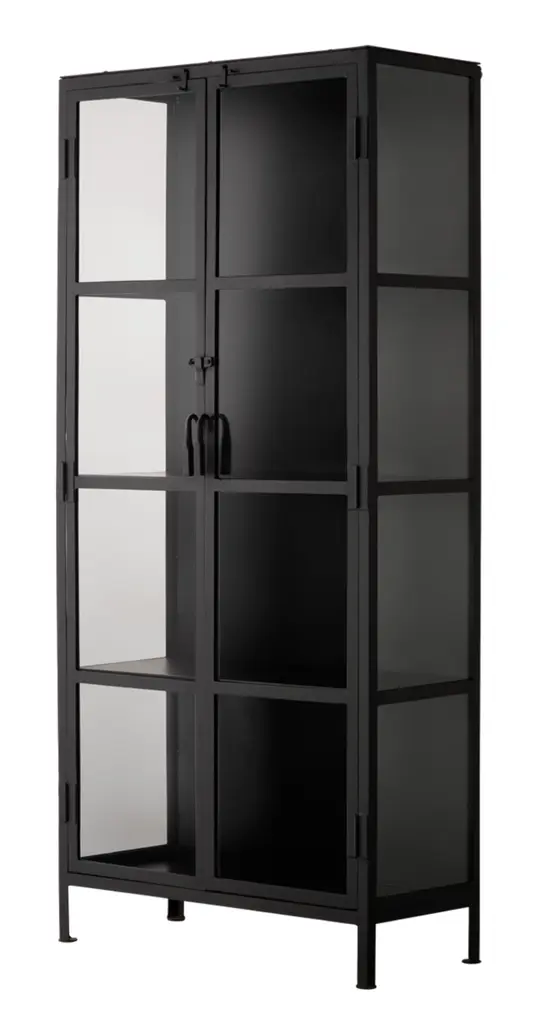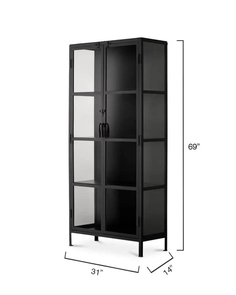 Enjoy a refined take on the industrial design aesthetic with this tall curio cabinet. This versatile storage cabinet is forged out of iron and given a rustic black finish. Featuring four glass shelves and tempered glass-pane doors, making it the perfect home for your favorite barware, books, and other collected curiosities. Materials: Iron, Glass