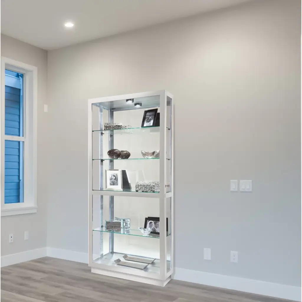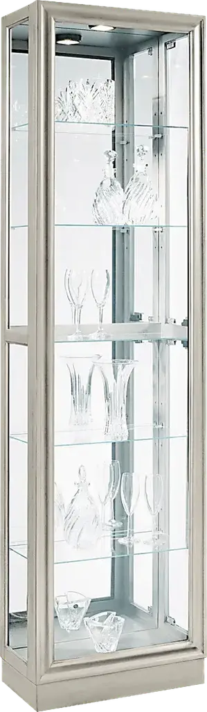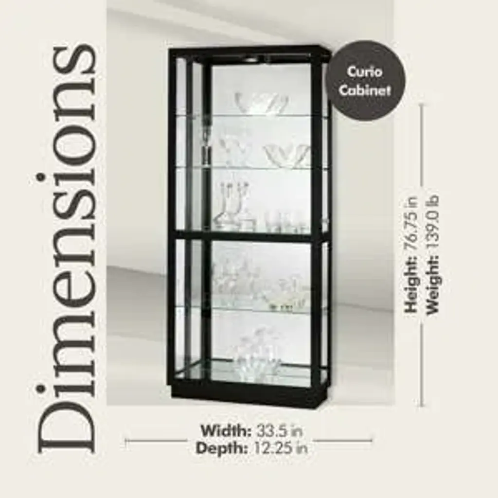 This transitional collectors cabinet features four curved front glass doors with nickel finished hardware.