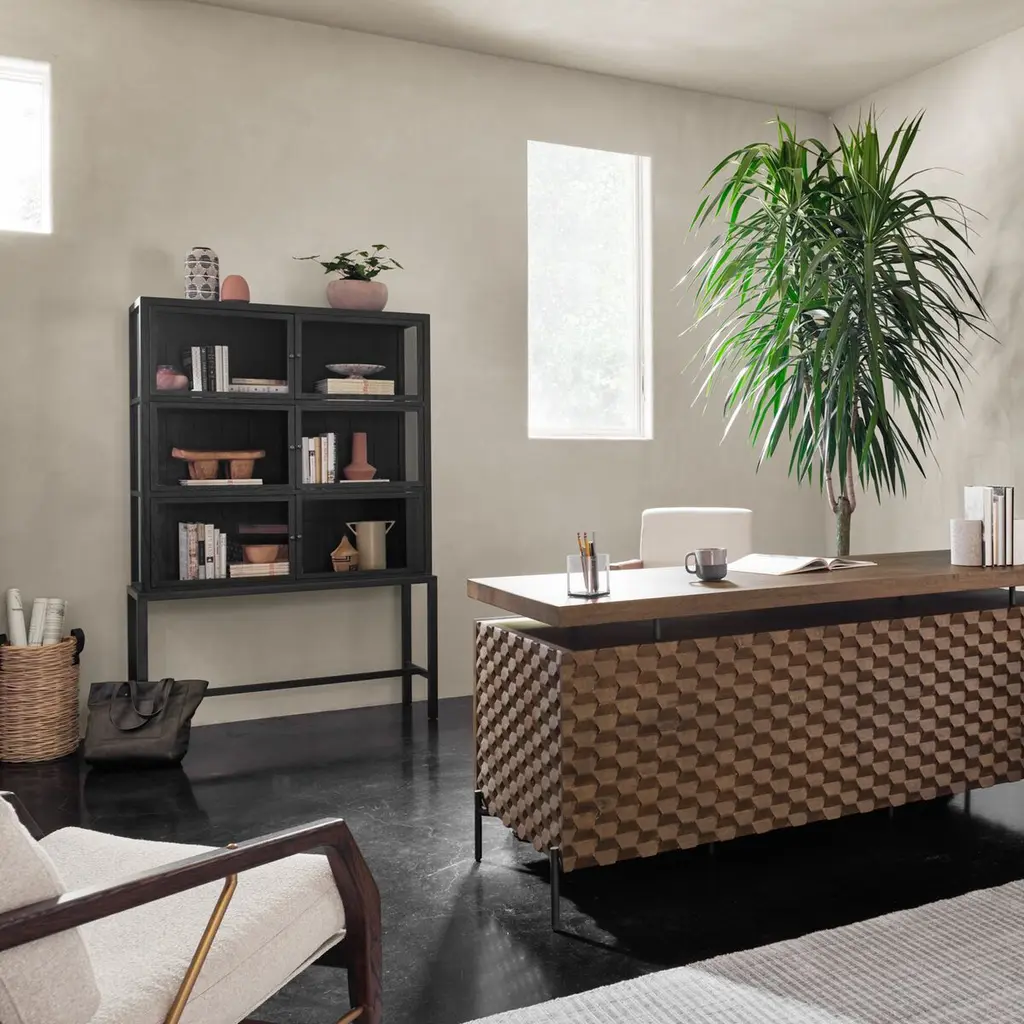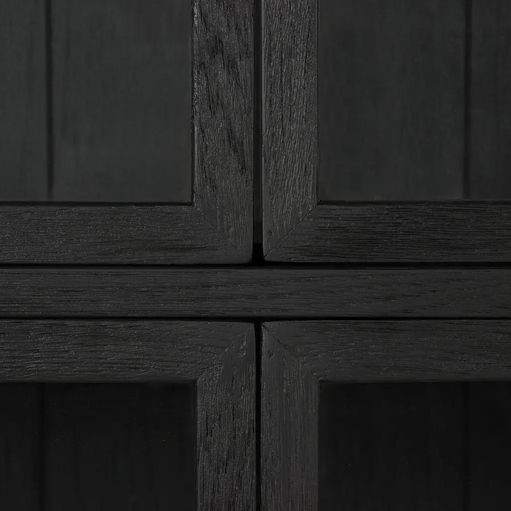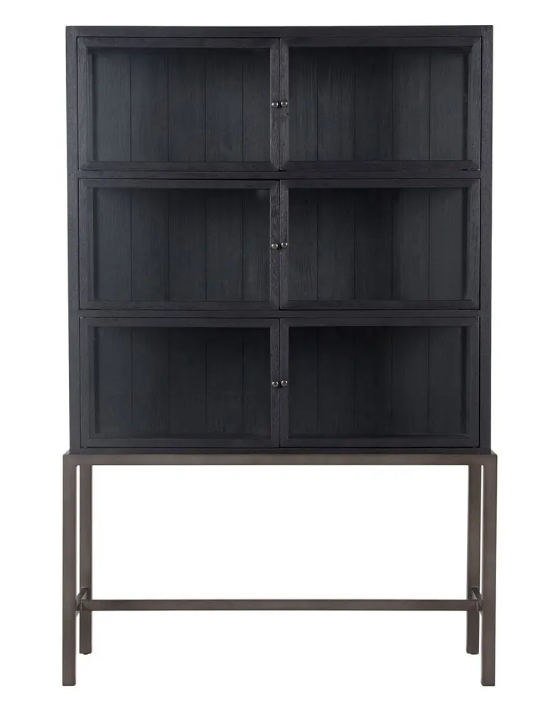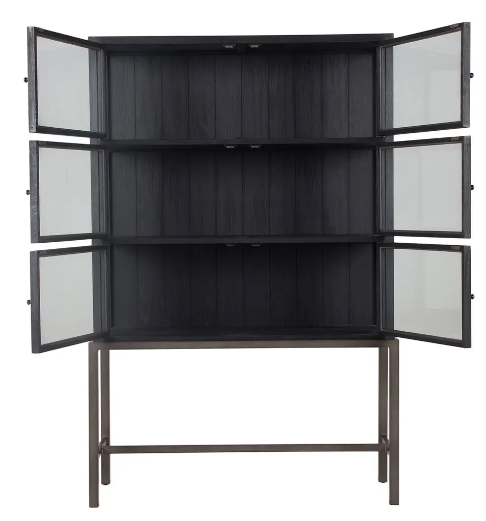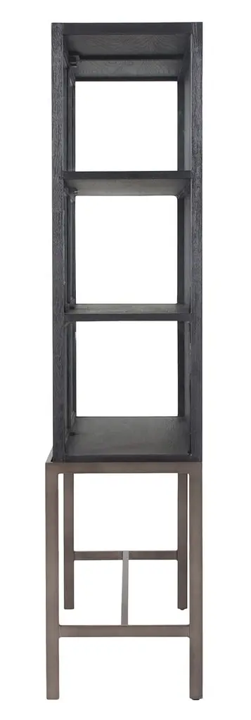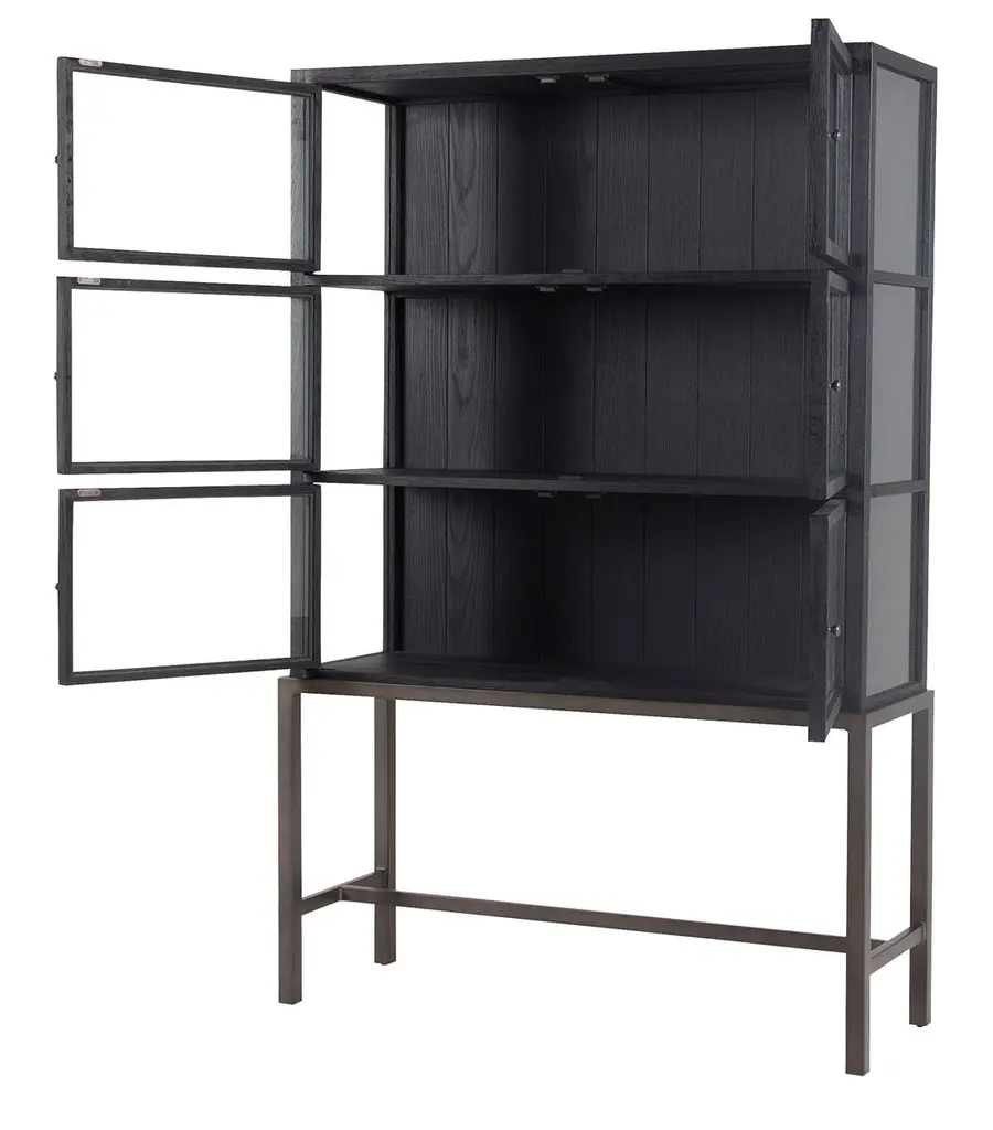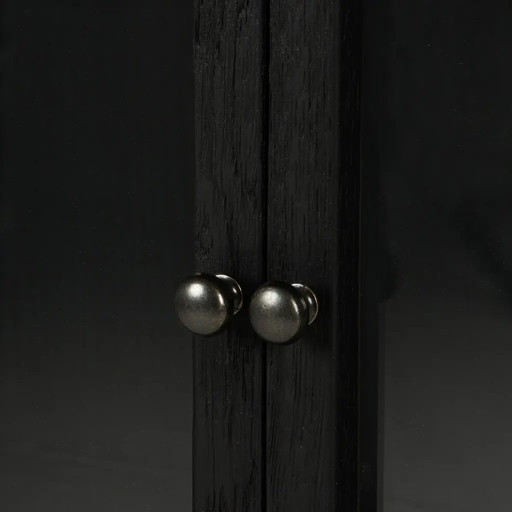 As beautiful as any objects you might display inside, this oak-frame curio cabinet rests atop a waxed black iron pedestal. Glass panels on the doors and the sides allow you to peer at the contents on the three shelves.