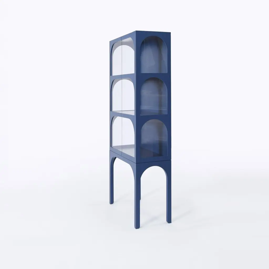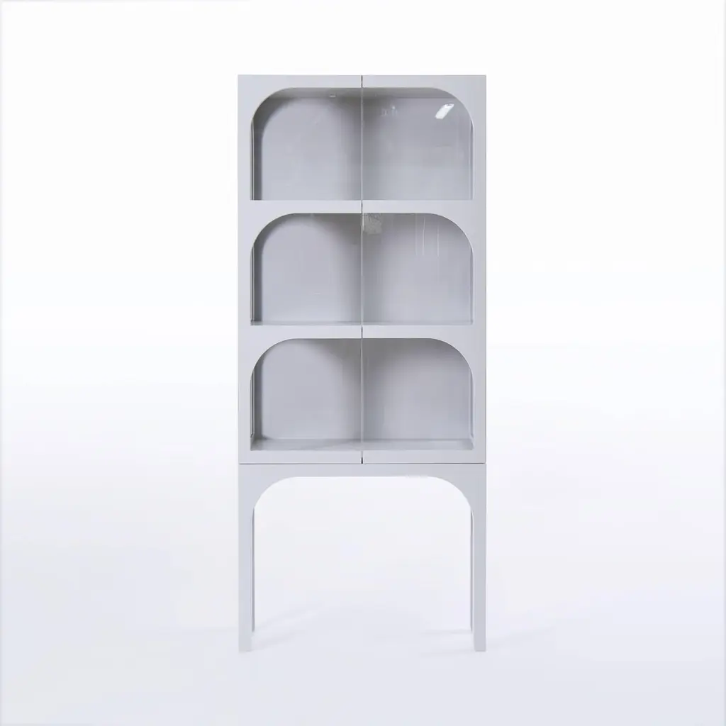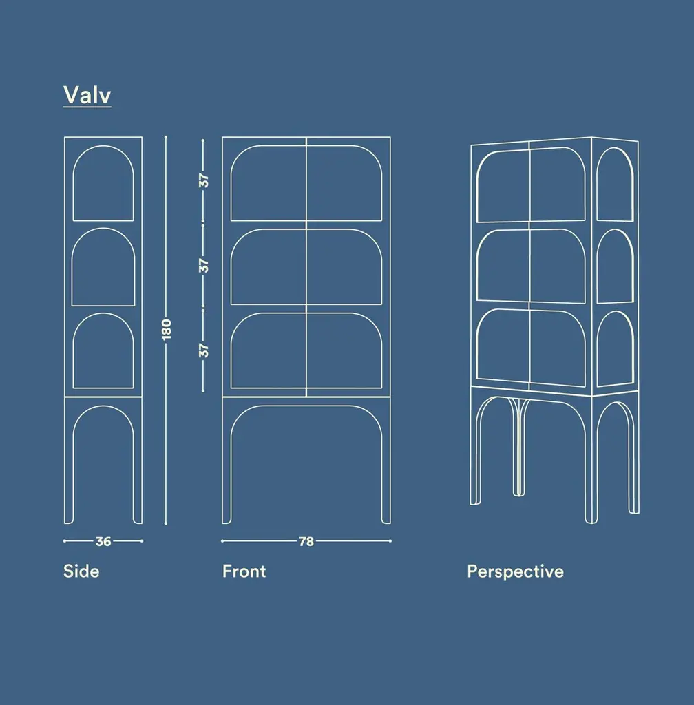 ValvLight grey Vitrine Cabinet, Lacquered Eco Fiberboard, Color by Customers ChoiceInspired by the medieval wall around the small town of Visby, Sweden, the designer noticed the tension between the massive wall and its arch openings. The very shape of the half circle makes the opening in the heavy stone wall possible. Widely used all around the world for centuries the valve shape has become a symbol of an opening enhancing the tension between the outside and the inside. The shape of the arch has now taken a decorative and symbolic place in the Valv vitrine to intensify and frame the inside of the cabinet. Valv means arch in Swedish.