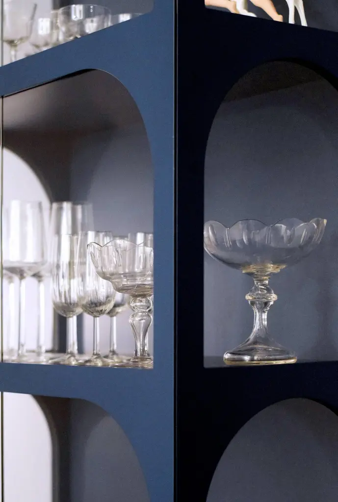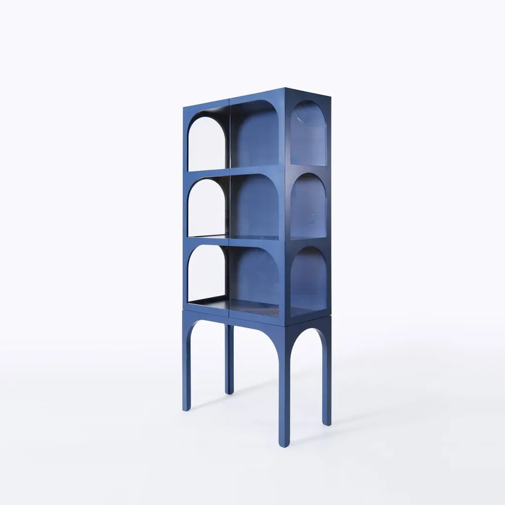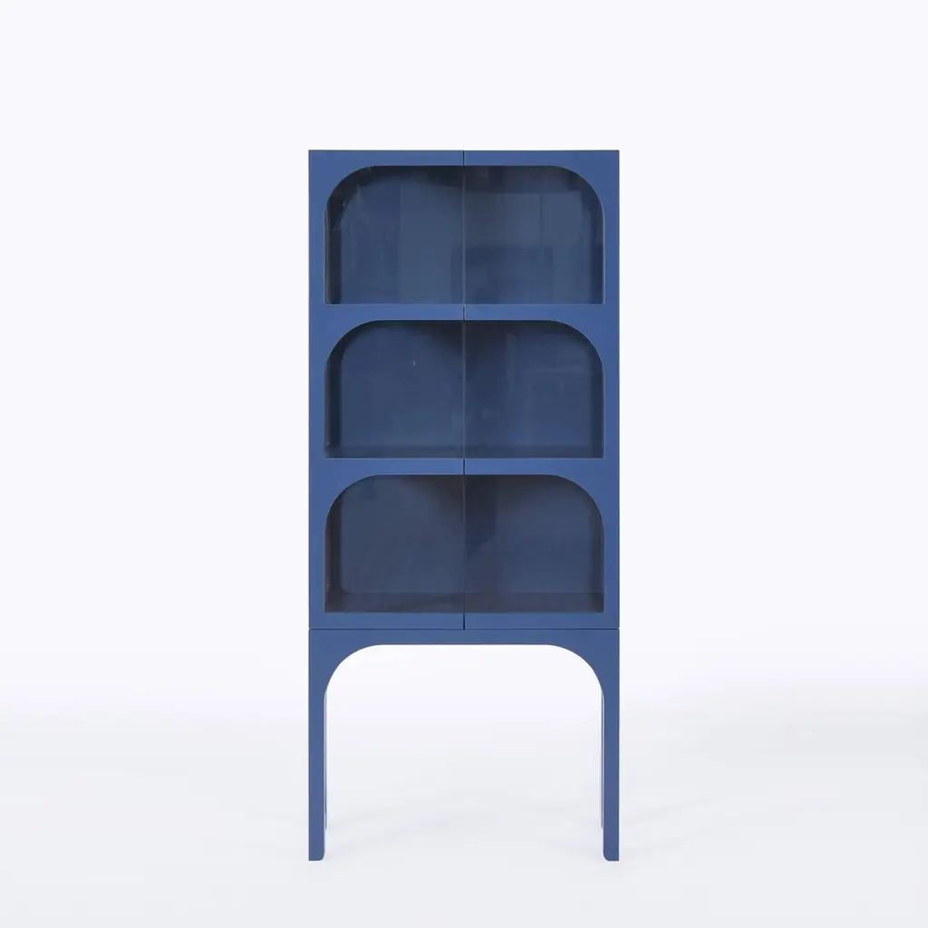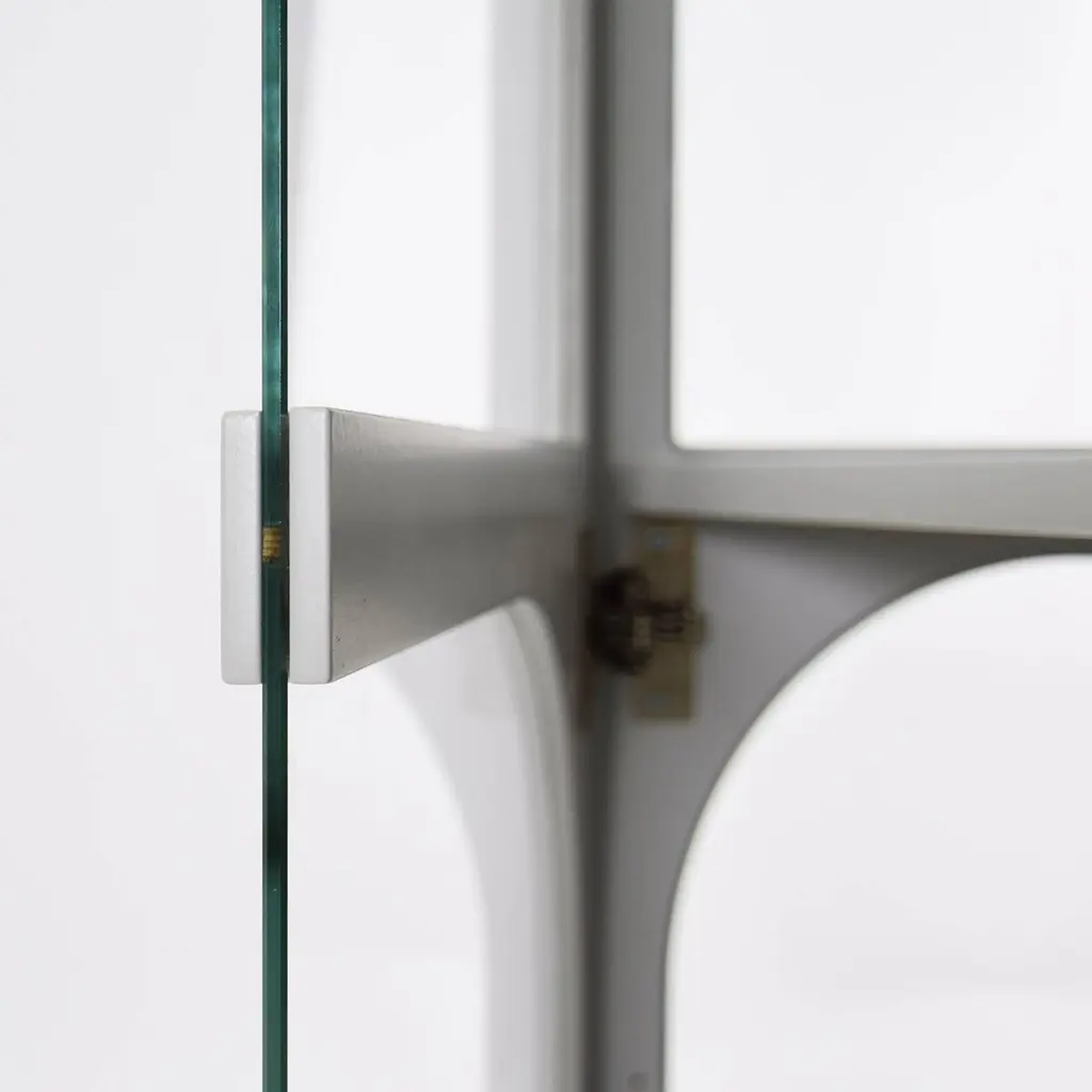 ValvLight grey Vitrine Cabinet, Lacquered Eco Fiberboard, Color by Customers ChoiceInspired by the medieval wall around the small town of Visby, Sweden, the designer noticed the tension between the massive wall and its arch openings. The very shape of the half circle makes the opening in the heavy stone wall possible. Widely used all around the world for centuries the valve shape has become a symbol of an opening enhancing the tension between the outside and the inside. The shape of the arch has now taken a decorative and symbolic place in the Valv vitrine to intensify and frame the inside of the cabinet. Valv means arch in Swedish.