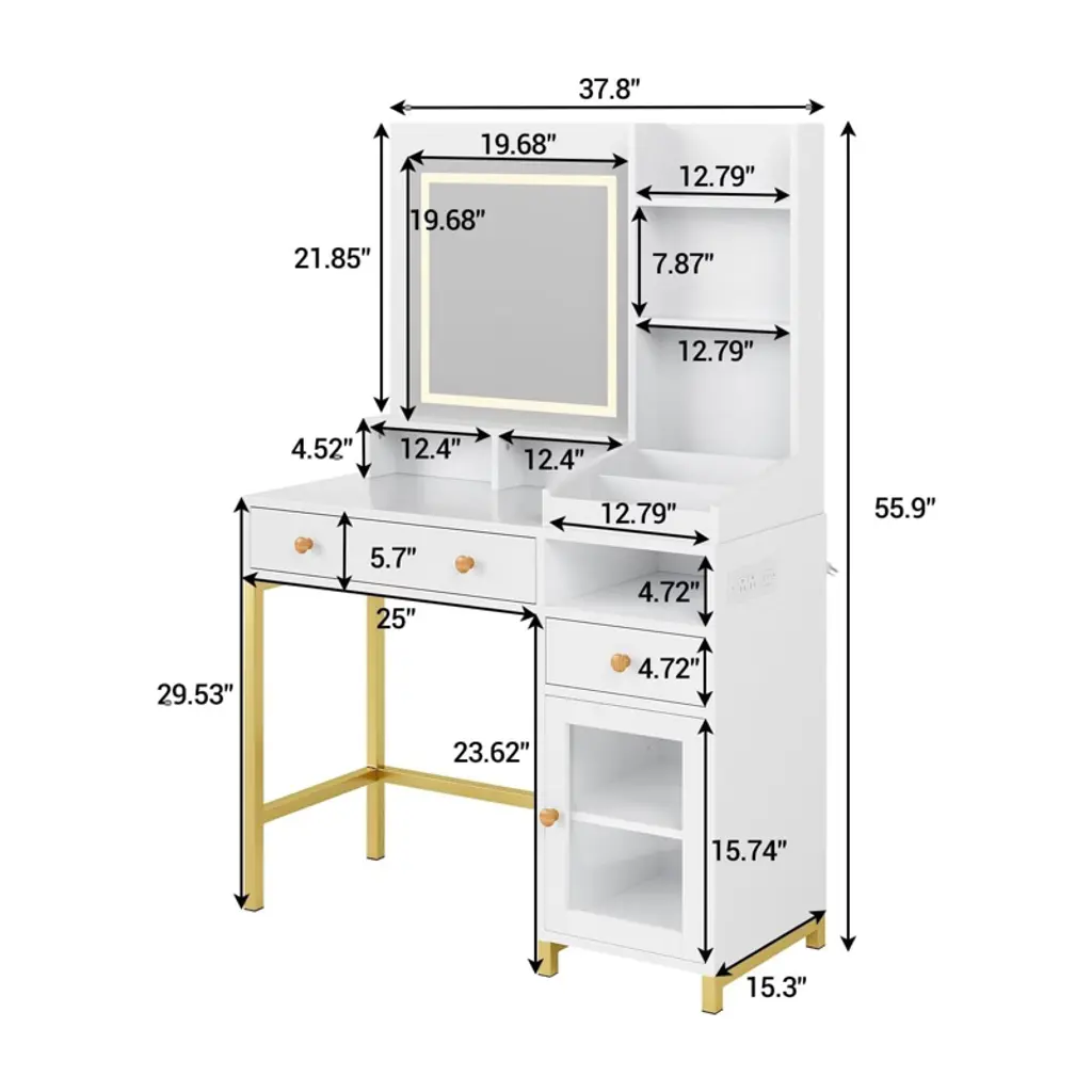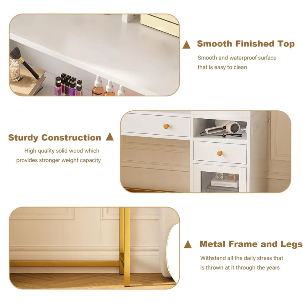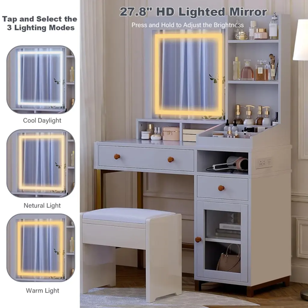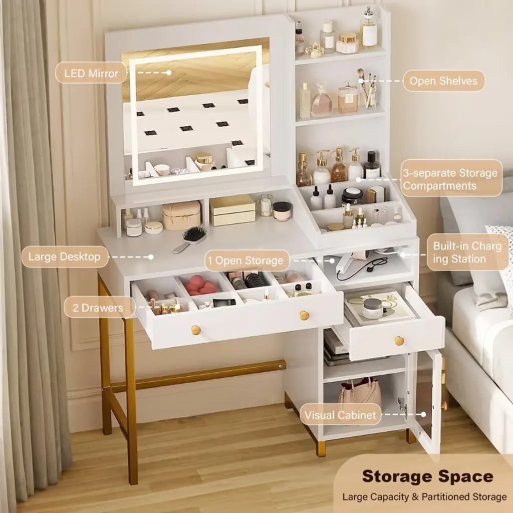Vanity Desk with Lighted Mirror, Large Makeup Dressing Table with Power Outlet 2 Drawers 1 Cabinet and Open Storage Shelves for Bedroom Women Girls