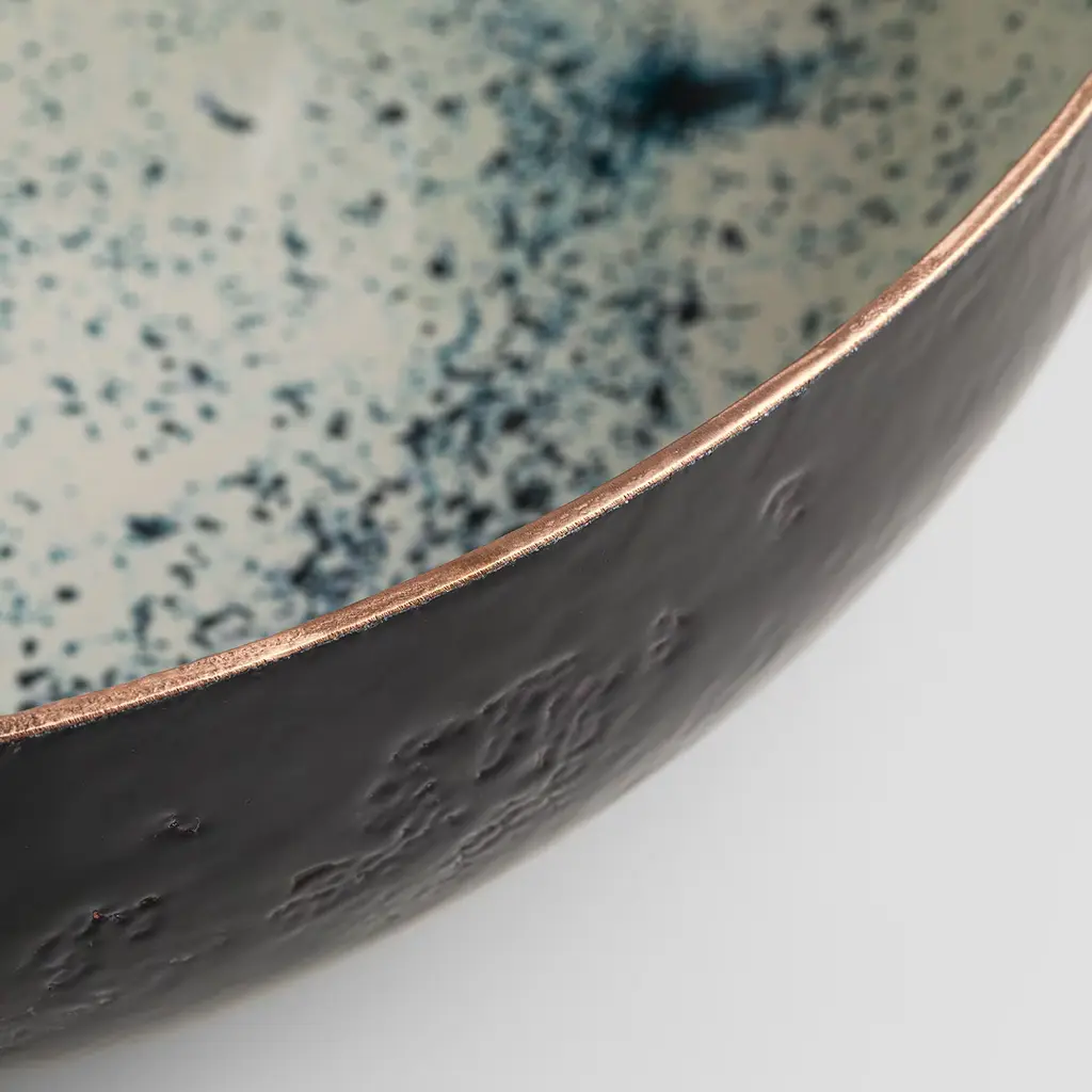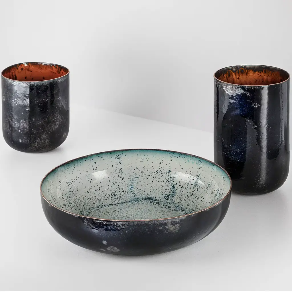 Collection of copper vases with enameled interior and enameled exterior. Unlike the Novae vases, the Mercurio vases are characterized by a rougher, more irregular appearance. Fire enameling on copper is a complex craft technique, dating back to the 1950s. Industrialized by only two companies in Italy, De Poli of Padua and Dal Campo of Milan, it was abandoned in the Seventies and is now being revived by Incalmi, which is rebuilding the tradition.