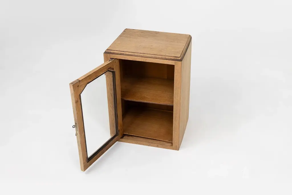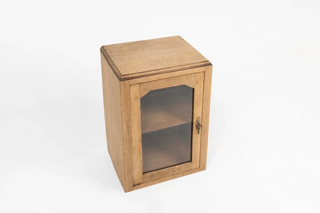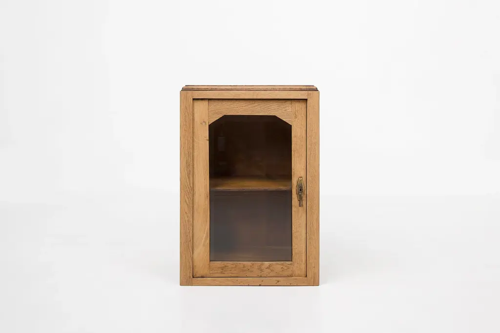France / 1900 / table cabinet / wood, facet cut glass / rustic / mid century Small display cabinet in wood with facet cut glass door and one wooden shelf. The door can be locked with its original key. Crafted in France around 1900. We have two cabinets in our collection (see our other items and pictures). These small French display cabinets with minimalistic design are the perfect blend of elegance and functionality.