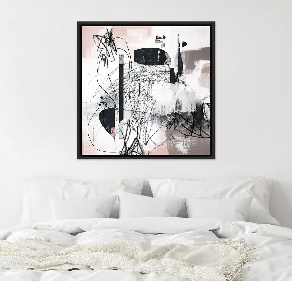 Swaths of pink add warmth to the intensity of this otherwise black-and-white abstract work. Printed on canvas, it arrives framed and ready to hang.