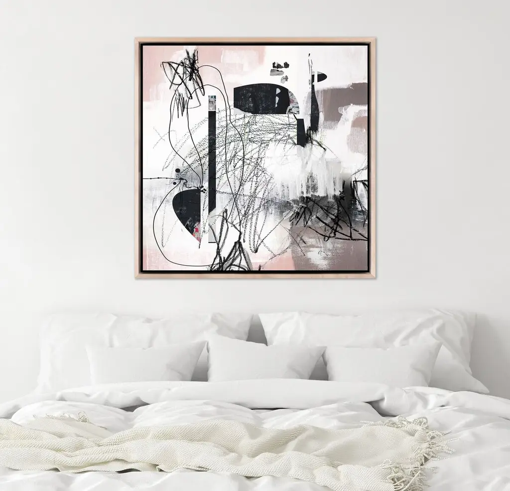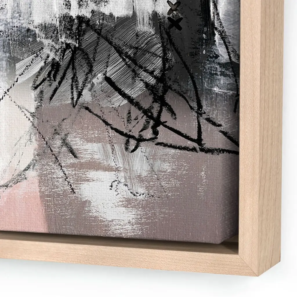 Swaths of pink add warmth to the intensity of this otherwise black-and-white abstract work. Printed on canvas, it arrives framed and ready to hang.