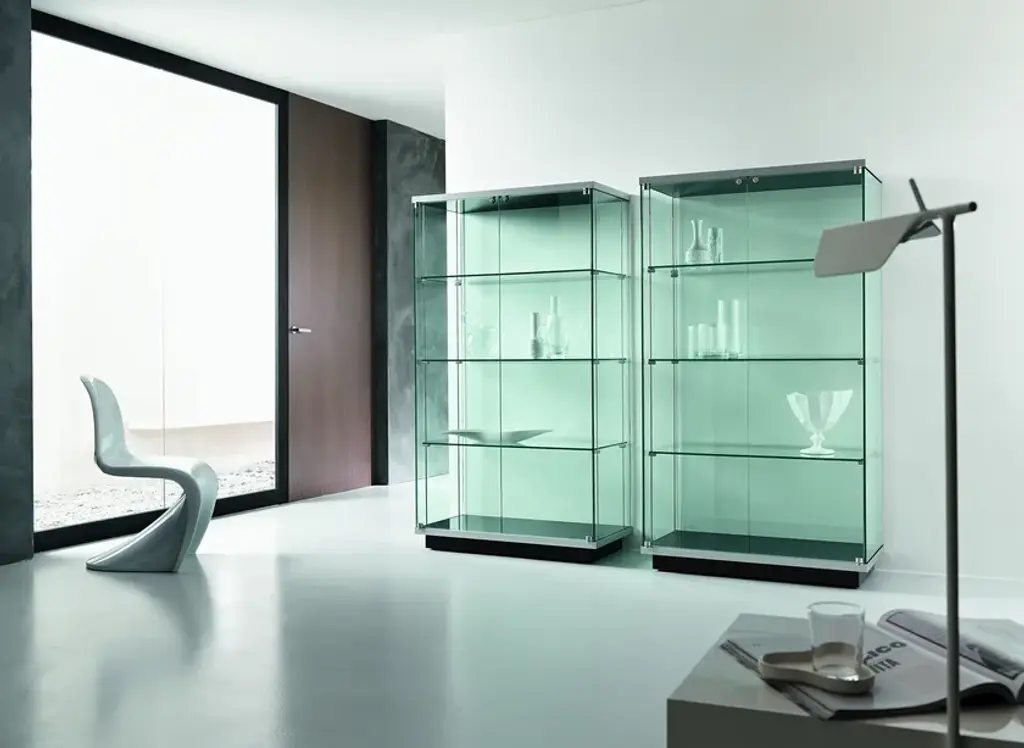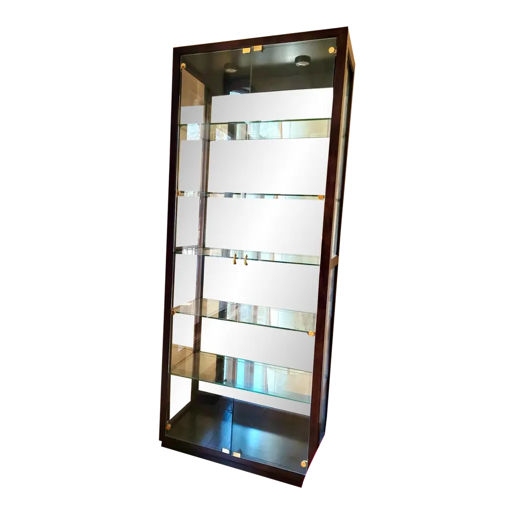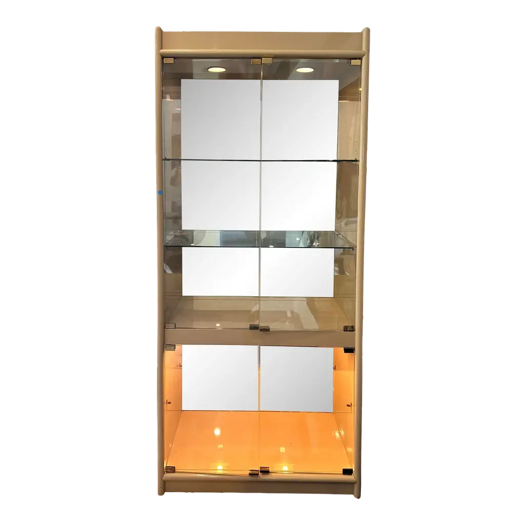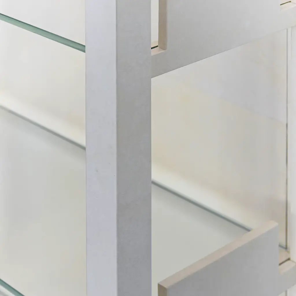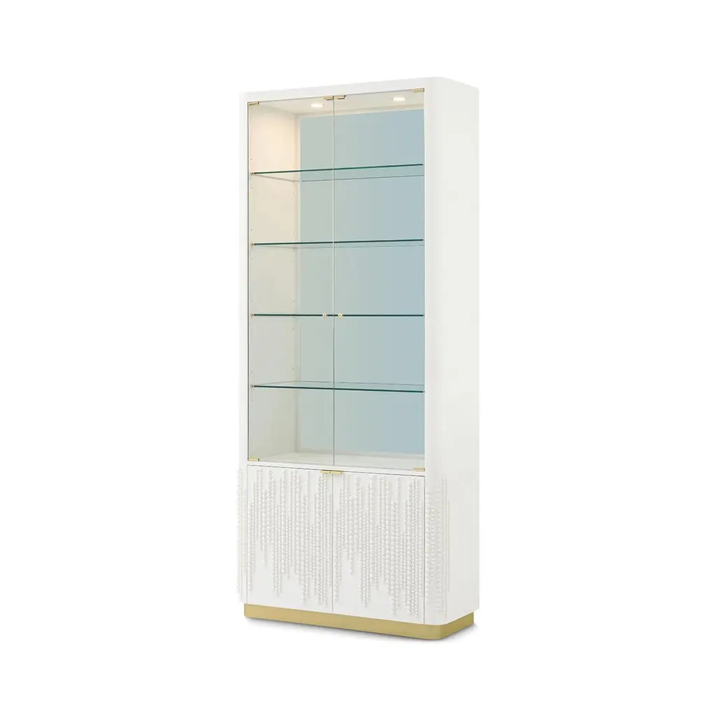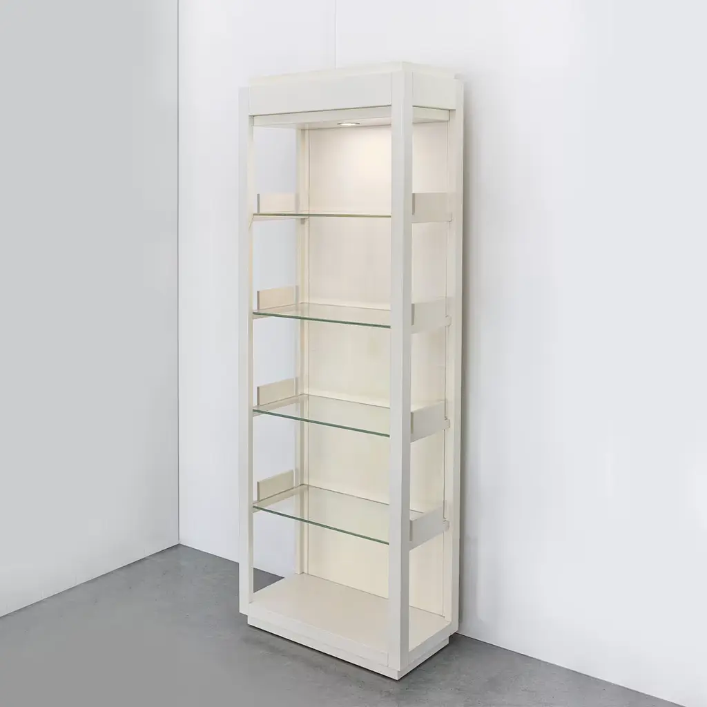 An exclusive accent to a modern or contemporary living room decor, either used to showcase objects or books, this splendid display cabinet is handcrafted of wood and fully covered with natural parchment. Enhanced with a matte finish, its clean and simple shape features four glass shelves completed with spotlights. Please consult the Concierge for further details.