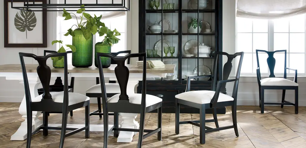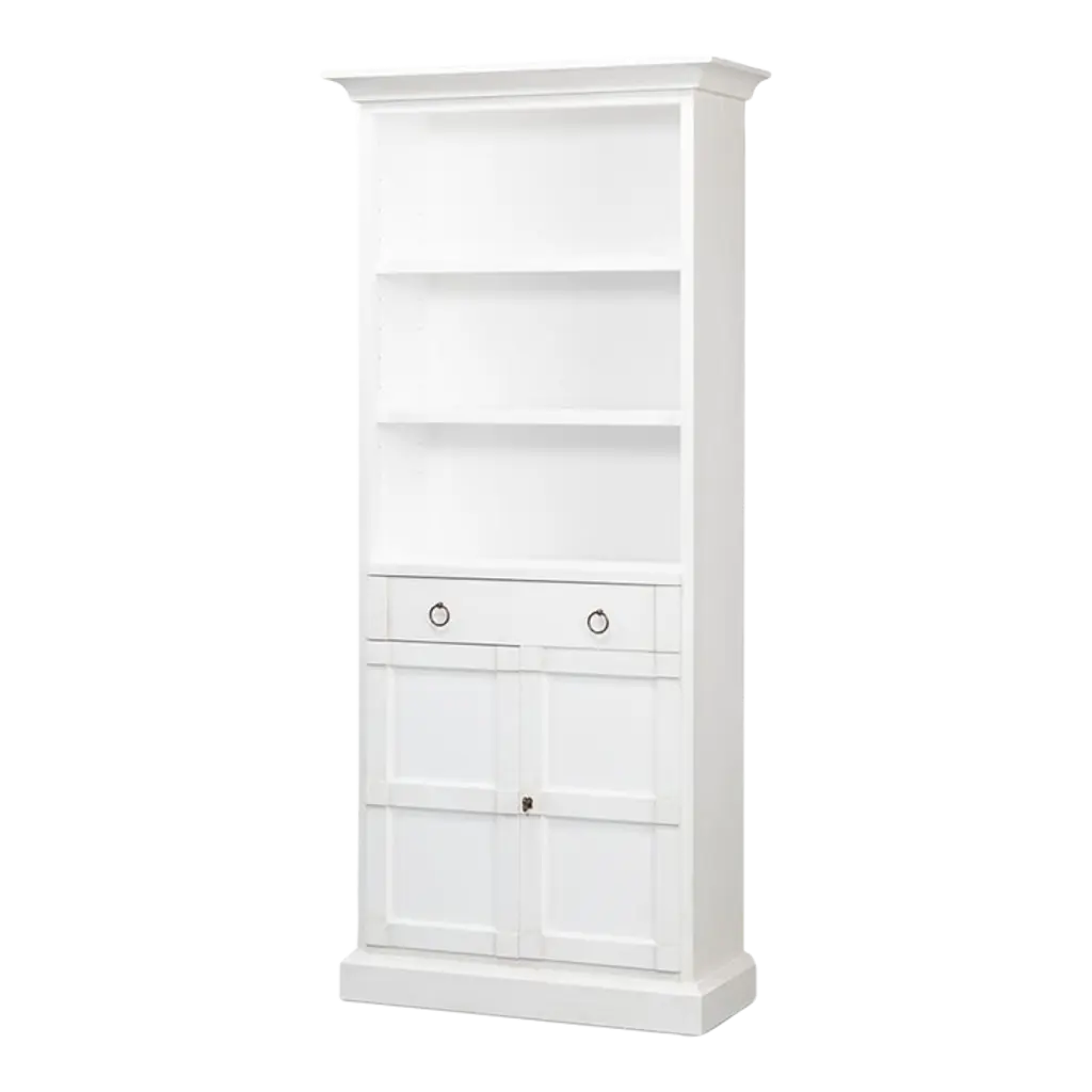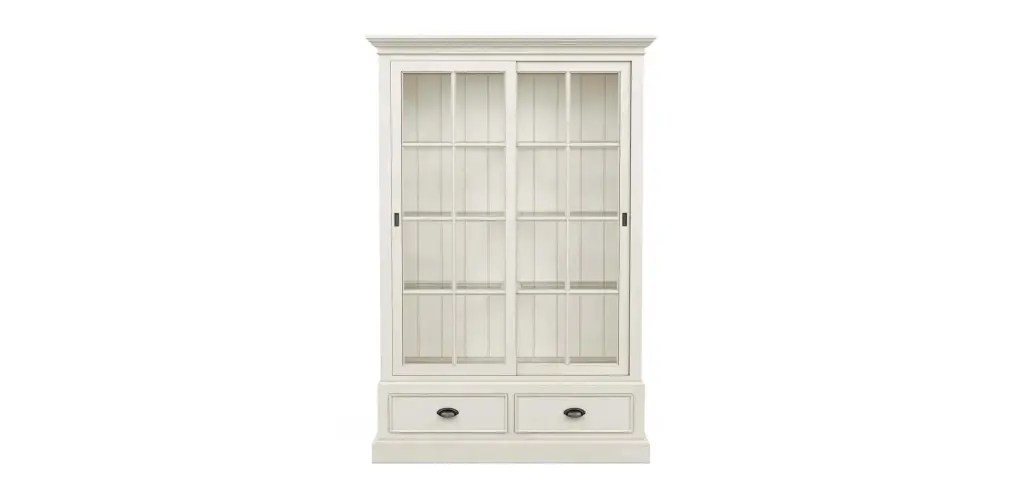A classically inspired display cabinet with relaxed design details, this cabinet features sliding glass panel doors that open to reveal a beadboard back panel, glass shelving, and Halogen canister lighting. The base of the unit has two drawers with soft-close slides and antiqued pewter-finished cup pulls. It’s available in an array of beautiful colors.