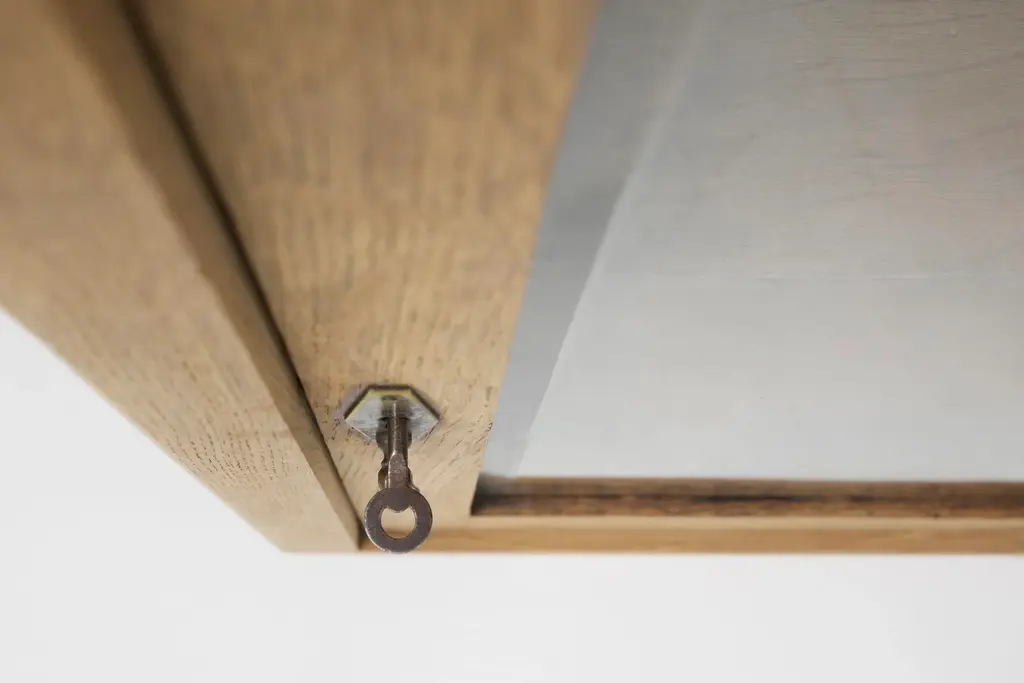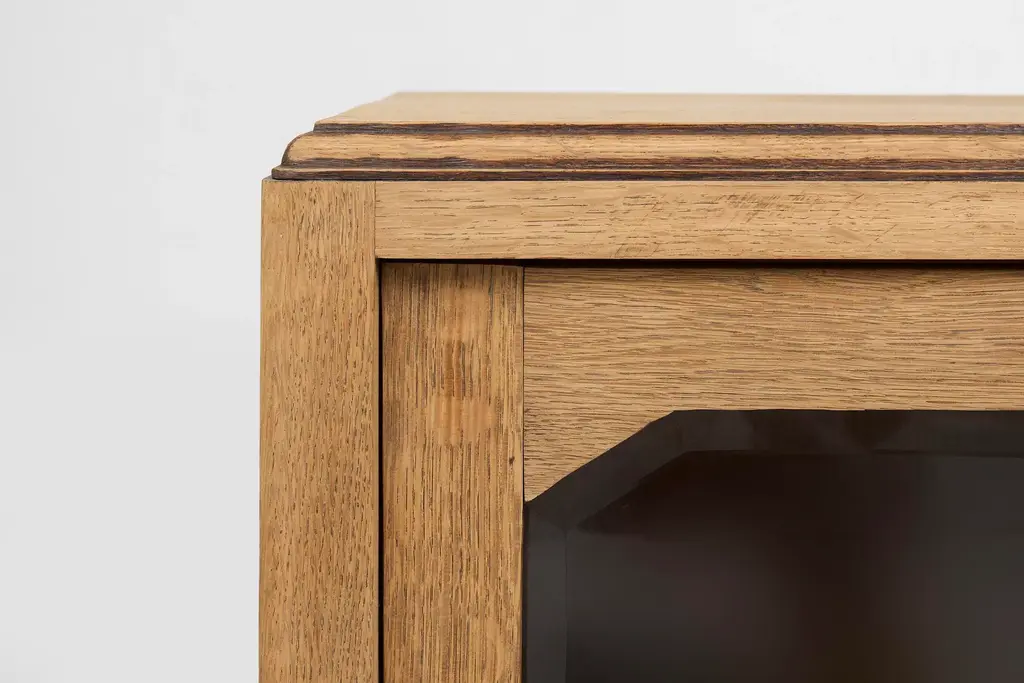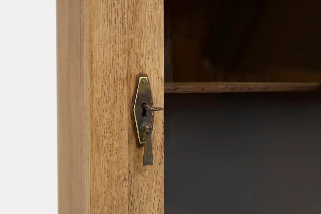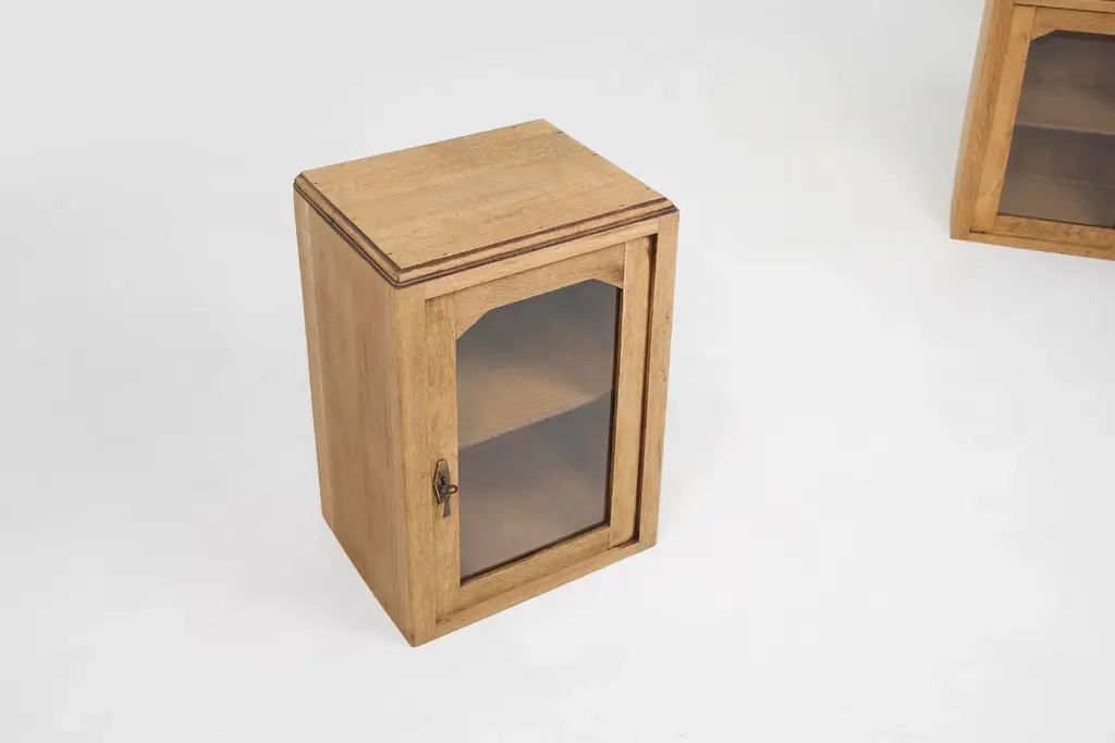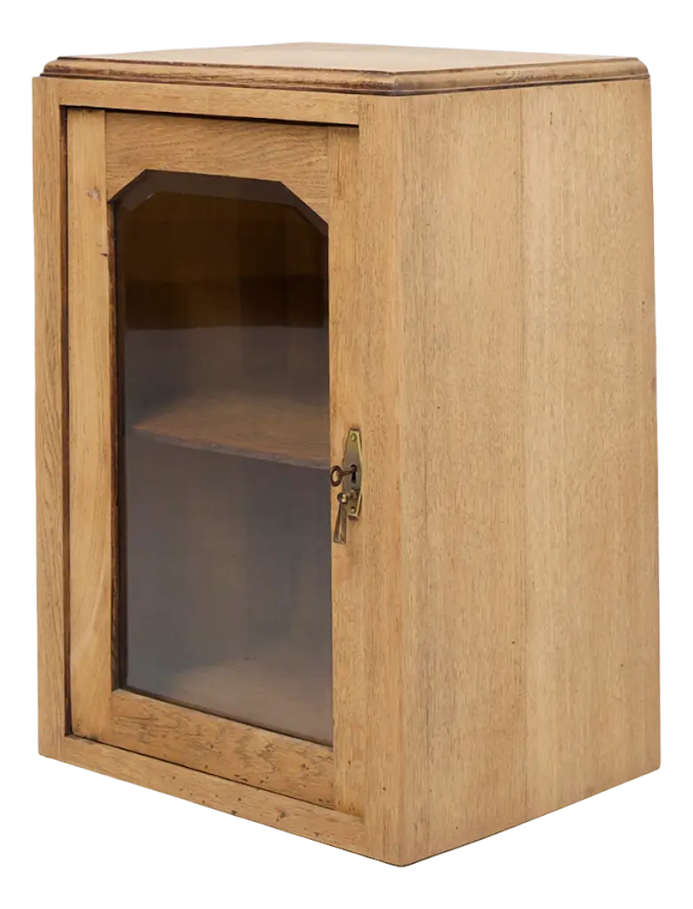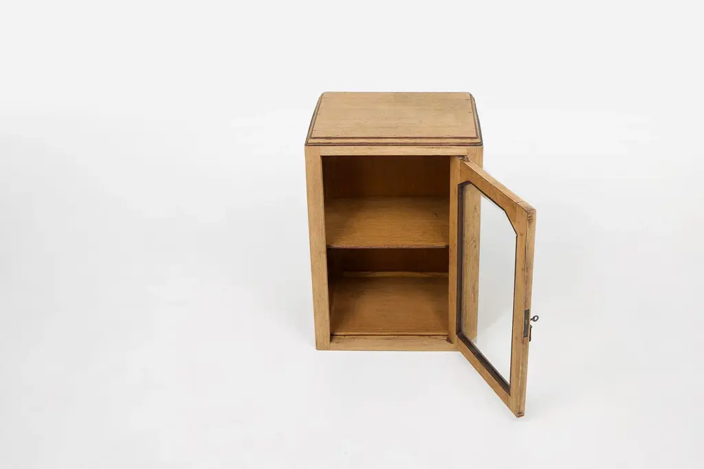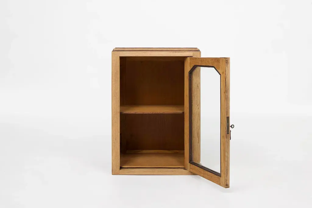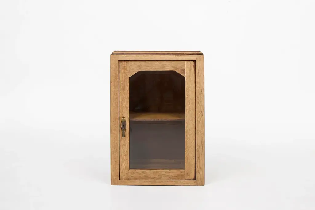 France / 1900 / table cabinet / wood, facet cut glass / rustic / mid century Small display cabinet in wood with facet cut glass door and one wooden shelf. The door can be locked with its original key. Crafted in France around 1900. We have two cabinets in our collection (see our other items and pictures). These small French display cabinets with minimalistic design are the perfect blend of elegance and functionality.