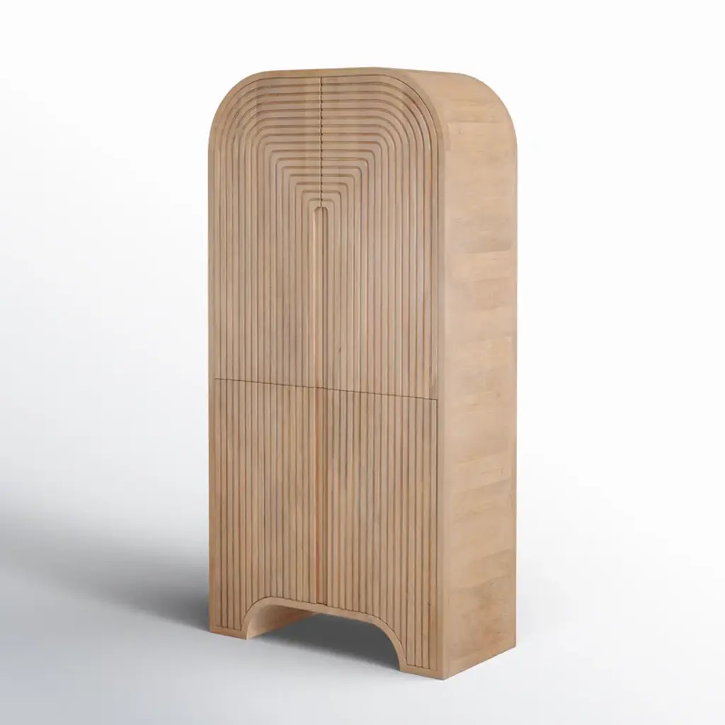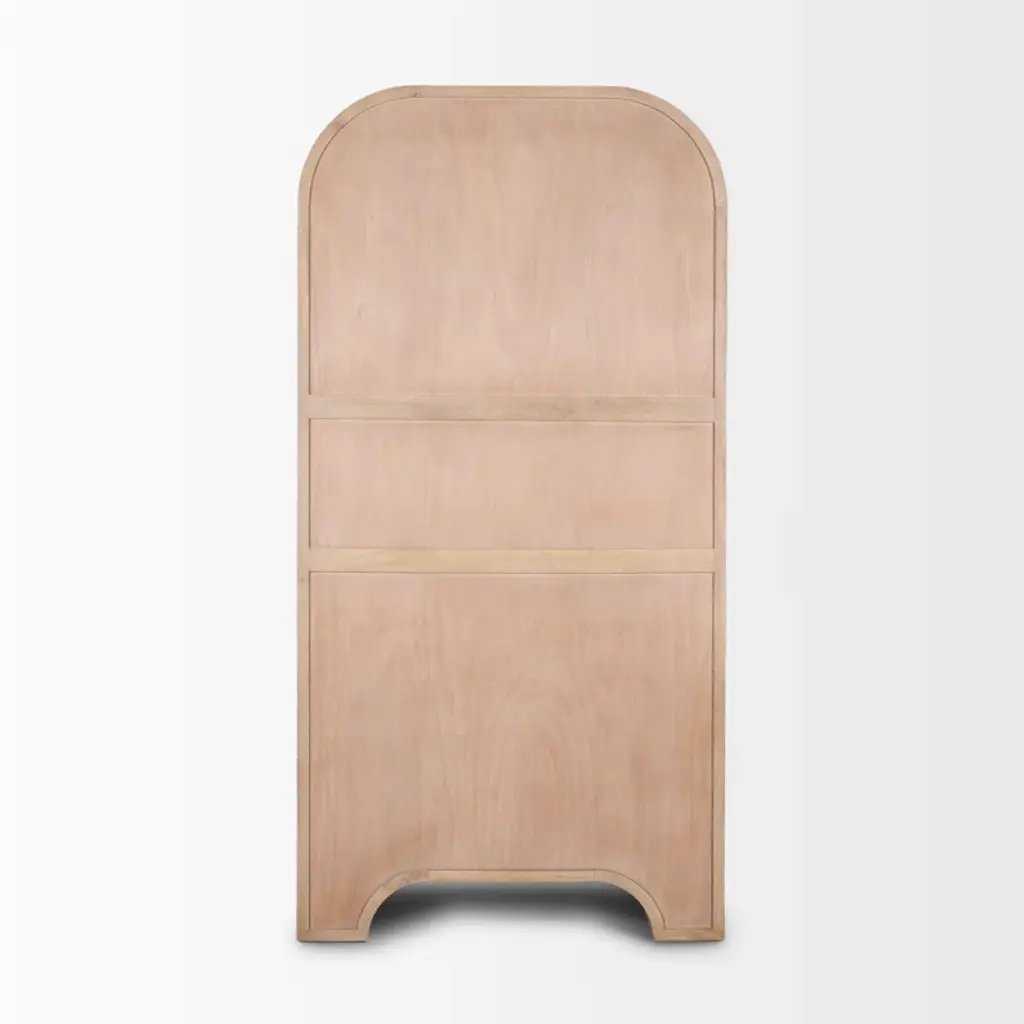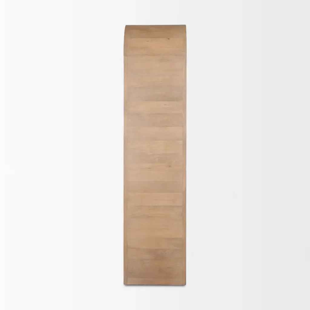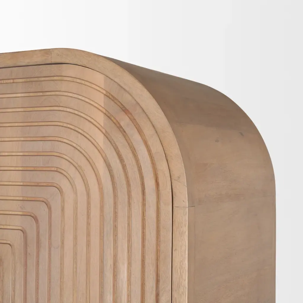This curio cabinet doubles as statement storage with its bold, architectural design. Made with solid mango wood, it features an arched silhouette and ribbed detailing that creates a sculptural, graphic look. Cutout handles keep the lines clean and modern. Inside, four shelves offer plenty of space for display or storage. Plus, the back is fully finished for flexible styling.