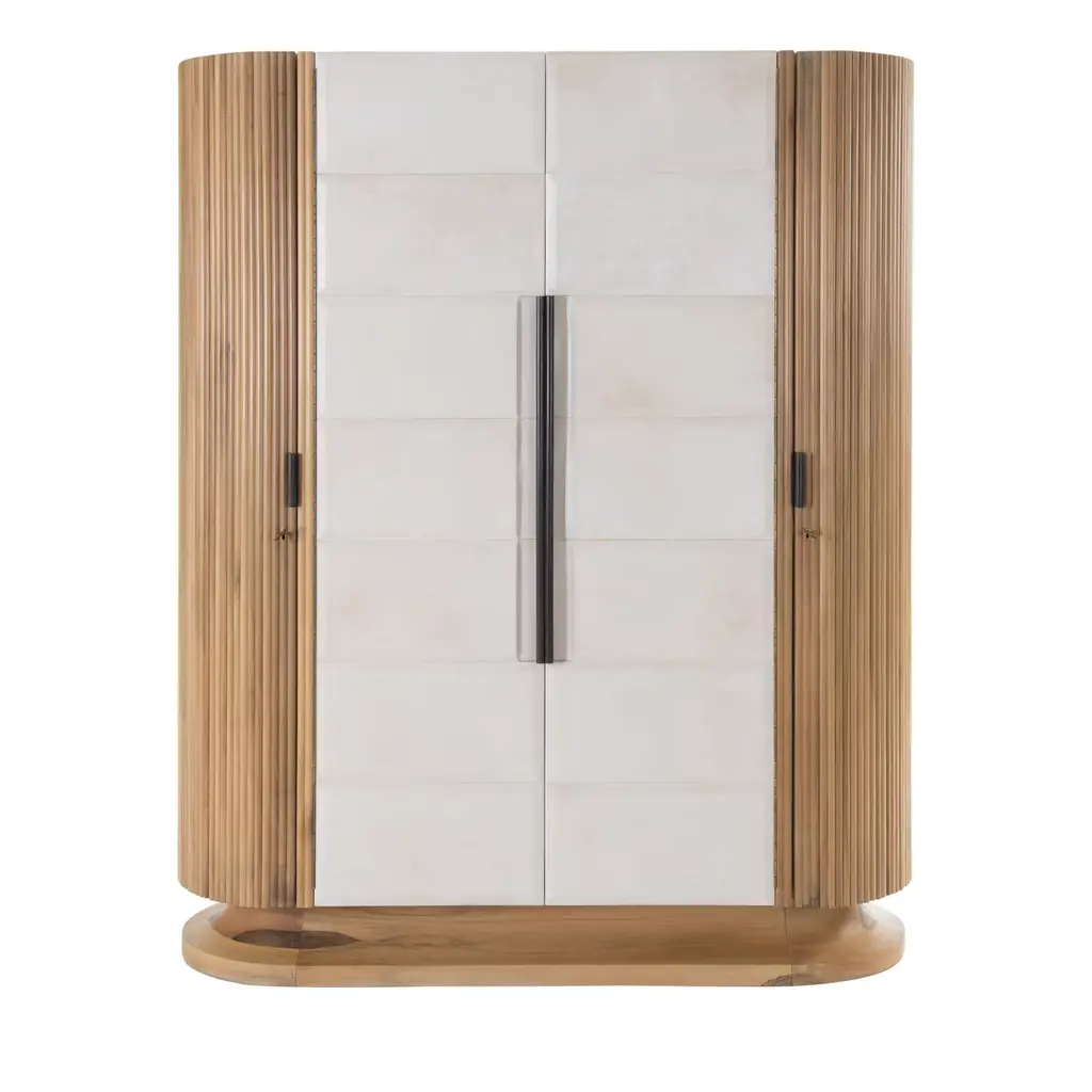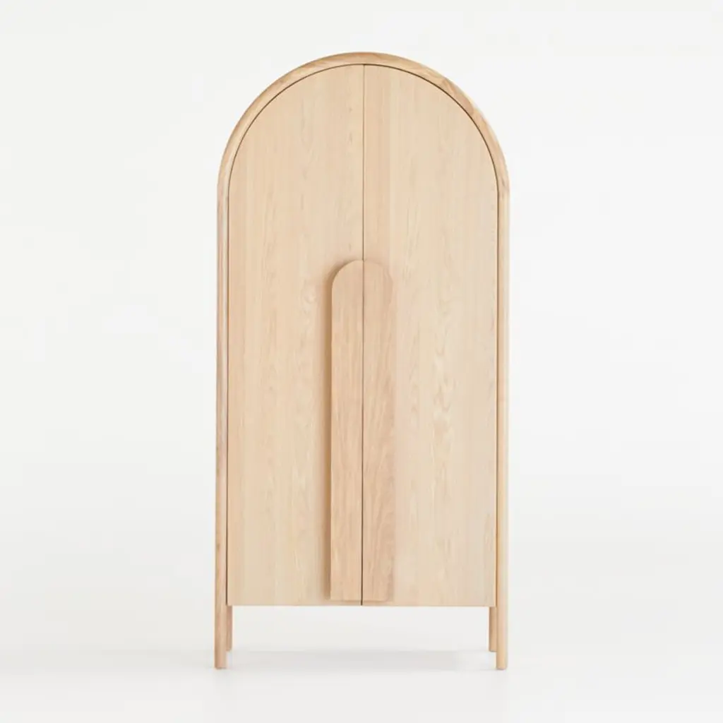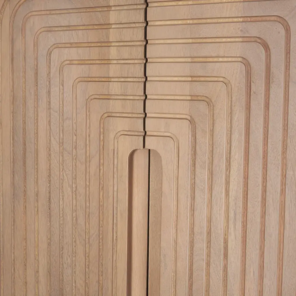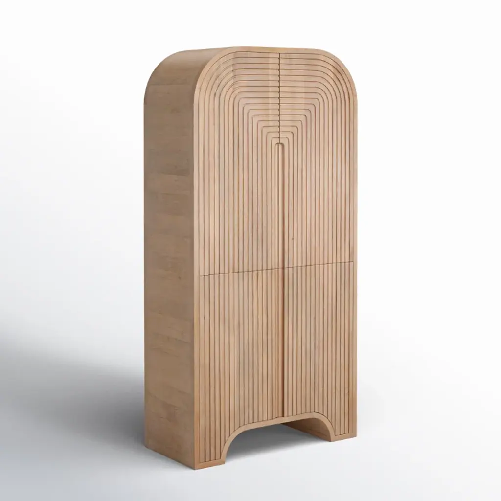 This curio cabinet doubles as statement storage with its bold, architectural design. Made with solid mango wood, it features an arched silhouette and ribbed detailing that creates a sculptural, graphic look. Cutout handles keep the lines clean and modern. Inside, four shelves offer plenty of space for display or storage. Plus, the back is fully finished for flexible styling.