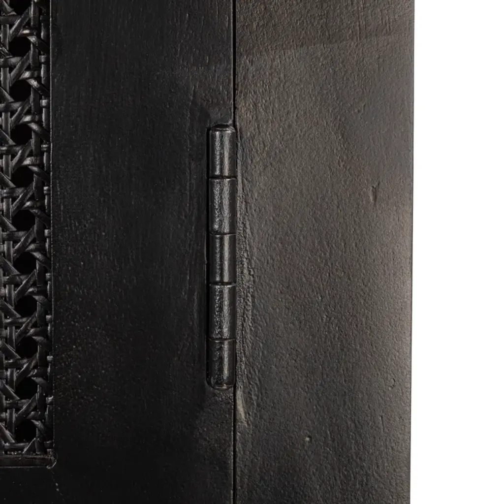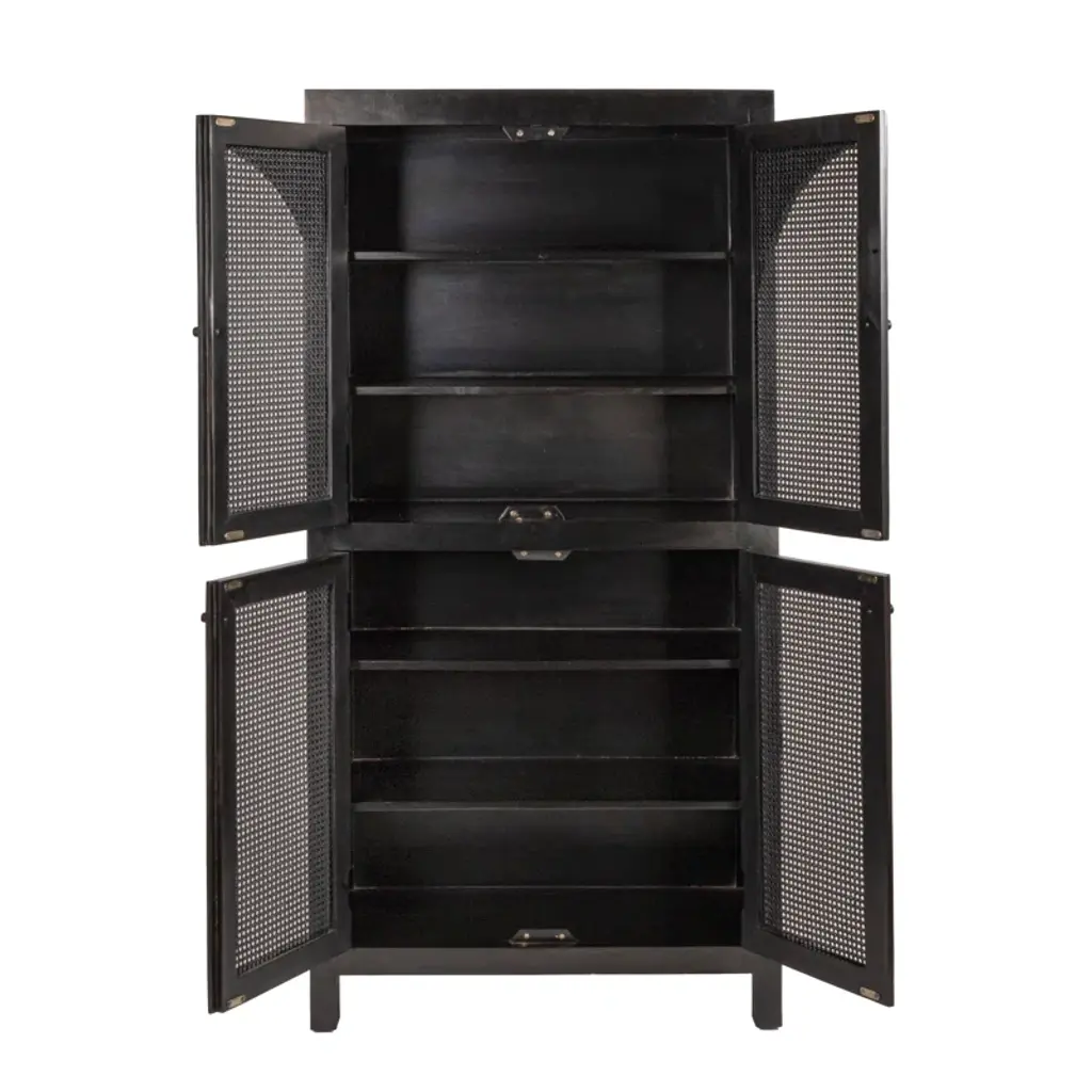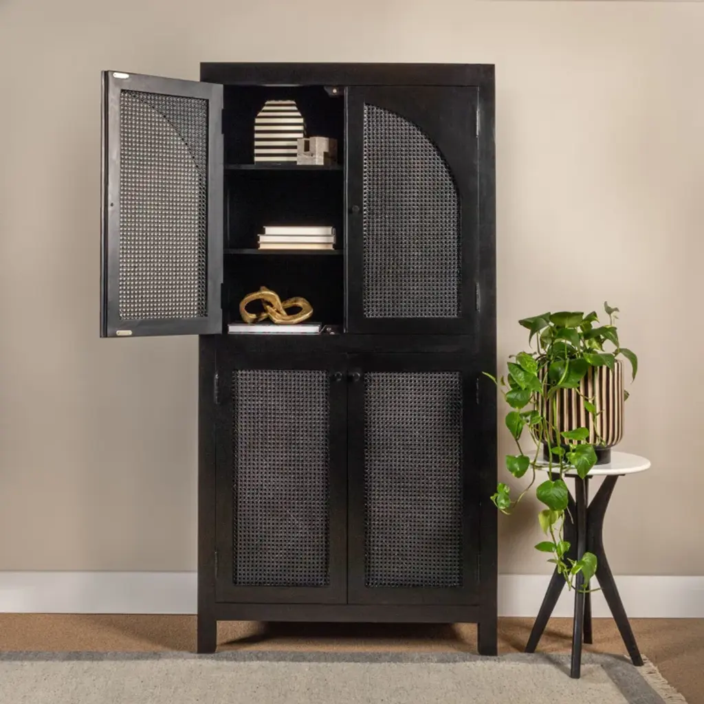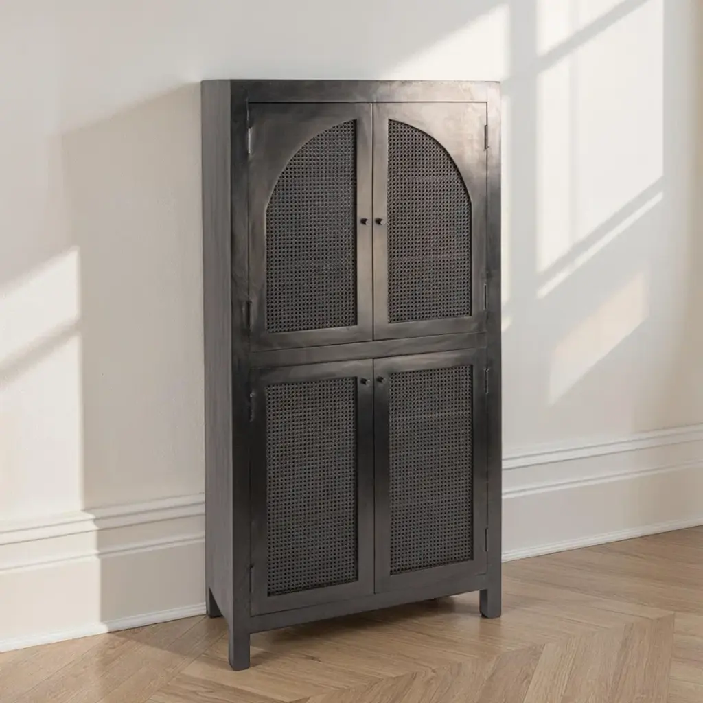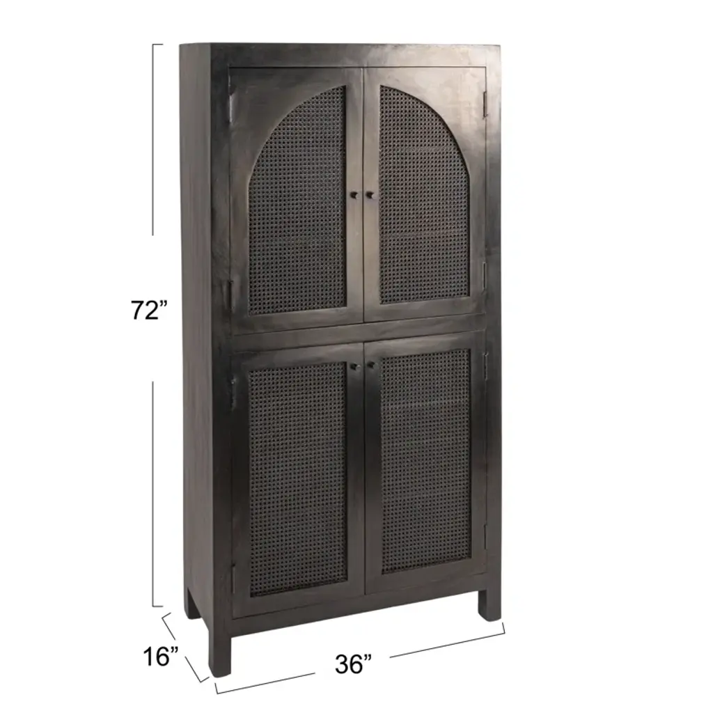 Tall Arched Curio Cabinet With Storage Shelves And Arched Cane Door