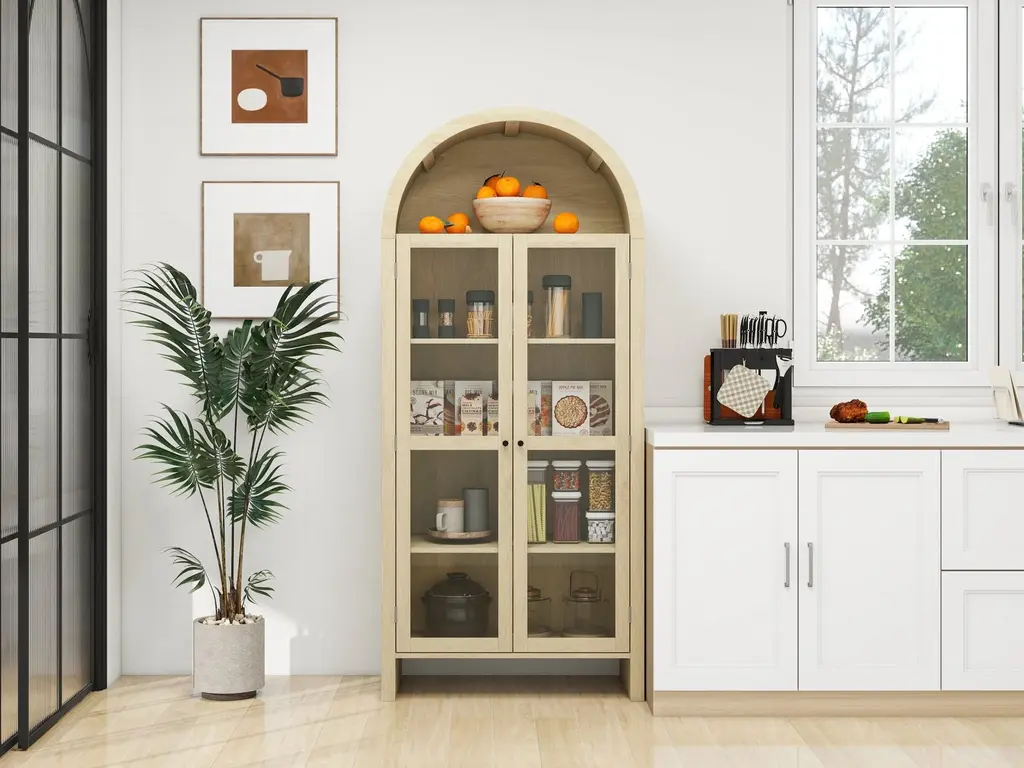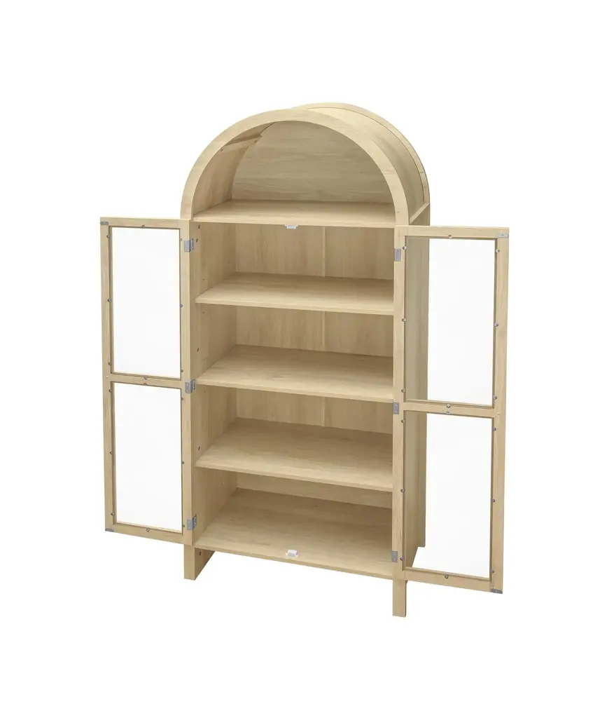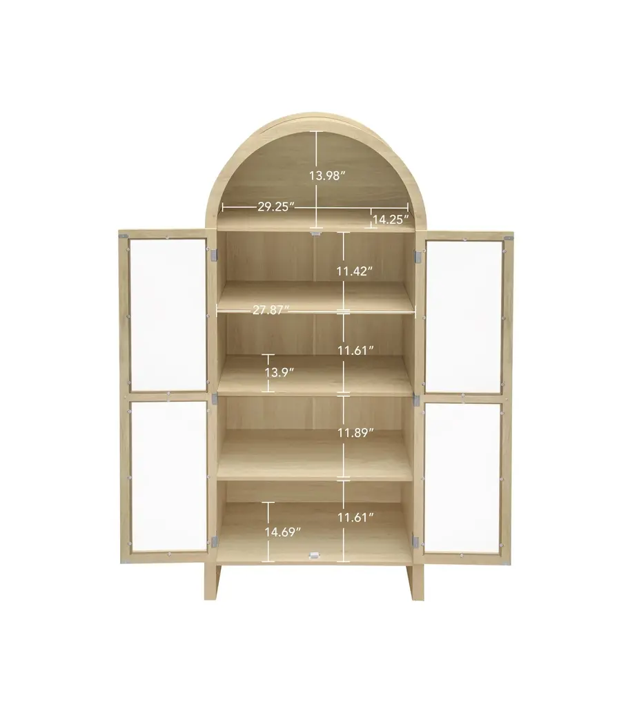 Transform your space with this elegant arched storage display cabinet, designed to enhance both style and functionality. Featuring two glass doors, it provides a clear view of your stored items while keeping them protected. Inside, you'll find two fixed and two adjustable offering versatile storage options for various items. The magnetic door catcher ensures a secure and seamless closure, making this cabinet both practical and refined for any room. 70.28"
