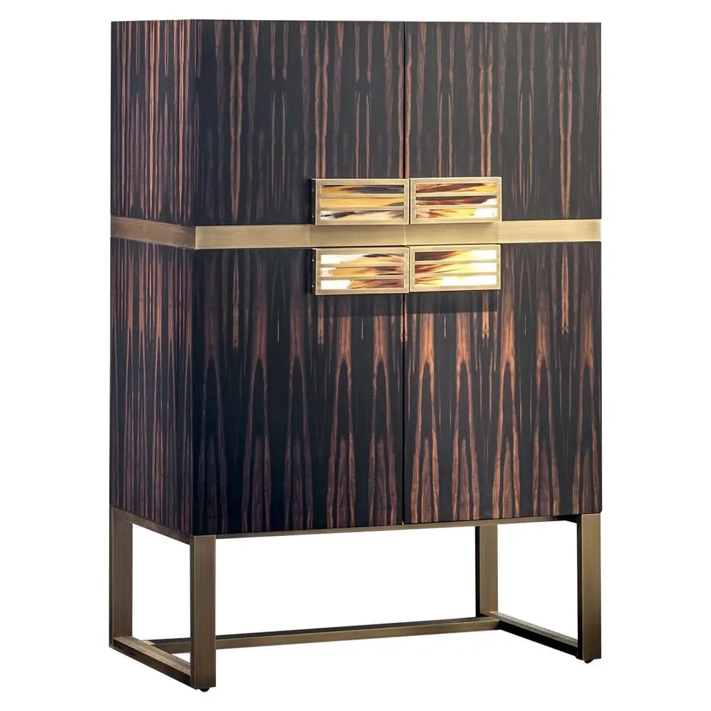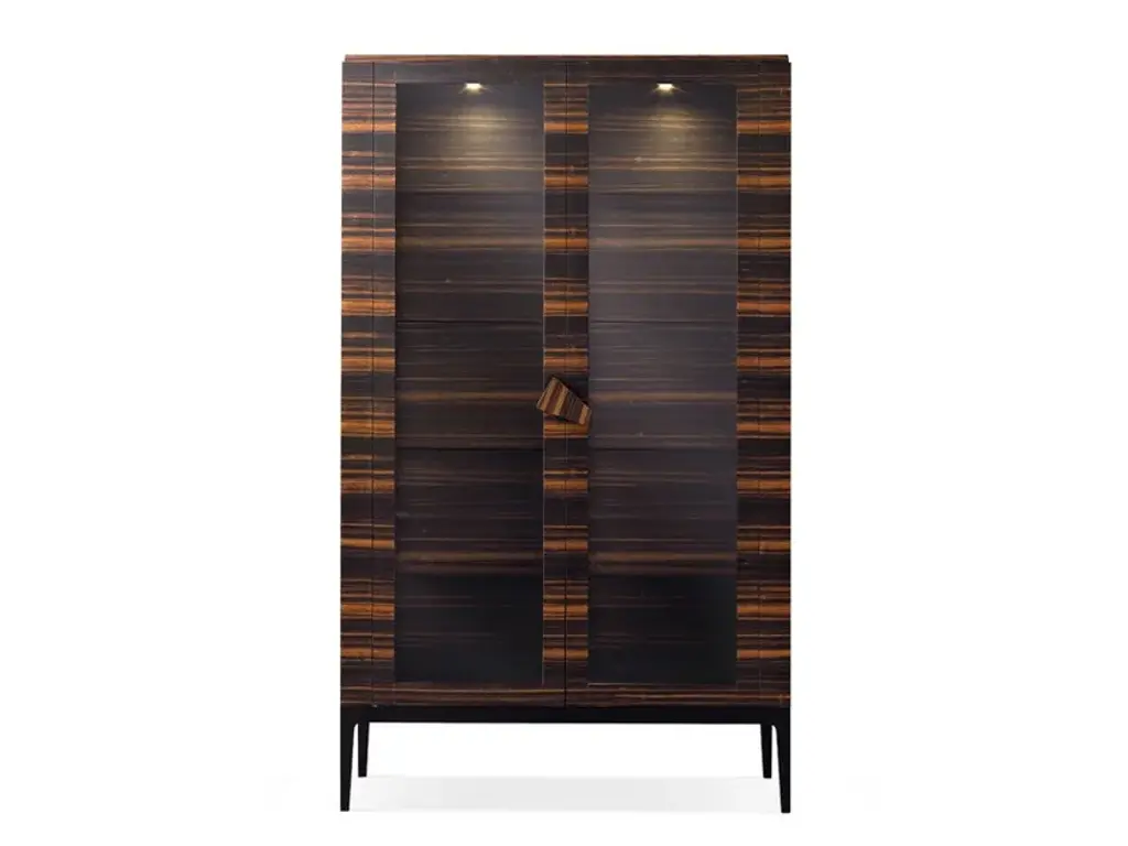2-door display cabinet with frame in multi-ply and solid tulipier with ebony veneer. The base frame is in lacquered solid tulipier. The interior is fitted with smoked glass shelves and lighting that uses LED spotlights with automatic on/off sensor. An interior-fitted drawer unit is also available on request.701702 02E - Showcase with 2 doors, made of blockboard with Macassar Ebony veneer, equipped with 4 smoked glass shelves. 20 gloss matte finish.701702 03E - Showcase with 2 doors, made of blockboard with Macassar Ebony veneer, equipped with 4 smoked glass shelves. Shiny finish 100 gloss.