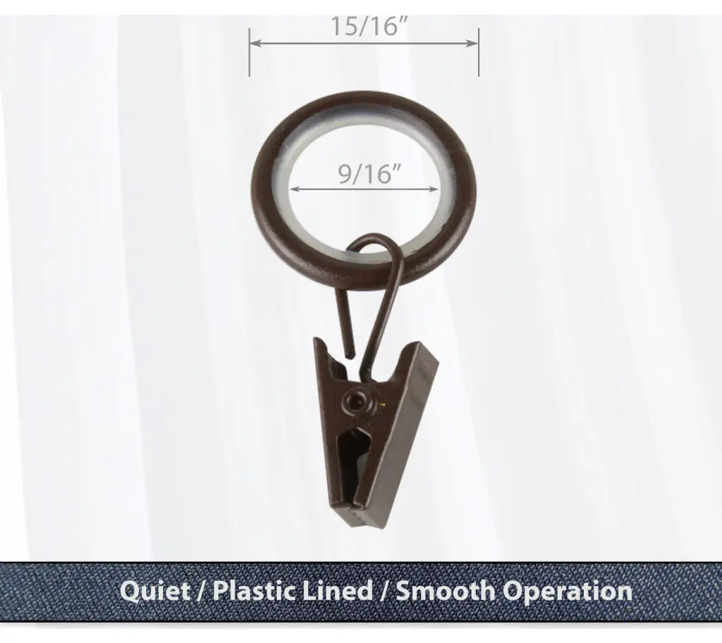 Enhance your window treatment with these high quality 5/8" Noise-Cancelling Curtain Rings with Clip. Combining elegance and durability, these rings will add a refining and lasting finish to your window treatment. Includes 10 Curtain Rings with Clips Ring inside diameter: 5/8" Available in 5 colors; White, Black, Antique Brass, Satin Nickel, or Cocoa