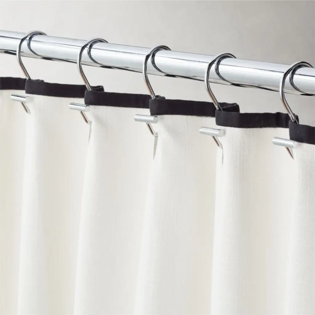 S-shaped shower rings glide across shower rods with ease. Made of iron with a smooth chrome finish, shower rings add a subtle yet beautiful accent to the bath. CB2 exclusive.