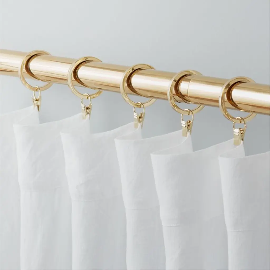 Mimic the high-end look of drapery rings even if your curtain panel doesn't have included hooks. Set of nine polished brass clip rings easily attach to curtain panels and slide back and forth along the rod. CB2 exclusive.