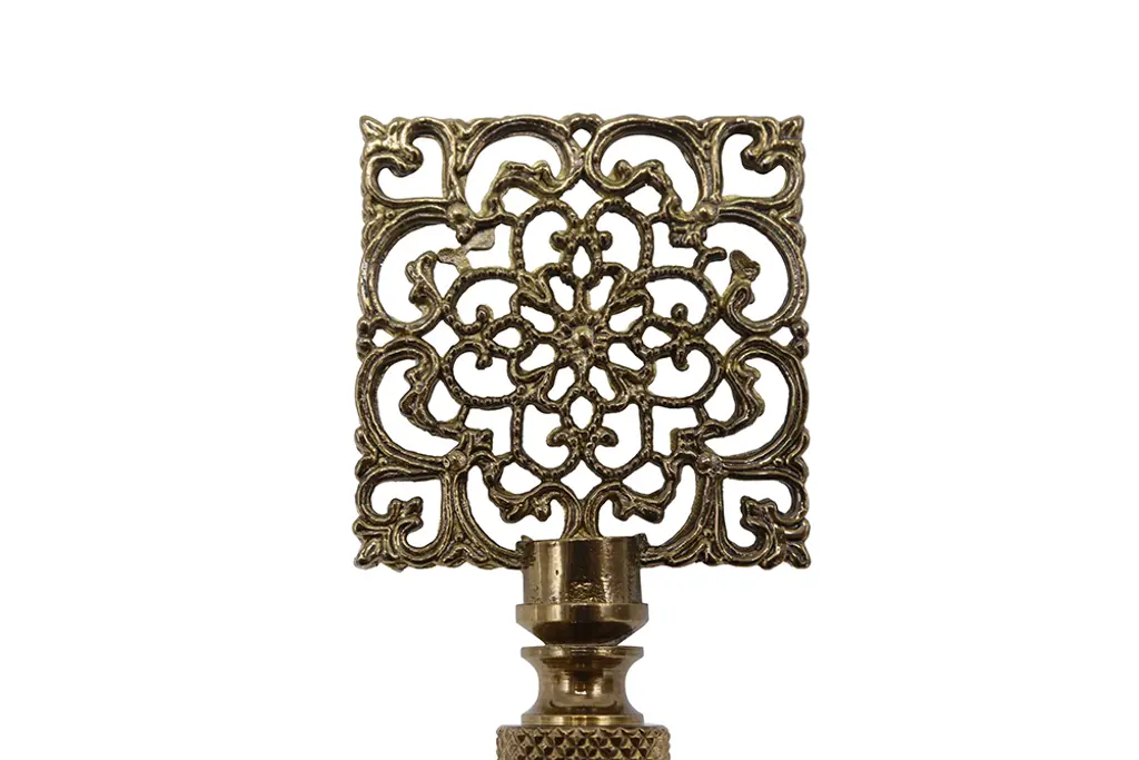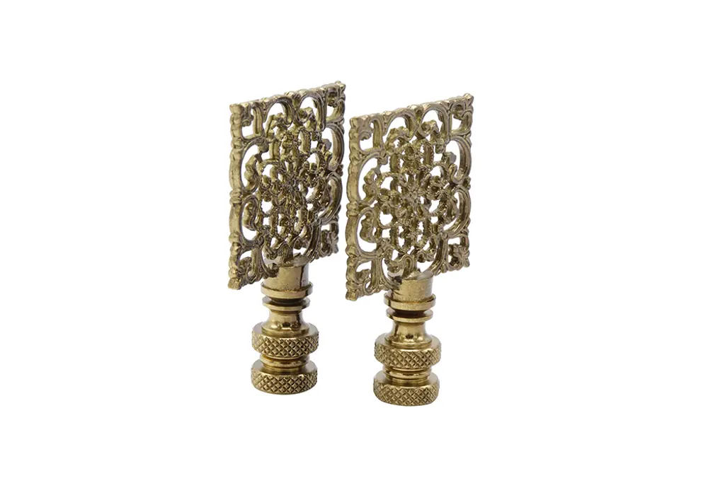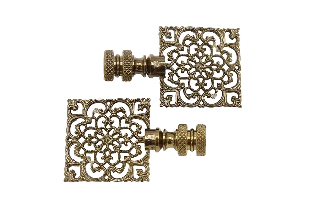 A pair of antiqued brass square filigree lamp finials. Fits a standard size lamp harp. Dimensions per finial.