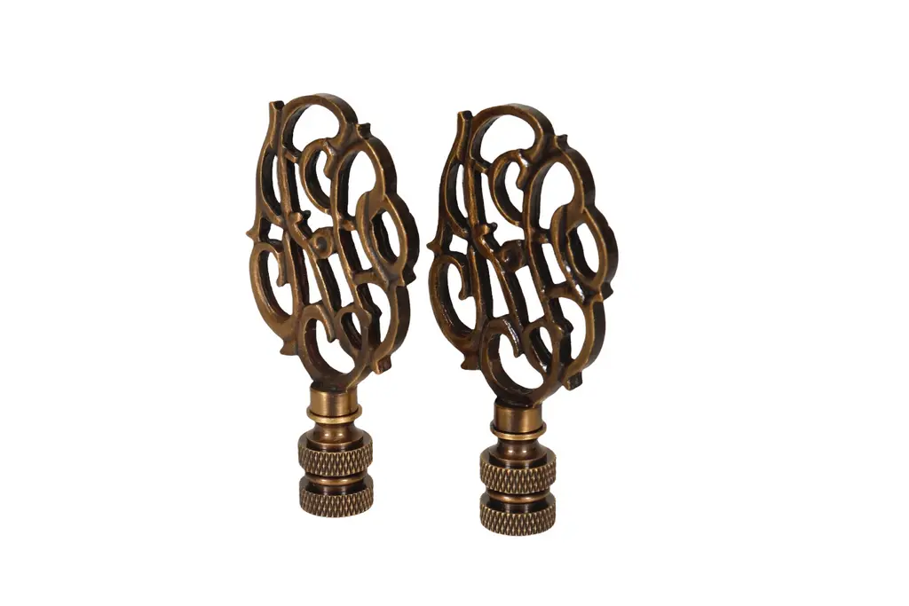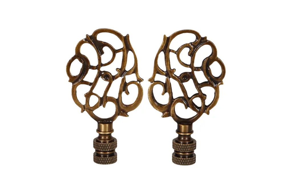 A pair of Art Nouveau style scrolled vine antiqued brass lamp finials. Fits a standard size lamp harp. Dimensions per finial.