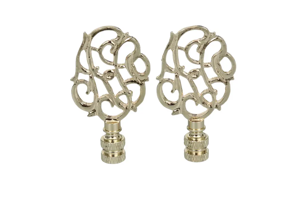 A pair of Art Nouveau style scrolled vine brass lamp finials. Fits a standard size lamp harp. Dimensions per finial.