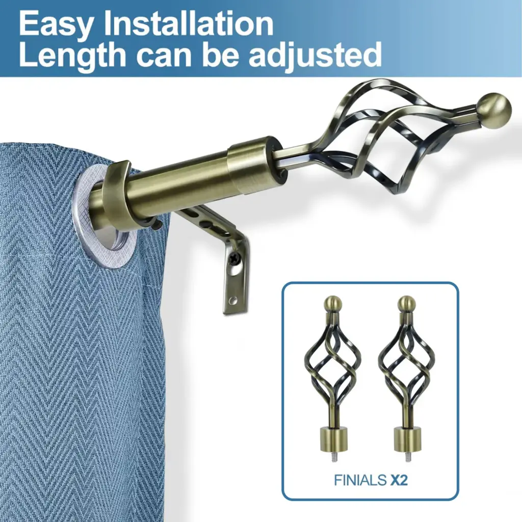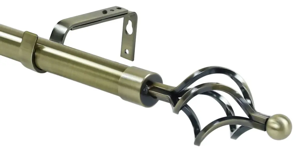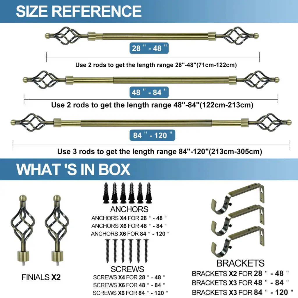 The rod set includes 1 rod, 1 set of two finials, and brackets in an antique brass finish.The adjustable curtain rod measures 1" diameter and comes with decorative metal finials. The finials measure 6" long and 2 1/2" wide. The rod extends from 84" to 120".Available in 5 finishes: Black, Glossy White, Bronze, Brushed Steel, and Antique BrassMounting hardware included for easy installation.
