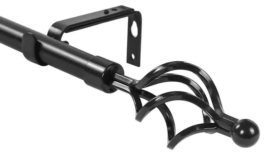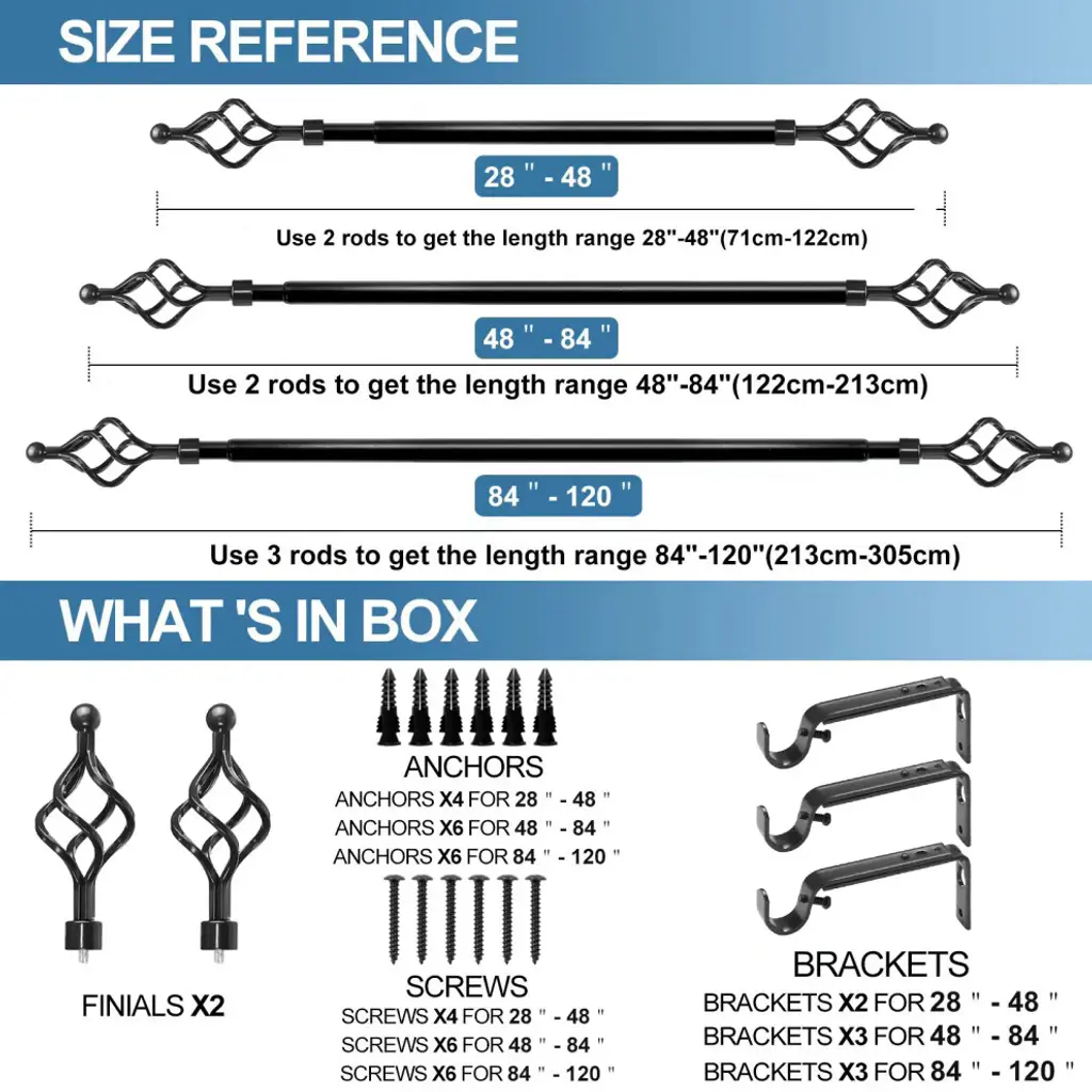 The rod set includes 1 rod, 1 set of two finials, and brackets in a black finish.The adjustable curtain rod measures 1" diameter and comes with decorative metal finials. The finials measure 6" long and 2 1/2" wide. The rod extends from 84" to 120".Available in 5 finishes: Black, Glossy White, Bronze, Brushed Steel, and Antique BrassMounting hardware included for easy installation.