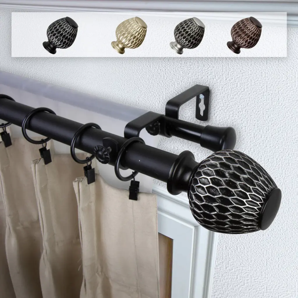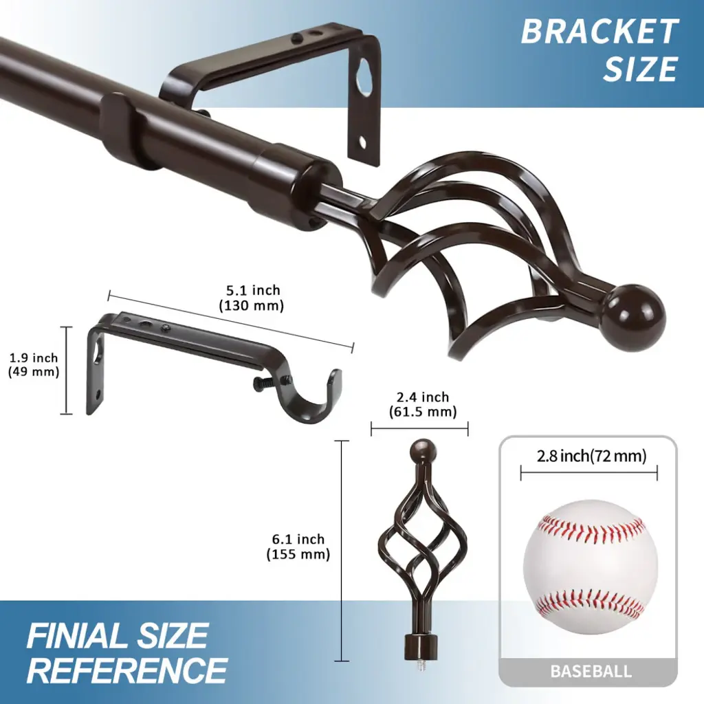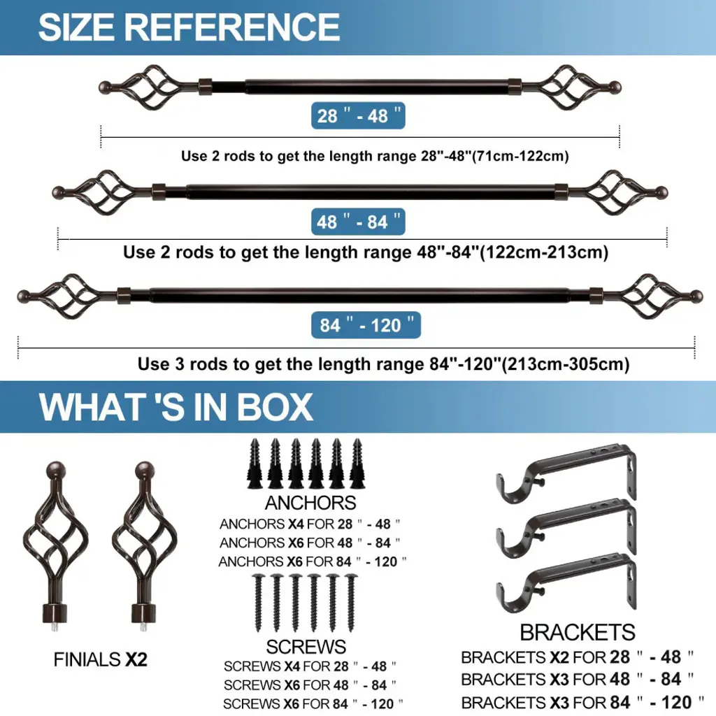 The rod set includes 1 rod, 1 set of two finials, and brackets in a bronze finish.The adjustable curtain rod measures 1" diameter and comes with decorative metal finials. The finials measure 6" long and 2 1/2" wide. The rod extends from 28" to 48".Available in 5 finishes: Black, Glossy White, Bronze, Brushed Steel, and Antique BrassMounting hardware included for easy installation.
