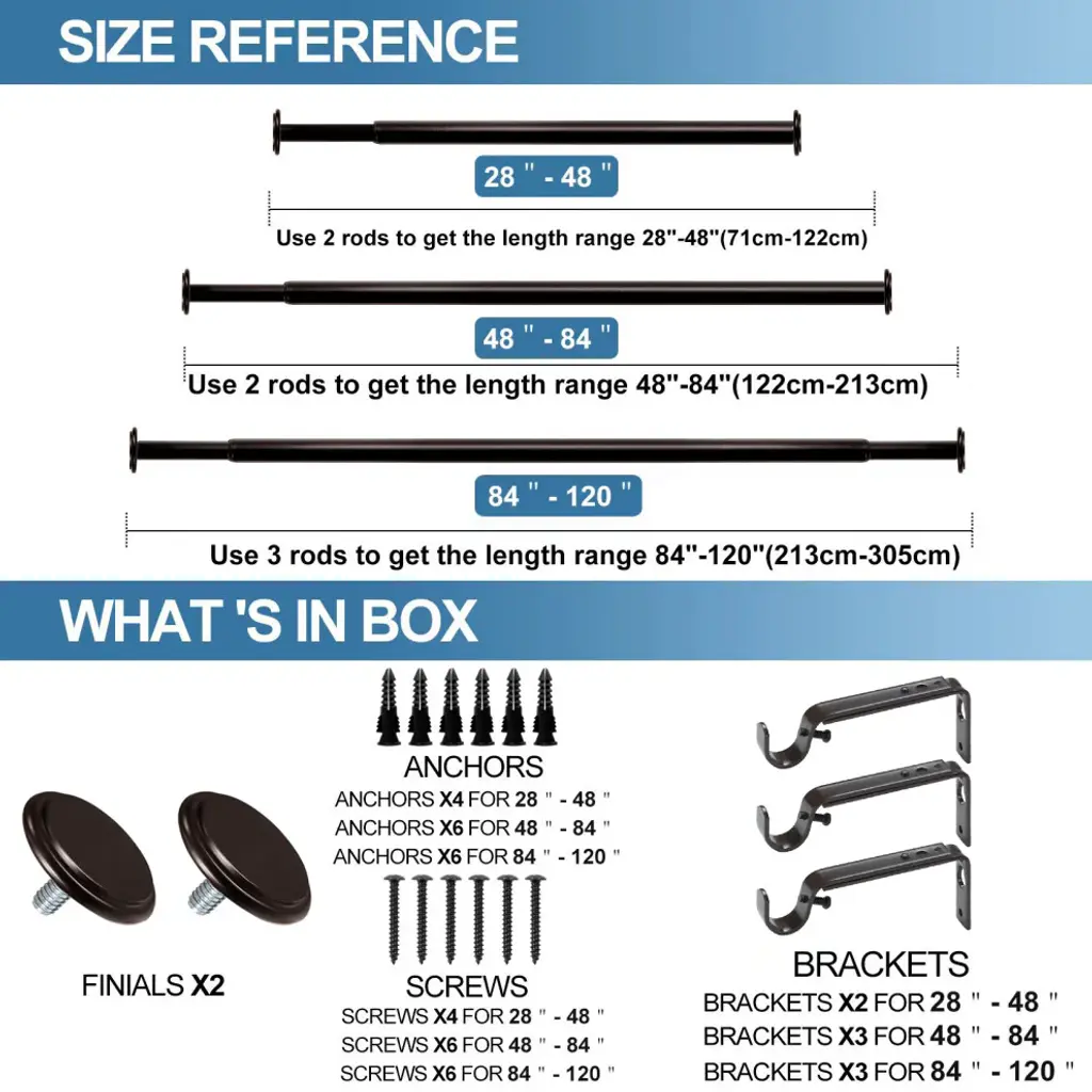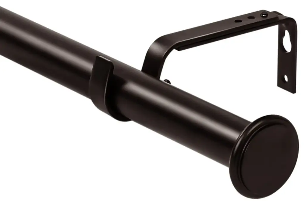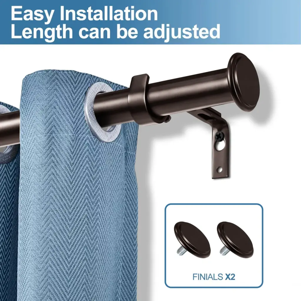 The rod set includes 1 rod, 1 set of two finials, and brackets in a bronze finish.The adjustable curtain rod measures 1" diameter and comes with round decorative finials. The finials measure 1 3/4" in diameter and are flush to the rod when installed. The rod extends from 84" to 120".Available in 5 finishes: Black, Glossy White, Bronze, Brushed Steel, and Antique BrassMounting hardware included for easy installation.