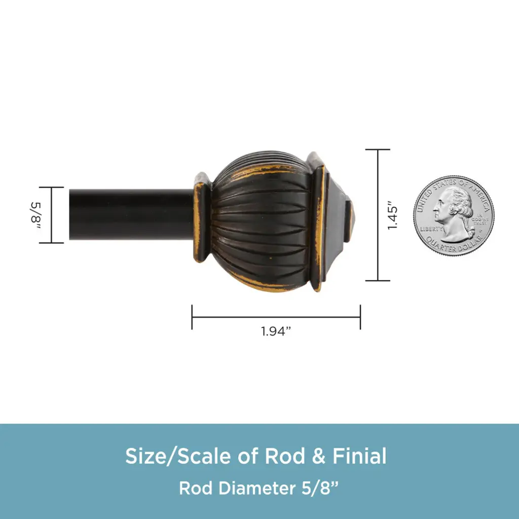 The rod set includes 1 rod, 1 set of two finials, and brackets in a renaissance gold finish.The adjustable curtain rod measures 1" diameter and comes with polyresin and acrylic finials. The finials measure 2 5/8" square and 2 5/8" long. The rod extends from 84" to 120".Available in 3 finishes: Renaissance Gold, Pewter, and Bronze.Mounting hardware included for easy installation.Adjustable brackets measure 5" to 6 3/4" long, 4 1/2" to center of bracket cup; 1 3/4" wall mount span. 2 brackets included with 28"-48"; 3 brackets included with 48"-84" and 84"-120" lengths.