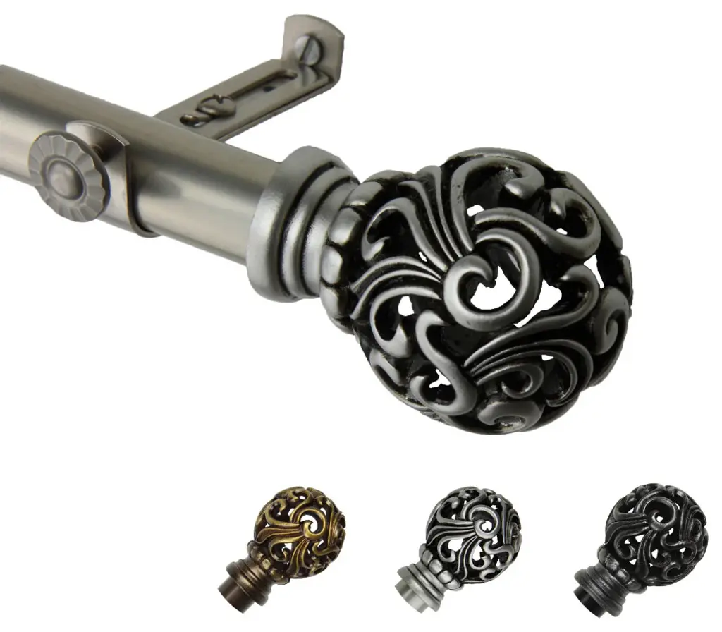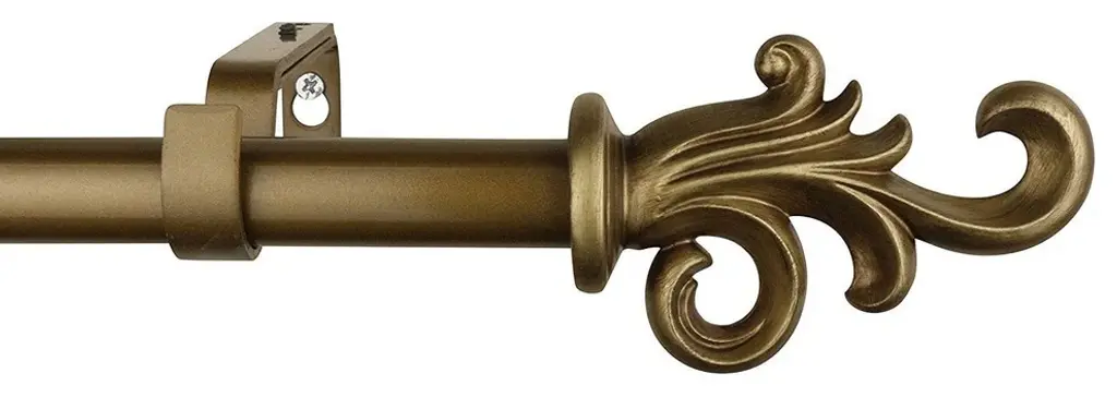 The rod set includes 1 rod, 1 set of two finials, and brackets in a pewter finish.The adjustable curtain rod measures 1" diameter and comes with decorative polyresin finials. The finials measure 4 1/8" long and 2 3/4" across. The rod extends from 84" to 120".Available in 4 finishes: Renaissance Gold, Burnt Gold, Pewter, and Gilded French White.Mounting hardware included for easy installation.Adjustable brackets measure 5" to 6 3/4" long, 4 1/2" to center of bracket cup; 1 3/4" wall mount span. 2 brackets included with 28"-48"; 3 brackets included with 48"-84" and 84"-120" lengths.