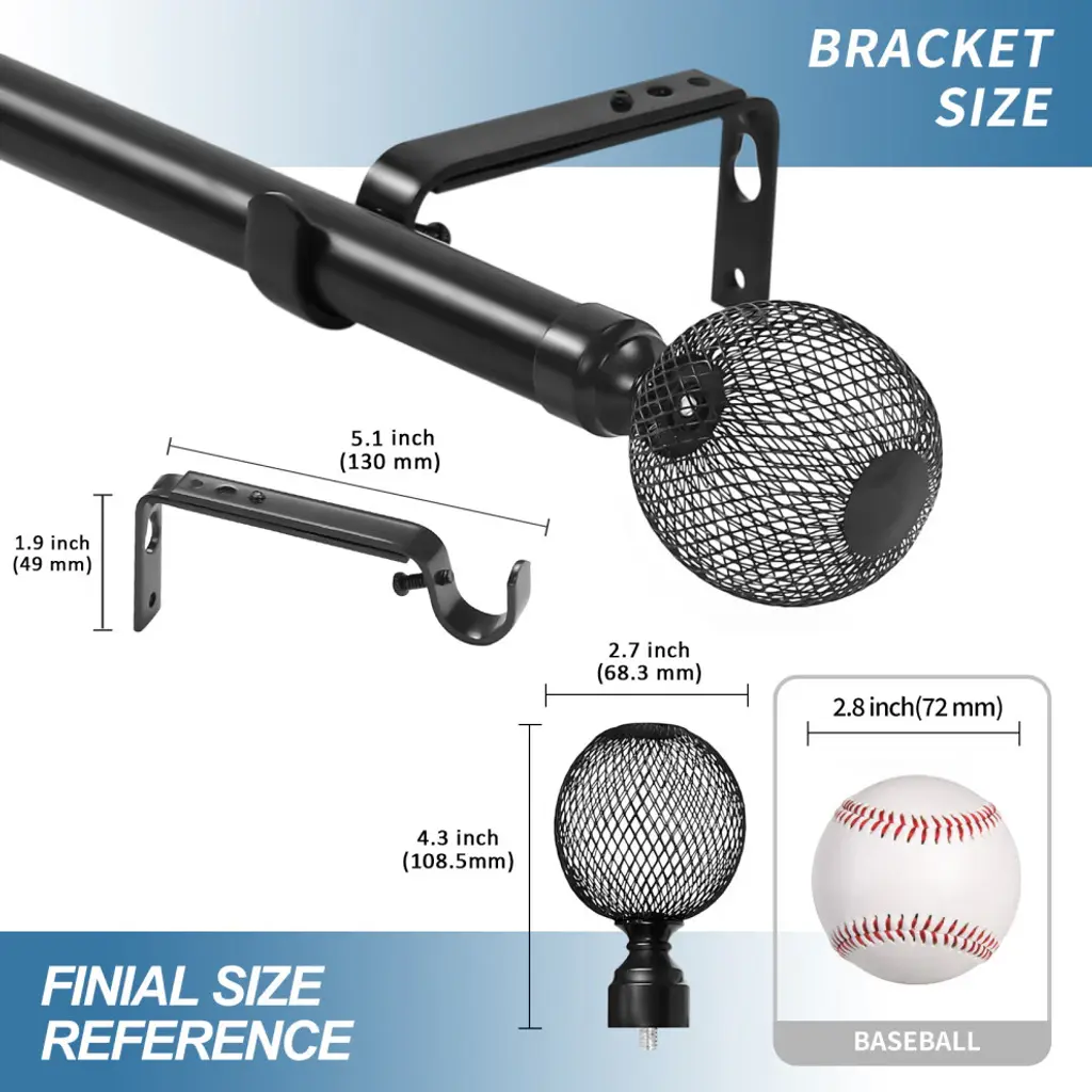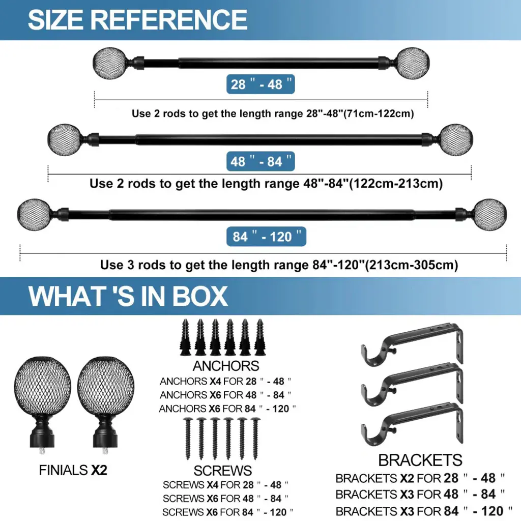 This rod set includes one rod, brackets, and one set of two finials in a black finish.This adjustable curtain rod has a black finish. Rod adjusts from 48" to 84".Round metal finial has a black finish and measures 4 1/8" long and 2 3/4" in diameter.Adjustable brackets measure 5" to 6 3/4" long, 4 1/2" to center of bracket cup; 1 3/4" wall mount span. 2 brackets included with 28"-48"; 3 brackets included with 48"-84" and 84"-120" lengths.Adjustable brackets measure 5" to 6 3/4" long, 4 1/2" to center of bracket cup; 1 3/4" wall mount span. 2 brackets included with 28"-48"; 3 brackets included with 48"-84" and 84"-120" lengths.
