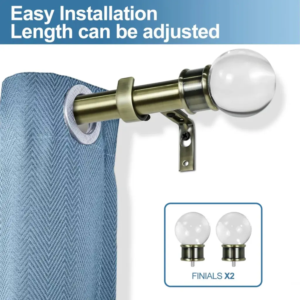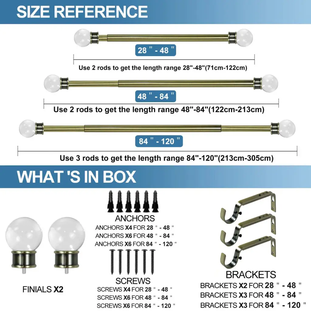 The rod set includes 1 rod, 1 set of two finials, and brackets in an antique brass finish.The adjustable curtain rod measures 1" diameter and comes with round decorative finials. The finials measure 3" long and 2" in diameter. The rod extends from 84" to 120".Available in 5 finishes: Black, Glossy White, Bronze, Brushed Steel, and Antique BrassMounting hardware included for easy installation.