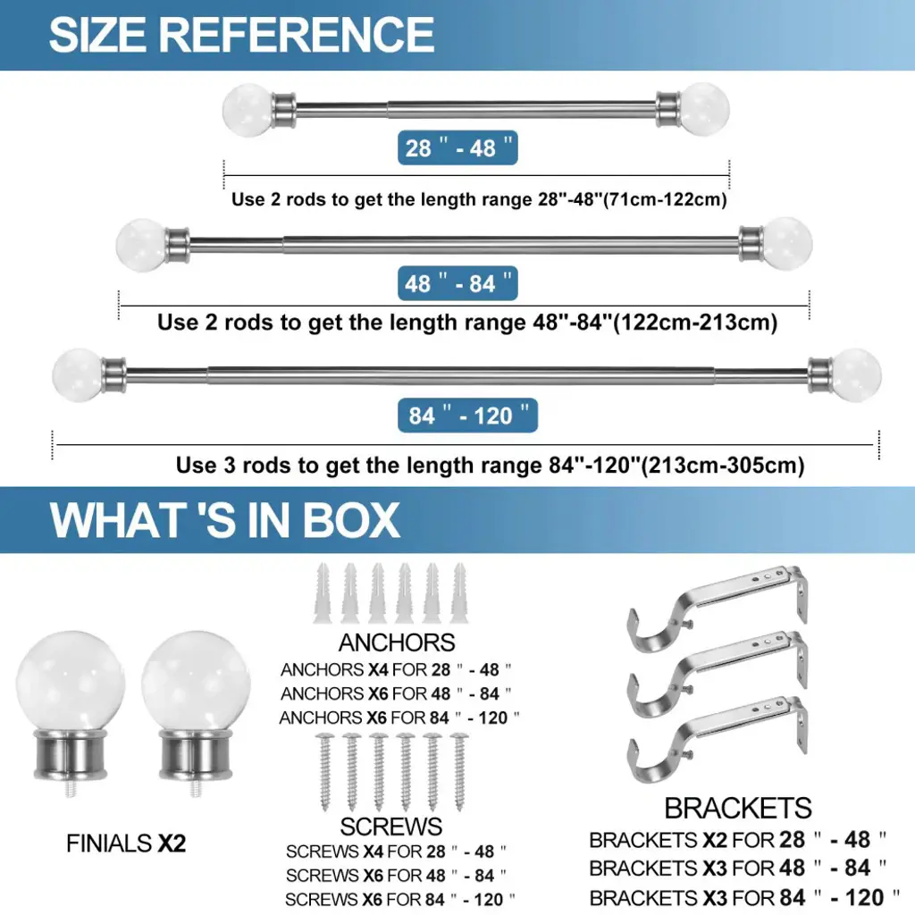 The rod set includes 1 rod, 1 set of two finials, and brackets in a brushed steel finish.The adjustable curtain rod measures 1" diameter and comes with round decorative finials. The finials measure 3" long and 2" in diameter. The rod extends from 28" to 48".Available in 5 finishes: Black, Glossy White, Bronze, Brushed Steel, and Antique BrassMounting hardware included for easy installation.
